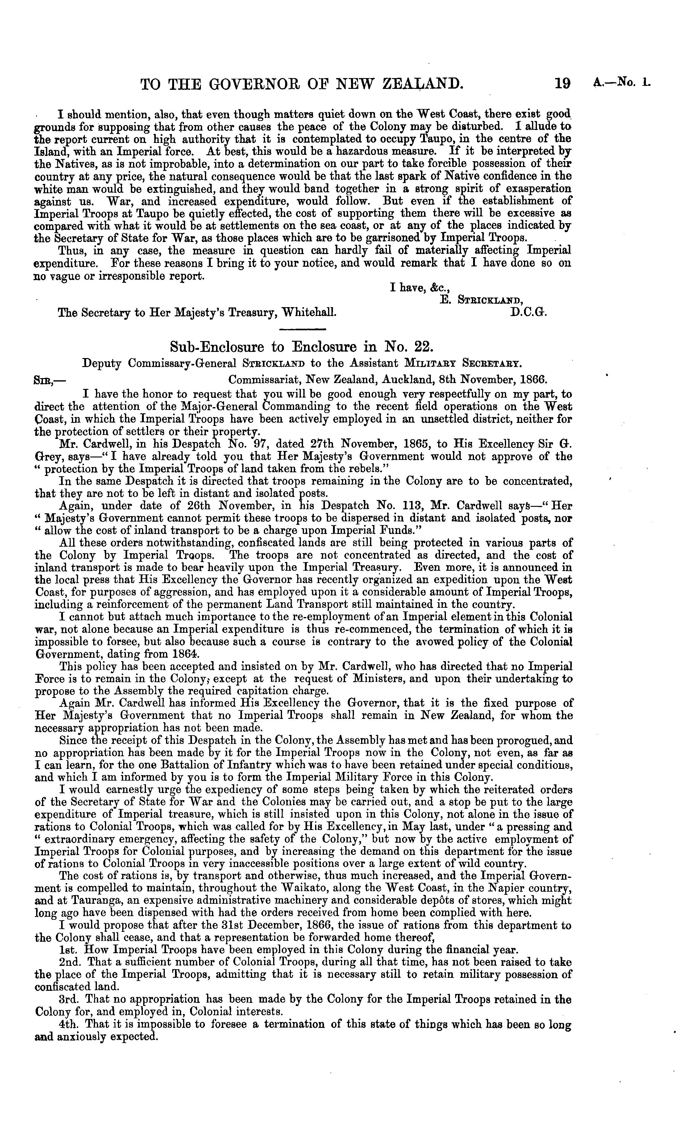 Sub-Enclosure to Enclosure in No. 22. Deputy Commissary-General Steickland to the Assistant Militaet Seceetaet. Sie, — Commissariat, New Zealand, Auckland, Bth November, 1866. I have the honor to request that you will be good enough very respectfully on my part, to direct the attention of the Major-General Commanding to the recent field operations on the West Coast, in which the Imperial Troops have been actively employed in an unsettled district, neither for the protection of settlers or their property. Mr. Cardwell, in his Despatch No. 97, dated 27th November, 1865, to His Excellency Sir G. Grey, says —" I have already told you that Her Majesty's Government would not approve of the " protection by the Imperial Troops of land taken from the rebels." In the same Despatch it is directed that troops remaining in the Colony are to be concentrated, that they are not to be left in distant and isolated posts. Again, under date of 26th November, in his Despatch No. 113, Mr. Cardwell sayS —" Her " Majesty's Government cannot permit these troops to be dispersed in distant and isolated posts, nor " allow the cost of inland transport to be a charge upon Imperial Funds." All these orders notwithstanding, confiscated lands are still being protected in various parts of the Colony by Imperial Troops. The troops are not concentrated as directed, and the cost of inland transport is made to bear heavily upon the Imperial Treasury. Even more, it is announced in the local press that His Excellency the Governor has recently organized an expedition upon the West Coast, for purposes of aggression, and has employed upon it a considerable amount of Imperial Troops, including a reinforcement of the permanent Land Transport still maintained in the country. I cannot but attach much importance to the re-employment of an Imperial element in this Colonial war, not alone because an Imperial expenditure is thus re-commenced, the termination of which it is impossible to forsee, but also because such a course is contrary to the avowed policy of the Colonial Government, dating from 1864. This policy has been accepted and insisted on by Mr. Cardwell, who has directed that no Imperial Force is to remain in the Colony,- except at the request of Ministers, and upon their undertaking to propose to the Assembly the required capitation charge. Again Mr. Cardwell has informed His Excellency the Governor, that it is the fixed purpose of Her Majesty's Government that no Imperial Troops shall remain in New Zealand, for whom the necessary appropriation has not been made. Since the receipt of this Despatch in the Colony, the Assembly has met and has been prorogued, and no appropriation has been made by it for the Imperial Troops now in the Colony, not even, as far as I can learn, for the one Battalion of Infantry which was to have been retained under special conditions, and which I am informed by you is to form the Imperial Military Force in this Colony. I would earnestly urge the expediency of some steps being taken by which the reiterated orders of the Secretary of State for War and the Colonies may be carried out, and a stop be put to the large expenditure of Imperial treasure, which is still insisted upon in this Colony, not alone in the issue of rations to Colonial Troops, which was called for by His Excellency,in May last, under "a pressing and " extraordinary emergency, affecting the safety of the Colony," but now by the active employment of Imperial Troops for Colonial purposes, and by increasing the demand on this department for the issue of rations to Colonial Troops in very inaccessible positions over a large extent of wild country. The cost of rations is, by transport and otherwise, thus much increased, and the Imperial Government is compelled to maintain, throughout the Waikato, along the West Coast, in tho Napier country, and at Tauranga, an expensive administrative machinery and considerable depots of stores, which might long ago have been dispensed with had the orders received from home been complied with here. I would propose that after the 31st December, 1866, the issue of rations from this department to the Colony shall cease, and that a representation be forwarded home thereof, Ist. How Imperial Troops have been employed in this Colony during the financial year. 2nd. That a sufficient number of Colonial Troops, during all that time, has not been raised to take the place of the Imperial Troops, admitting that it is necessary still to retain military possession of confiscated land. 3rd. That no appropriation has been made by the Colony for the Imperial Troops retained in the Colony for, and employed in, Colonial interests. 4th. That it is impossible to foresee a termination of this state of things which has been so long and anxiously expected.