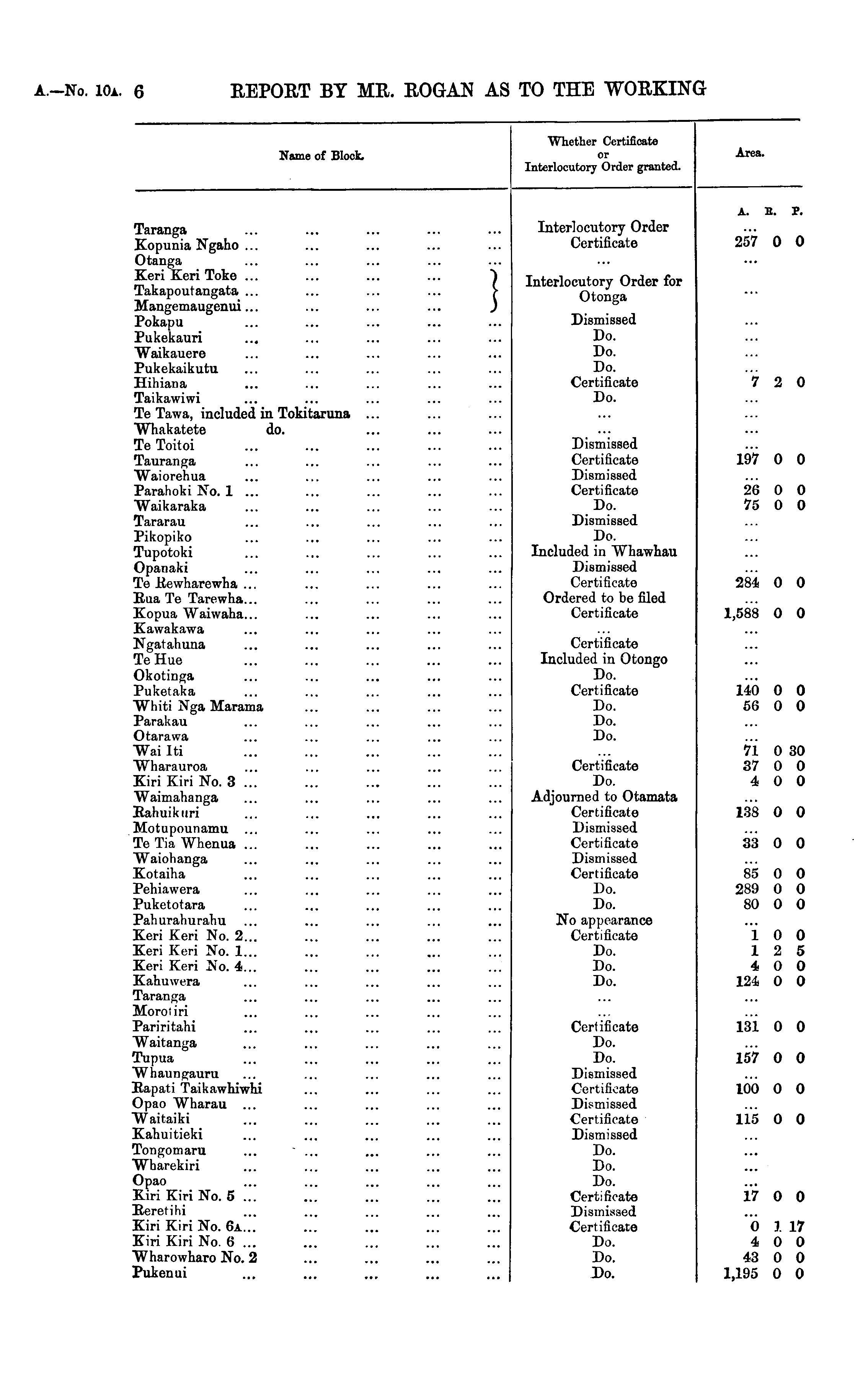 Whether Certificate Name of Block. or Interlocutory Order granted. Area. A. B. P. Taranga Kopunia Ngaho ... Otanga Keri Keri Toke ... Takapoutangata ... Mangemaugenui ... Pokapu Pukekauri Waikauere Pukekaikutu Hihiana Taikawiwi Te Tawa, included in Tokitaruna Whakatete do. Te Toitoi Tauranga "Waiorehua Parahoki No. 1 ... "Waikaraka Tararau Pikopiko Tupotoki Opanaki Te Rewharewha ... Rua Te Tarewha... Kopua Waiwaha... Kawakawa Ngatahuna TeHue Okotinga Puketaka "Whiti Nga Marama Parakau Otarawa Wailti Wharauroa Kiri Kiri No. 3 ... Waimahanga Rahuikuri Motupounamu ... TeTia Whenua ... "Waiohanga Kotaiha Pehiawera Puketotara Pahurahurahu Keri Keri No. 2... Keri Keri No. 1... Keri Keri No. 4... Kahuwera Taranga Moroiiri Pariritahi ~Waitanj;a Tupua Whaungauru Rapati Taikawhiwhi Opao Wharau ... AVaitaiki Kahuitieki Tongomaru ... ' ... Wharekiri Opao Kiri Kiri No. 5 ... Reretihi Kiri Kiri No. 6a... Kiri Kiri No. 6 ... "Wharowharo No. 2 Pukenui I Interlocutory Order Certificate 257 0 0 Interlocutory Order for Otonga Dismissed Do. Do. Do. Certificate Do. "i 2 0 Dismissed Certificate Dismissed Certificate Do. Dismissed Do. Included in Whawhau Dismissed Certificate Ordered to be filed Certificate 197 26 75 0 0 0 0 0 0 284 0 0 1,588 0 0 Certificate Included in Otongo Do. Certificate Do. Do. Do. 140 56 0 0 0 0 Certificate Do. Adjourned to Otamata Certificate Dismissed Certificate Dismissed Certificate Do. Do. 71 37 4 0 30 0 0 0 0 138 0 0 33 0 0 85 289 80 0 0 0 0 0 0 No appearance Certificate Do. Do. Do. 1 1 4 124 0 0 2 5 O 0 0 0 Certificate Do. Do. Dismissed Certificate Dismissed Certificate Dismissed Do. Do. Do. Certificate Dismissed Certificate Do. Do. Do. 131 157 100 115 0 0 0 0 0 0 0 0 17 0 0 0 4 43 1,195 1 17 0 0 0 0 0 0