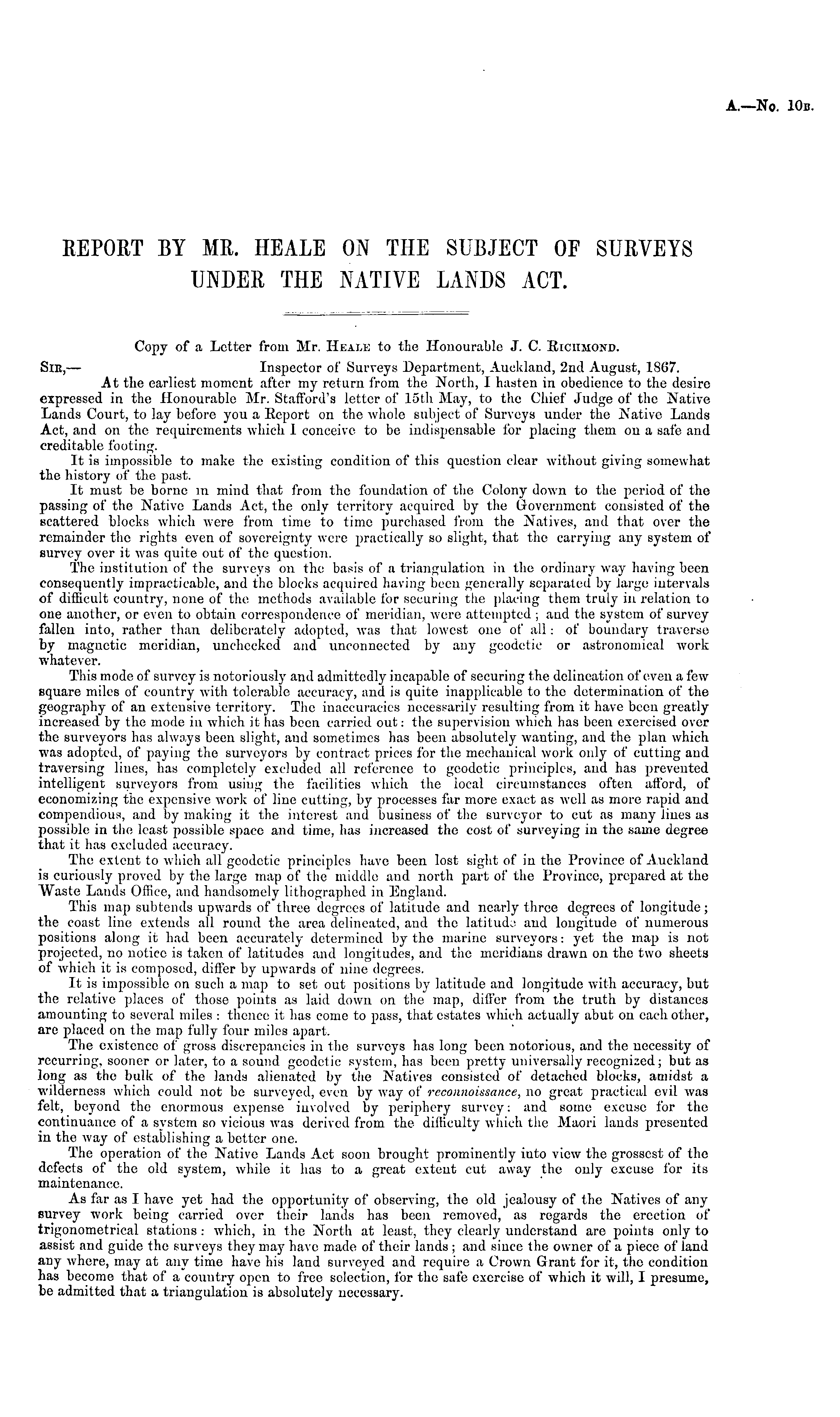 Copy of a Letter from Mr. Heale to the Honourable J. C. Richmond. Sib, — Inspector of Surveys Department, Auckland, 2nd August, 1867. At the earliest moment after my return from the North, I hasten in obedience to the desire expressed in the Honourable Mr. Stafford's letter of 15th May, to the Chief Judge of the Native Lands Court, to lay before you a Report on the whole subject of Surveys under the Native Lands Act, and on the requirements which I conceive to be indispensable for placing them on a safe and creditable footing. It is impossible to make the existing condition of this question clear without giving somewhat the history of the past. It must be borne m mind that from the foundation of the Colony down to the period of the passing of the Native Lands Act, the only territory acquired by the Government consisted of the scattered blocks which were from time to time purchased from the Natives, and that over the remainder the rights even of sovereignty were practically so slight, that the carrying any system of survey over it was quite out of the question. The institution of the surveys on the basis of a triangulation in the ordinary way having been consequently impracticable, and the blocks acquired having been generally separated by large intervals of difficult country, none of the methods available for securing the placing them truly in relation to one another, or even to obtain correspondence of meridian, were attempted; and the system of survey fallen into, rather than deliberately adopted, was that lowest one of all: of boundary traverse by magnetic meridian, unchecked and unconnected by any geodetic or astronomical work whatever. This mode of survey is notoriously and admittedly incapable of securing the delineation of even a few square miles of country with tolerable accuracy, and is quite inapplicable to the determination of the geography of an extensive territory. The inaccuracies necessarily resulting from it have been greatly increased by the mode in which it has been carried out: the supervision which has been exercised over the surveyors has always been slight, and sometimes has been absolutely wanting, and the plan which was adopted, of paying the surveyors by contract prices for the mechanical work only of cutting and traversing lines, has completely excluded all reference to geodetic principles, and has prevented intelligent surveyors from using the facilities which the local circumstances often afford, of economizing the expensive work of line cutting, by processes far more exact as well as more rapid and compendious, and by making it the interest and business of the surveyor to cut as many lines as possible in the least possible space and time, has increased the cost of surveying in the same degree that it has excluded accuracy. The extent to which all geodetic principles have been lost sight of in the Province of Auckland is curiously proved by the large map of the middle and north part of the Province, prepared at the Waste Lauds Office, and handsomely lithographed in England. This map subtends upwards of three degrees of latitude and nearly three degrees of longitude; the coast line extends all round the area delineated, and the latitude and longitude of numerous positions along it had been accurately determined by the marine surveyors: yet the map is not projected, no notice is taken of latitudes and longitudes, and the meridians drawn on the two sheets of which it is composed, differ by upwards of nine degrees. It is impossible on such a map to set out positions by latitude and longitude with accuracy, but the relative places of those points as laid down on the map, differ from the truth by distances amounting to several miles : thence it has come to pass, that estates which actually abut on each other, are placed on the map fully four miles apart. The existence of gross discrepancies in the surveys has long been notorious, and the necessity of recurring, sooner or later, to a sound geodetic system, has been pretty universally recognized; but as long as the bulk of the lands alienated by the Natives consisted of detached blocks, amidst a wilderness which could not be surveyed, even by way of reconnoissance, no great practical evil was felt, beyond the enormous expense involved by periphery survey: and some excuse for the continuance of a system so vicious was derived from the difficulty which the Maori lands presented in the way of establishing a better one. The operation of the Native Lands Act soon brought prominently into view the grossest of the defects of the old system, while it has to a great extent cut away the only excuse for its maintenance. As far as I have yet had the opportunity of observing, the old jealousy of the Natives of any survey work being carried over their lands has been removed, as regards the erection of trigonometrical stations : which, in the North at least, they clearly understand are points only to assist and guide the surveys they may have made of their lands ; and since the owner of a piece of land any where, may at any time have his land surveyed and require a Crown Grant for it, the condition has become that of a country open to free selection, for the safe exercise of which it will, I presume, be admitted that a triangulation is absolutely necessary.