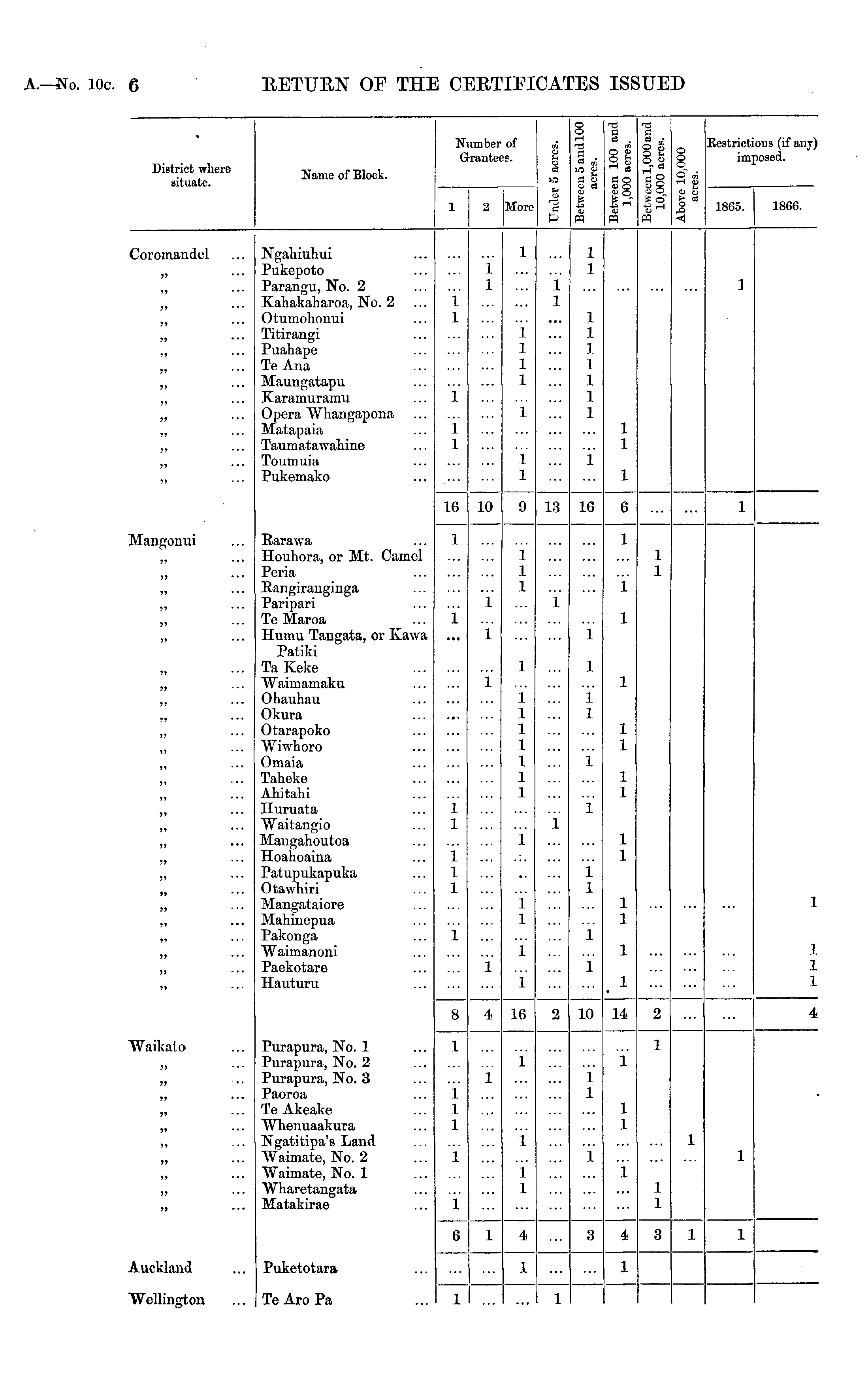 District where situate. Name of Block. Number of Grantees. CO O c5 ua i-H -3 S i S ■ o o fl O IS II ! 0 O 1 o" O" m Kestrictions (if any) imposed. 1 2 More 1865. 1866. Coromandel Ngahiuliui Pukepoto Parangu, No. 2 Kahakaharoa, No. 2 Otumohonui Titirangi Puahape TeAna Maungatapu Karamuraimi Opera "Whangapona Matapaia Taumatawaliine Toumuia Pukemako 1 1 1 » 1 1 1 1 ?» 1 1 >> 1 1 1 1 1 1 1 ?r w ;» 1 1 1 1 >> JT 1 J* 1 >> )? i i 1 1 >? >> 1 1 i 1 ft 16 10 9 13 If! Mangonui J> >» J) r> j> )» ?» J» )* ?» )? »» Barawa Houhora, or Mt. Camel Peria Bangirangingo Paripari To Maroa Humu Tangata, or Kawa Patiki TaKeke Waimamaku Ohauhau Okura Otarapoko Wiwhoro Omaia Taheke Ahitalii Huruata "Waitangio Maugahoutoa IToa-hoaina Patupukapuka Otawhiri Mangataiore Mahinepna Pakonga Waimanoni Packotare Hauturu 1 1 1 1 i 1 1 1 1 1 1 1 1 1 1 1 1 i l i l l l i l 1 1 1 1 1 I >» 7> JJ 1 1 1 i »t 1 1 1 )» )» 1 1 1 1 1 » >> >> i l 1 1 ?» 1 l i )) 1 5> )» l i i I 1 1 1 »» Purapura, No. 1 Purapura, No. 2 Purapura, No. 3 Paoroa TeAkeake TVhenuaakura Ngatitipa's Land Waimate, No. 2 Waimate, No. 1 Wharetangata Matakirae 8 4 16 2 in M Waikato 1 1 1 >> 1 1 1 »» )» 1 1 1 1 1 » )» 1 1 )» 1 1 1 i 1 »> i» 1 1 jj i »» Puketotara 6 1 4 Auckland 1 "Wellington TeAroPa I 1 1 I I 1