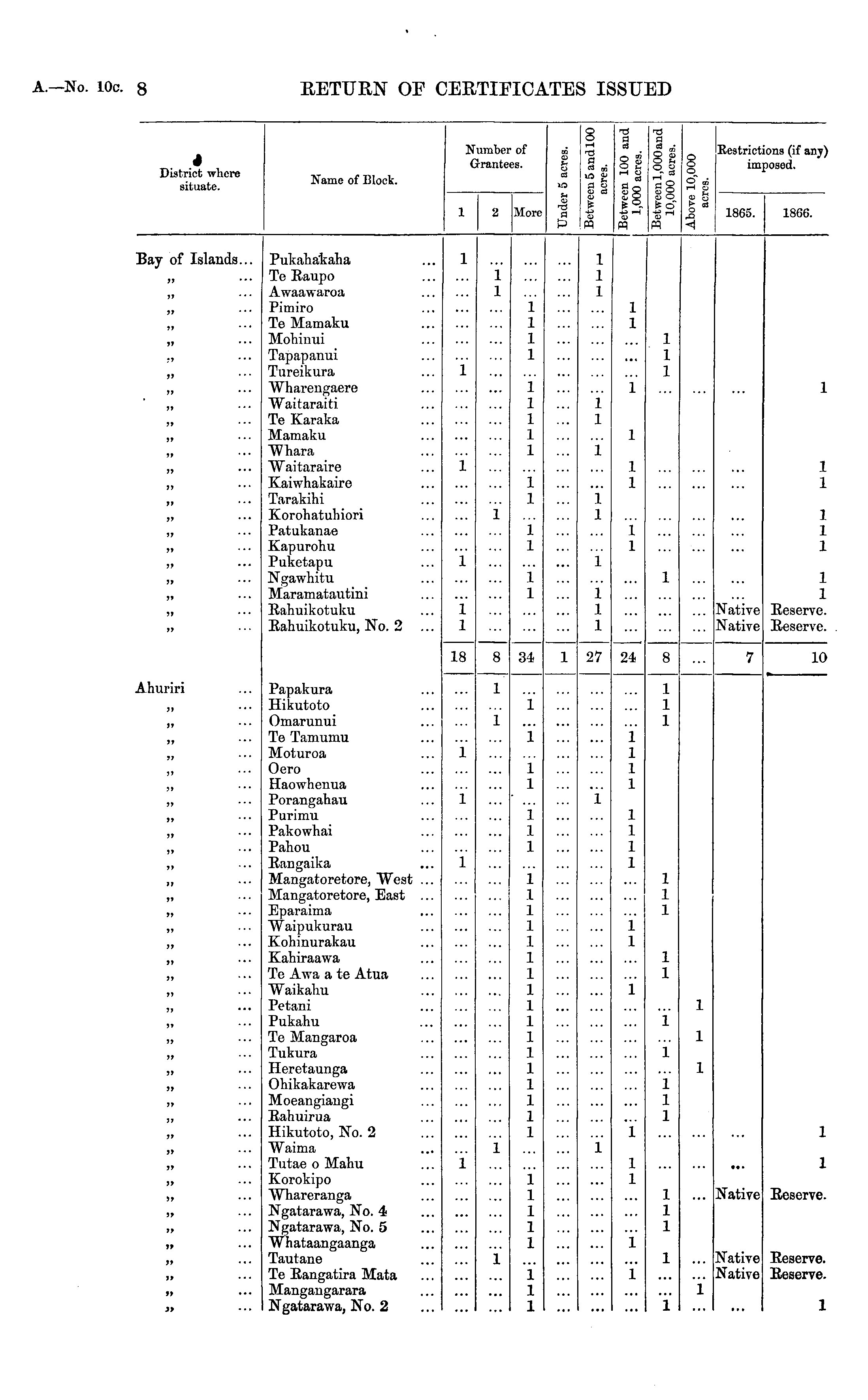 4 District wlicre situate. Xame of Block. Number of Grantees. 8 I \% . O I « OO o a 8 | I" fi IS P pq a ii p i • 8 s o § o O fco~ o 8 o :| Restrictions (if any) imposed. 1 2 More 1865. 1866. Bay of Islands... Pukahafcaha Te Raupo Awaawaroa Pimiro Te Mamaku Mohinui Tapapanui Tureikura Wharengaere Waitaraiti Te Karaka Mamaku "W hara "Waitaraire Kaiwhakairo Tarakihi Koroliatuliiori Patukanae Kapurohu Puketapu Ngawhitu Maramatautini Rahuikotuku. Rahuikotuku, No. 2 ... 1 1 1 1 1 1 a ,, >T j, ... 1 1 1 1 1 1 It 1 1 1 i )» )l " " • 1 1 1 1 1 1 1 I 1 it it It l 1 1 1 I 1 1 IJ 1 1 )» ... 1 1 tt ' * ' 1 1 1 1 „ 1 1 1 1 ft J» i 1 it * • • 1 1 1 1 1 ,, 1 1 1 >» i Native Native )» • • • Reserve. Reserve. >> ... Ahuriri 18 8 34 1 •27 24 10 j» ... >» „ j, j» >» • • • tt a ■ • • ,, ,, »» a >» >» ,, ii >» ■ • • >» n Papakura Hikutoto Omarunui Te Tamumu Moturoa Oero Haowhenua Porangahau Purimu Pakowhai Pahou Rangaika Mangatoretore, "West ... Mangatoretore, East ... Eparaima Waipukurau Kohinurakau Kahiraawa Te Awa a te Atua Waikahu Petani Pukahu Te Mangaroa Tukura Heretaunga Ohikakarewa Moeangiaugi Rahuirua Hikutoto, No. 2 Waima Tutae o Mahu Korokipo Whareranga Ngatarawa, No. 4 Ngatarawa, No. 5 Whataangaanga Tautane Te Rangatira Mata Mangangarara Ngatarawa, No. 2 1 1 1 1 1 1 1 1 1 1 1 1 1 1 1 1 1 1 1 1 1 1 1 1 1 1 1 1 1 1 1 1 1 1 1 1 1 1 1 1 i 1 1 I. 1 1 1 1 1 i» ••■ 1 1 >t • • • 1 )> i it • • • 1 a 1 1 1 ii ii ii ... H 1 1 i 1 n 1 l i 1 ii 1 1 1 1 1 it 1 1 1 Native Keserve. it it ... ii it i Reserve. Eeserve. it 1 1 1 1 i 1 Native Native it 1 n i' 1 i>