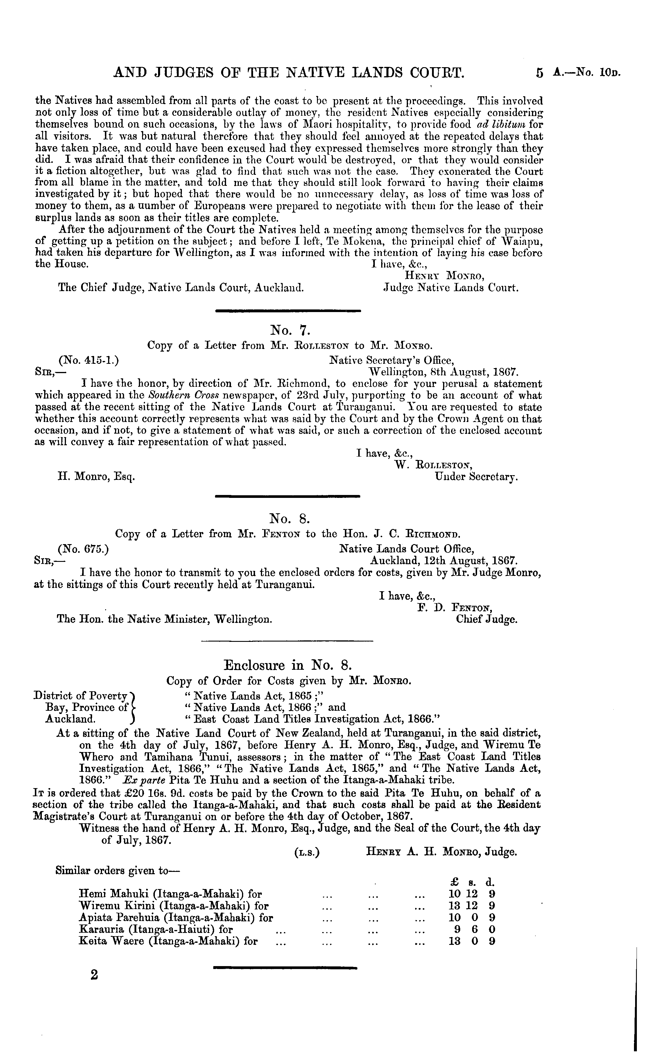No. 8. Copy of a Letter from Mr. Fenton to the Hon. J. C. Richmond. (No. 675.) Native Lands Court Office, Sib,— Auckland, 12th August, 1867. I have tho honor to transmit to you the enclosed orders for costs, given by Mr. Judge Monro, at the sittings of this Court recently held at Turanganui. I have, Ac, F. D. Fenton, The Hon. the Native Minister, Wellington. Chief Judge.