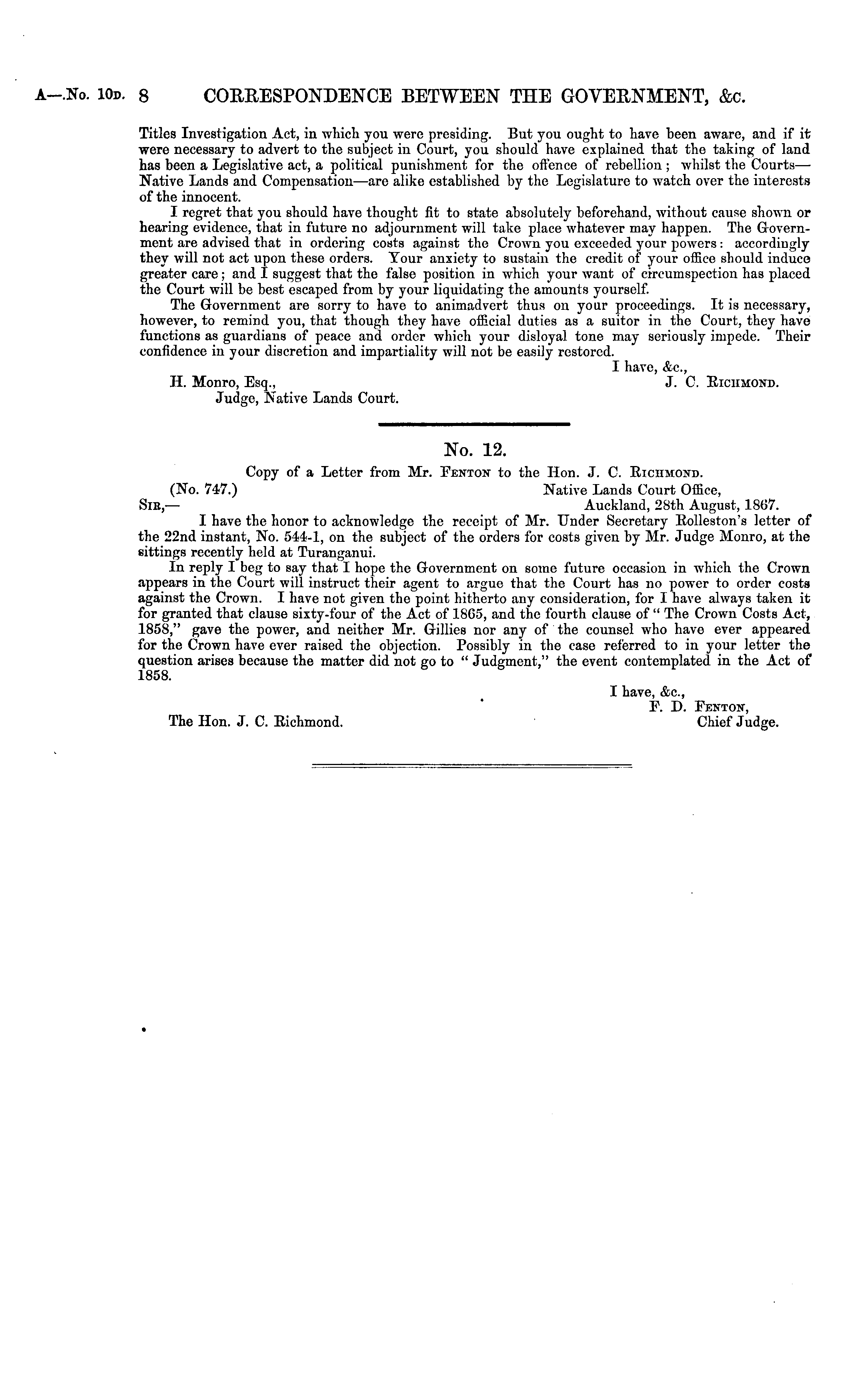 Titles Investigation Act, in which you were presiding. But you ought to have been aware, and if it were necessary to advert to the subject in Court, you should have explained that the taking of land has been a Legislative act, a political punishment for the offence of rebellion ; whilst the Courts — Native Lands and Compensation—arc alike established by the Legislature to watch over the interests of the innocent. I regret that you should have thought fit to state absolutely beforehand, without cause shown or hearing evidence, that in future no adjournment will take place whatever may happen. The Government are advised that in ordering costs against the Crown you exceeded your powers : accordingly they will not act upon these orders. Your anxiety to sustain the credit of your office should induce greater care; and I suggest that the false position in which your want of circumspection has placed the Court will be best escaped from by your liquidating the amounts yourself. The Government are sorry to have to animadvert thus on your proceedings. It is necessary, however, to remind you, that though they have official duties as a suitor in the Court, they have functions as guardians of peace and order which your disloyal tone may seriously impede. Their confidence in your discretion and impartiality will not be easily restored. I have, Ac, H. Monro, Esq., J. C. Richmond. Judge, Native Lands Court.