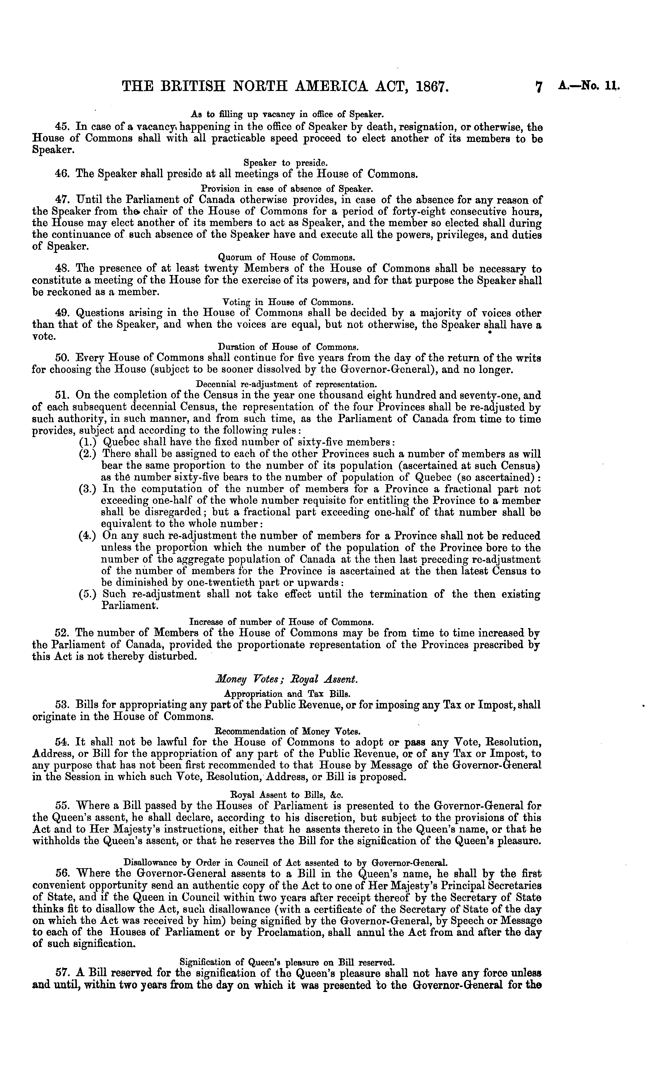 As to filling up vacancy in office of Speaker. 45. In case of a vacancy, happening in the office of Speaker by death, resignation, or otherwise, the House of Commons shall with all practicable speed proceed to elect another of its members to bo Speaker. Speaker to preside. 46. The Speaker shall preside at all meetings of the House of Commons. Provision in case of absence of Speaker. 47. Until the Parliament of Canada otherwise provides, in case of the absence for any reason of the Speaker from the- chair of the House of Commons for a period of forty-eight consecutive hours, the House may elect another of its members to act as Speaker, and the member so elected shall during the continuance of such absence of the Speaker have and execute all the powers, privileges, and duties of Speaker. Quorum of House of Commons. 48. The presence of at least twenty Members of the House of Commons shall be necessary to constitute a meeting of the House for the exercise of its powers, and for that purpose the Speaker shall be reckoned as a member. Voting in House of Commons. 49. Questions arising in the House of Commons shall be decided by a majority of voices other than that of the Speaker, and when the voices are equal, but not otherwise, the Speaker shall have a vote. Duration of House of Commons. 50. Every House of Commons shall continue for five years from the day of the return of the writs for choosing the House (subject to be sooner dissolved by the Governor-General), and no longer. Decennial re-adjustment of representation. 51. On the completion of the Census in the year one thousand eight hundred and seventy-one, and of each subsequent decennial Census, the representation of the four Provinces shall be re-adjusted by such authority, in such manner, and from such time, as the Parliament of Canada from time to time provides, subject and according to the following rules: (1.) Quebec shall have the fixed number of sixty-five members: (2.) There shall be assigned to each of the other Provinces such a number of members as will bear the same proportion to the number of its population (ascertained at such Census) as the number sixty-five bears to the number of population of Quebec (so ascertained) : (3.) In the computation of the number of members for a Province a fractional part not exceeding one-half of the whole number requisite for entitling the Province to a member shall be disregarded; but a fractional part exceeding one-half of that number shall be equivalent to the whole number: (4.) On any such re-adjustment the number of members for a Province shall not be reduced unless the proportion which the number of the population of the Province bore to the number of the aggregate population of Canada at the then last preceding re-adjustment of the number of members for the Province is ascertained at the then latest Census to be diminished by one-twentieth part or upwards : (5.) Such re-adjustment shall not take effect until the termination of the then existing Parliament. Increase of number of House of Commons. 52. The number of Members of the House of Commons may be from time to time increased by the Parliament of Canada, provided the proportionate representation of the Provinces prescribed by this Act is not thereby disturbed. Money Votes; Royal Assent. Appropriation and Tax Bills. 53. Bills for appropriating any part of the Public Revenue, or for imposing any Tax or Impost, shall originate in the House of Commons. Eecommendation of Money Votes. 54. It shall not be lawful for the House of Commons to adopt or pass any Vote, Resolution, Address, or Bill for the appropriation of any part of the Public Revenue, or of any Tax or Impost, to any purpose that has not been first recommended to that House by Message of the Governor-General in the Session in which such Vote, Resolution, Address, or Bill is proposed. Royal Assent to Bills, &c. 55. Where a Bill passed by the Houses of Parliament is presented to the Governor-General for the Queen's assent, he shall declare, according to his discretion, but subject to the provisions of this Act and to Her Majesty's instructions, either that he assents thereto in the Queen's name, or that he withholds the Queen's assent, or that he reserves the Bill for the signification of the Queen's pleasure. Disallowance by Order in Council of Act assented to by Governor-General. 56. Where the Governor-General assents to a Bill in the Queen's name, he shall by the first convenient opportunity send an authentic copy of the Act to one of Her Majesty's Principal Secretaries of State, and if the Queen in Council within two years after receipt thereof by the Secretary of State thinks fit to disallow the Act, such disallowance (with a certificate of the Secretary of State of the day on which the Act was received by him) being signified by the Governor-General, by Speech or Message to each of the Houses of Parliament or by Proclamation, shall annul the Act from and after the day of such signification. Signification of Queen's pleasure on Bill reserved. 57. A Bill reserved for the signification of the Queen's pleasure shall not have any force unless and until, within two years from the day on which it was presented to the Governor-General for the