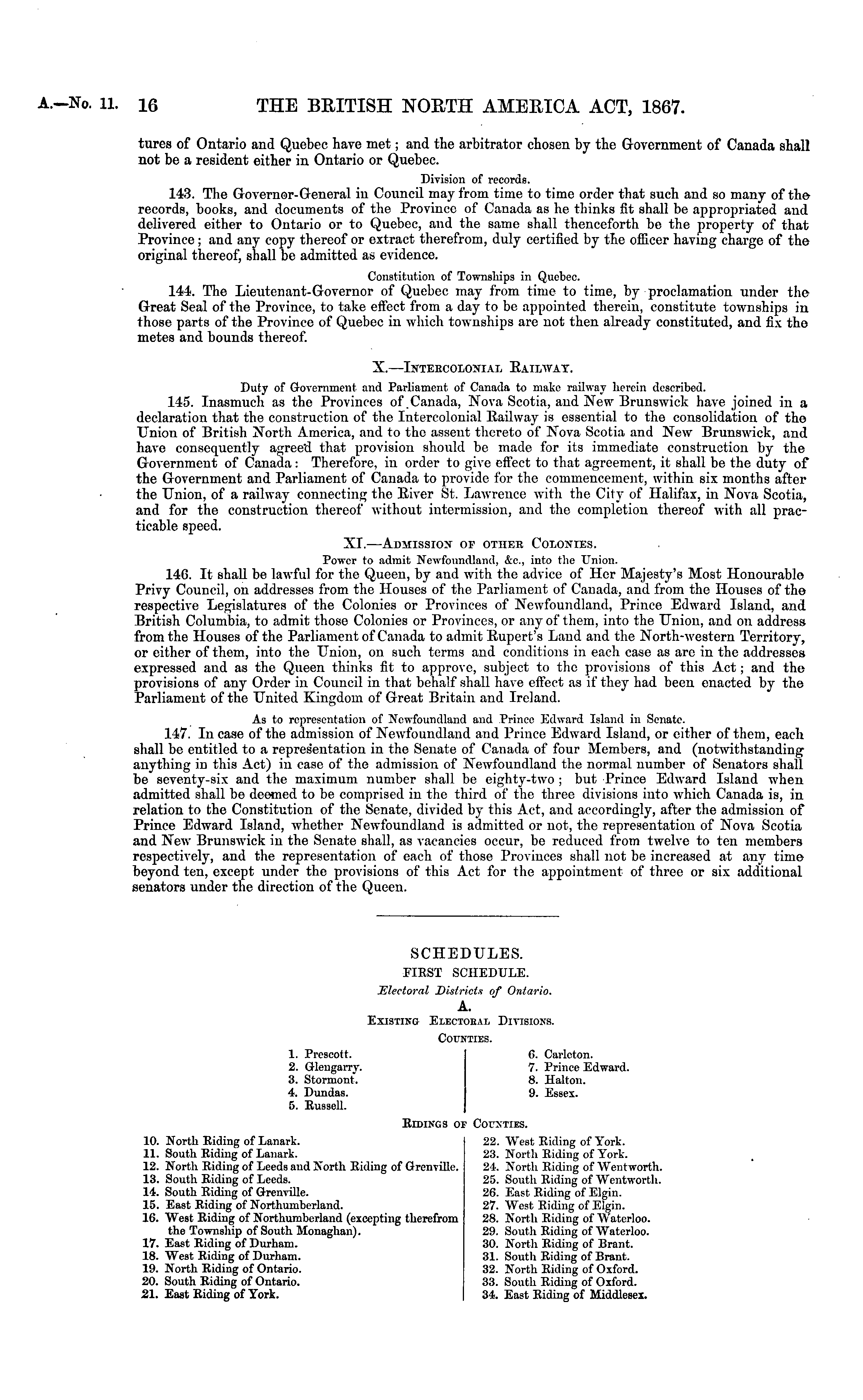 tures of Ontario and Quebec have met; and the arbitrator chosen by the Government of Canada shall not be a resident either in Ontario or Quebec. Division of records. 143. The Governor-General in Council may from time to time order that such and so many of the records, books, and documents of the Province of Canada as he thinks fit shall be appropriated aud delivered either to Ontario or to Quebec, and the same shall thenceforth be the property of that Province ; and any copy thereof or extract therefrom, duly certified by the officer having charge of the original thereof, shall be admitted as evidence. Constitution of Townships in Quebec. 144. The Lieutenant-Governor of Quebec may from time to time, by proclamation under the Great Seal of the Province, to take effect from a day to be appointed therein, constitute townships in those parts of the Province of Quebec in which townships are not then already constituted, and fix the metes and bounds thereof. X. —Inteecolosial Railway. Duty of Government and Parliament of Canada to make railway herein described. 145. Inasmuch as the Provinces of .Canada, Nova Scotia, and New Brunswick have joined in a declaration that the construction of the Intercolonial ltailway is essential to the consolidation of the Union of British North America, and to the assent thereto of Nova Scotia and New Brunswick, and have consequently agreed that provision should be made for its immediate construction by the Government of Canada: Therefore, in order to give effect to that agreement, it shall be the duty of the Government and Parliament of Canada to provide for the commencement, within six months after the Union, of a railway connecting the River St. Lawrence with the City of Halifax, in Nova Scotia, and for the construction thereof without intermission, and the completion thereof with all practicable speed. XI. —Amnssrox of other Colonies. Power to admit Newfoundland, &c., into the Union. 14G. It shall be lawful for the Queen, by and with the advice of Her Majesty's Most Honourable Privy Council, on addresses from the Houses of the Parliament of Canada, and from the Houses of the respective Legislatures of the Colonies or Provinces of Newfoundland, Prince Edward Island, and British Columbia, to admit those Colonies or Provinces, or any of them, into the Union, and on address from the Houses of the Parliament of Canada to admit Rupert's Land and the North-western Territory, or either of them, into the Union, on such terms and conditions in each case as are in the addresses expressed and as the Queen thinks fit to approve, subject to the provisions of this Act; and the provisions of any Order in Council in that behalf shall have effect as if they had been enacted by the Parliament of the United Kingdom of Great Britain and Ireland. As to representation of Newfoundland and Prince Edward Island in Senate. 147. Incase of the admission of Newfoundland and Prince Edward Island, or cither of them, each shall be entitled to a representation in the Senate of Canada of four Members, and (notwithstandinganything in this Act) in case of the admission of Newfoundland the normal number of Senators shall be seventy-six and the maximum number shall be eighty-two ; but Prince Edward Island when admitted shall be deemed to be comprised in the third of the three divisions into which Canada is, in relation to the Constitution of the Senate, divided by this Act, and accordingly, after the admission of Prince Edward Island, whether Newfoundland is admitted or not, the representation of Nova Scotia and New Brunswick in the Senate shall, as vacancies occur, be reduced from twelve to ten members respectively, and the representation of each of those Provinces shall not be increased at any time beyond ten, except under the provisions of this Act for the appointment of three or six additional senators under the direction of the Queen.