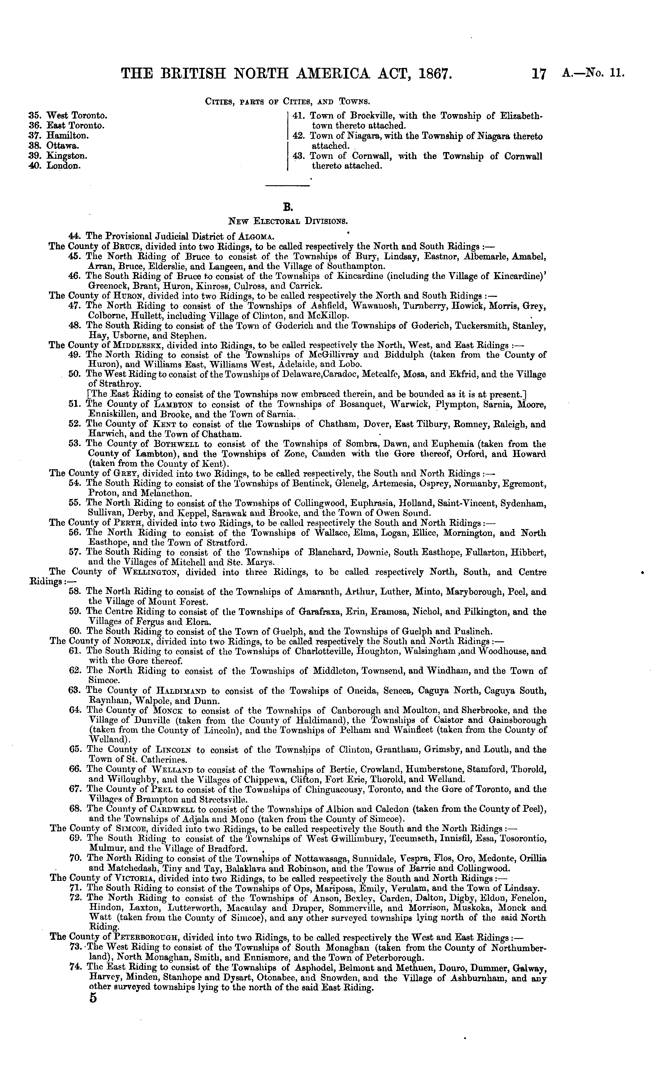 B. New Electokal Divisions. 44. The Provisional Judicial District of Algoma. The County of Bruce, divided into two Ridings, to be called respectively the North and South Biding! : — 45. The North Riding of Bruce to consist of the Townships of Bury, Lindsay, Eastnor, Albemarle, Amabel, Arran, Bruce, Elderslie, and Langeen, and the Village of Southampton. 4G. The Soutli Riding of Bruce to consist of the Townships of Kincardine (including the Tillage of Kincardine)' G-recnock, Brant, Huron, Kinross, Culross, and Carriek. The County of Huron, divided into two Ridings, to be called respectively the North and South Ridings : — 47. The North Riding to consist of the Townships of Ashfield, \Vawanosh, Turnberry, Howick, Morris, Grey, Colborne, Hullett, including Village of Clinton, and McKillop. 48. The South Riding to consist of the Town of Godcrich and the Townships of Goderich, Tuekersmith, Stanley, Hay, Usborne, and Stephen. The County of Middlesex, divided into Ridings, to be called respectively the North, West, and East Ridings : — 49. The North Riding to consist of the Townships of McGillivray and Biddulph (taken from the County of Huron), and Williams East, Williams West, Adelaide, and Lobo. 50. The West Riding to consist of the Townships of Delaware,Caradoe, Metcalfc, Mosa, and Ekfrid, and the Village of Strathroy. [The East Riding to consist of the Townships now embraced therein, and bo bounded as it is at present.] 51. Tin; County of Lambton' to consist of the Townships of Bosauquet, Warwick, Plympton, Sarnia, Moore, Enniskillen, and Brooke, and the Town of Sarnia. 52. The County of Kent to consist of the Townships of Chatham, Dover, East Tilbury, Romney, Raleigh, and Harwich, and the Town of Chatham. 53. The County of Botihvell to consist of the Townships of Sombra, Dawn, and Euphcmia (taken from the County of Lambton), and the Townships of Zone, Caniden with tlio G-ore thereof, Orford, and Howard (taken from the County of Kent). The County of Grey, divided into two Ridings, to be called respectively, the Soutli and North Ridings :— 54. The Soutli Riding to consist of the Townships of Bentinck, Glenelg, Artemesia, Osprey, Normanbj-, Egremont, Proton, and Melanethon. 55. The North Riding to consist of the Townships of Collingwood, Euphrasia, Holland, Saint-Vincent, Sydenham, Sullivan, Derby, and Keppcl, Sarawak and Brooke, and the Town of Owen Sound. The County of Fxbth, divided into two Ridings, to be called respectively the South and North Ridings: — 50. The North Riding to consist of the Townships of Wallace, Elma, Logan, Ellicc, Mornington, and North E&sthope, and the Town of Stratford. 57. The South Riding to consist of tho Townships of Blanchard, Downie, South Easthope, Fullarton, Hibbert, and the Villages of Mitchell and Ste. Mans. The County of Wellington, divided into three Ridings, to be called respectively North, South, and Centre Ridings: — 58. The North Riding to consist of the Townships of Amaranth, Arthur, Luther, Minto, Maryborough, Peel, and the Village of Mount Forest. 59. The Centre Riding to consist of the Townships of Garafraxa, Erin, Eramosa, Nichol, and Pilkington, and the Villages of Fergus and Elora. 60. The South Riding to consist of the Town of Guclph, and the Townships of Guelph and Puslineh. The County of Nokfolk, divided into two Ridings, to be called respectively the South and North Ridings : — 61. The South Riding to consist of tho Townships of Charlotteville, Houghton, Walsingham ,and Woodhouse, and with the Gore thereof. 62. The North Riding to consist of the Townships of Middleton, Townscnd, and Windham, and the Town of Simcoe. 63. Tlie County of Haldijiand to consist of the Towships of Oneida, Seneca, Caguya North, Caguya Soutli, Eaynham, Walpole, and Dunn. 64. Tin' Count v of Monck to consist of the Townships of Canborough and Moulton, and Sherbrooke, and the Tillage of Dunville (taken from the County of Haldimand), the Townships of Caistor and Gainsborough (taken from the County of Lincoln), and the Townships of Pelham and Wainlleet (taken from the County of Welliiml). 65. The Count}' of Lincoln to consist of tho Townships of Clinton, Grantham, Grimsby, and Louth, and the Town of St. Catherines. 66. The County of Welland to consist of the Townships of Bertie, Crowlanil, llumberstone, Stamford, Thorold, and Willoughbv, and the Villages of Chippewa, Clifton, Fort Erie, Thorold, and Wellaml. 67. The County of Peel to consist of the Townships of Chinguacousy, Toronto, and the Gore of Toronto, and the Villages of Brampton and Stivrlsville. 68. The County of Cardwell to consist of the Townships of Albion and Caledon (taken from the County of Peel), and (he Townships of Adjala and Mono (taken from the County of Simcoe). The County of Simcoe, divided into two Ridings, to be called respectively the South and the North Ridings : — 69. The South Riding to consist of the Townships of West Gwillimbury, Tecuuiseth, Innisfil, Bhb, Tosorontio, Muhnur, and the Village of Bradford. 70. The North Riding to consist of the Townships of Nottawasaga, Sunnidalo, Veepra, Flos, Oro, Medonte, Orillia and Ifatchedash, Tiny and Tay, Balaklava and Robinson, and the Towns of Barrio and Collingwood. Tho County of Victoria, divided into two Ridings, to be called respectively the South and North Ridings:— 71. The South Riding to consist of the Townships of Ops, Mariposa, Emily, Verulam, and the Town of Lindsay. 72. The North Riding to consist of the Townships of Anson, Bexley, Carden, Dalton, Digby, Eldon, Fenelon, Hindon, Laxton, Lutterworlh, Macauliiy and Draper, Somniervillc, and Morrison, Muskoka, Monek and Walt (taken from the County of Simcoe), and any other surveyed townships lying north of the said North Riding. The County of Peterborough, divided into two Ridings, to be called respectively the West and East Ridings :— 73. The West Riding to consist of the Townships of South Monaghan (taken from the County of Northumberland), North Monaghan, Smith, and E