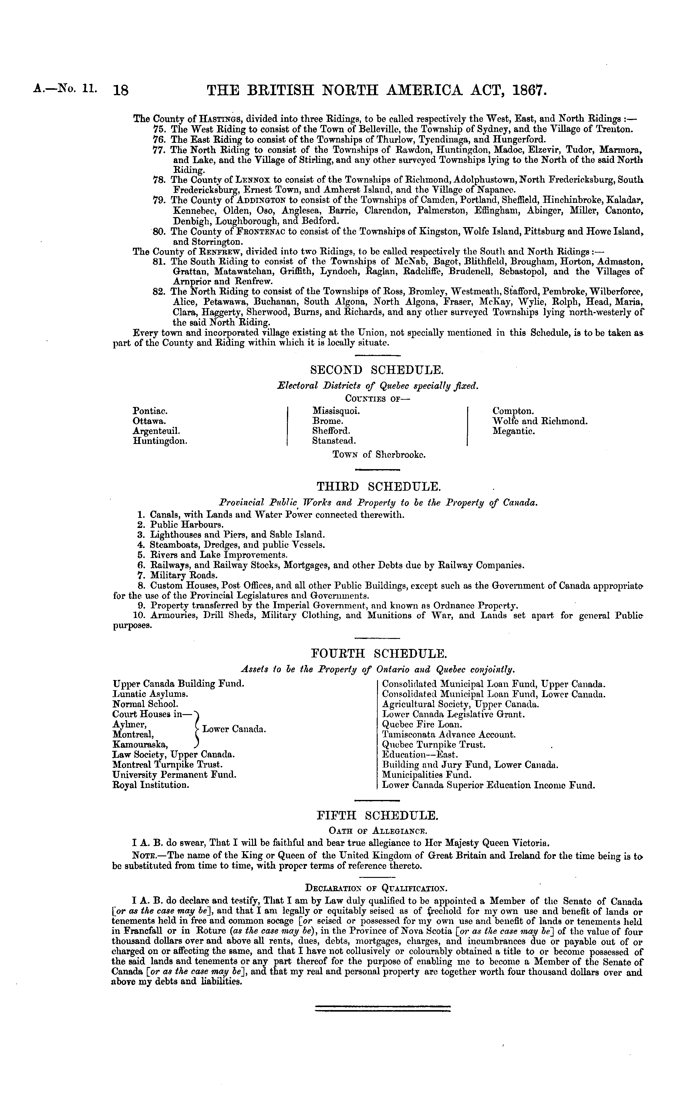 The County of Hastings, divided into three Ridings, to be called respectively the West, East, and North Ridings : — 75. The West Riding to consist of the Town of Belleville, the Township of Sydney, and the Village of Trenton. 76. The East Riding to consist of the Townships of Thurlow, Tyendinaga, and Hungerford. 77. The North Riding to consist of the Townships of Rawdon, Huntingdon, Madoe, Elzevir, Tudor, Marmora, and Lake, and the Village of Stirling, and any other surveyed Townships lying to the North of the said North Riding. 78. The County of Lennox to consist of the Townships of Richmond, Adolphustown, North Fredericksburg, South Fredericksburg, Ernest Town, and Amherst Island, and the Village of Napanee. 79. The County of Addington to consist of the Townships of Camden, Portland, Sheffield, Ilinchinbroke, Kaladar, Kennebec, Olden, Oso, Anglesea, Barrio, Clarendon, Palmerston, Effingham, Abinger, Miller, Canonto, Denbigh, Loughborough, and Bedford. 80. The County of Fkontenac to consist of the Townships of Kingston, Wolfe Island, Pittsburg and Howe Island, and Storrington. The County of Renfrew, divided into two Ridings, to be called respectively the South and North Ridings : — 81. The South Riding to consist of the Tow-nships of McNab, Bagot, Blithfiold, Brougham, Horton, Admaston, Grattan, Matawatchan, Griffith, Lyndoch, Raglan, Radcliffe, Brudenell, Scbastopol, and the Villages of Amprior and Renfrew. 82. The North Riding to consist of the Townships of Ross, Bromley, Westmeath, Stafford, Pembroke, Wilberforce, Alice, Petawawa, Buchanan, South Algona, North Algona, Fraser, McKay, Wylic, Rolph, Head, Maria, Clara, Haggerty, Sherwood, Burns, and Richards, and any other surveyed Townships lying north-westerly of the said North Riding. Every town and incorporated village existing at the Union, not specially mentioned in this Schedule, is to be taken as part ofthe County and Riding within which it is locally situate.