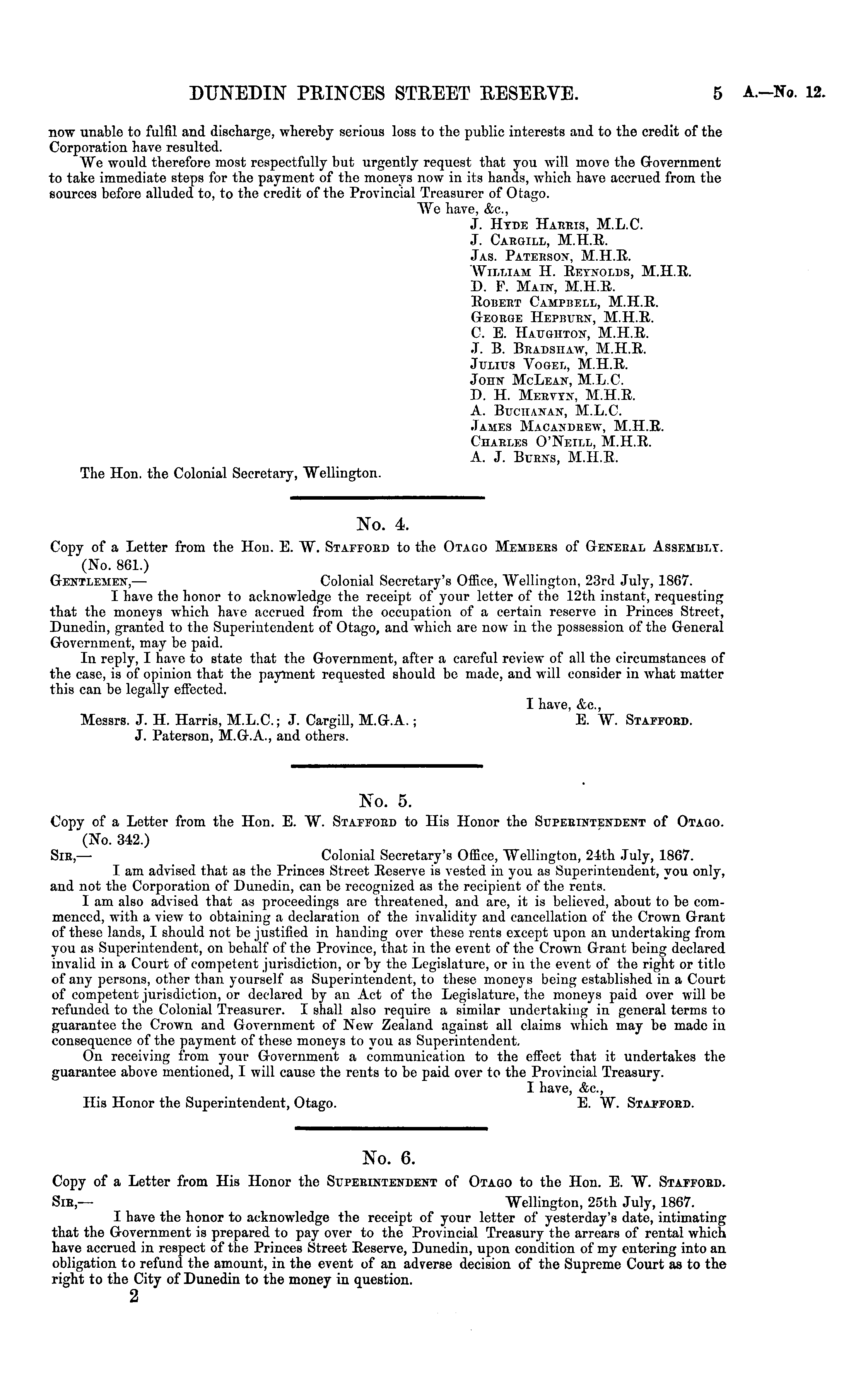 No. 4. Copy of a Letter from the Hon. E. "W. Staffoed to the Otago Members of General Assembly. (No. 861.) Gentlemen", — Colonial Secretary's Office, Wellington, 23rd July, 1867. I have the honor to acknowledge the receipt of your letter of the 12th instant, requesting that the moneys which have accrued from the occupation of a certain reserve in Princes Street, Dunedin, granted to the Superintendent of Otago, and which are now in the possession of the General Government, may be paid. In reply, I have to state that the Government, after a careful review of all the circumstances of the case, is of opinion that the payment requested should be made, and will consider in what matter this can be legally effected. I have, &c, Messrs. J. H. Harris, M.L.C.; J. Cargill, M.G.A. j E. W. Stafford. J. Paterson, M.G.A., and others.