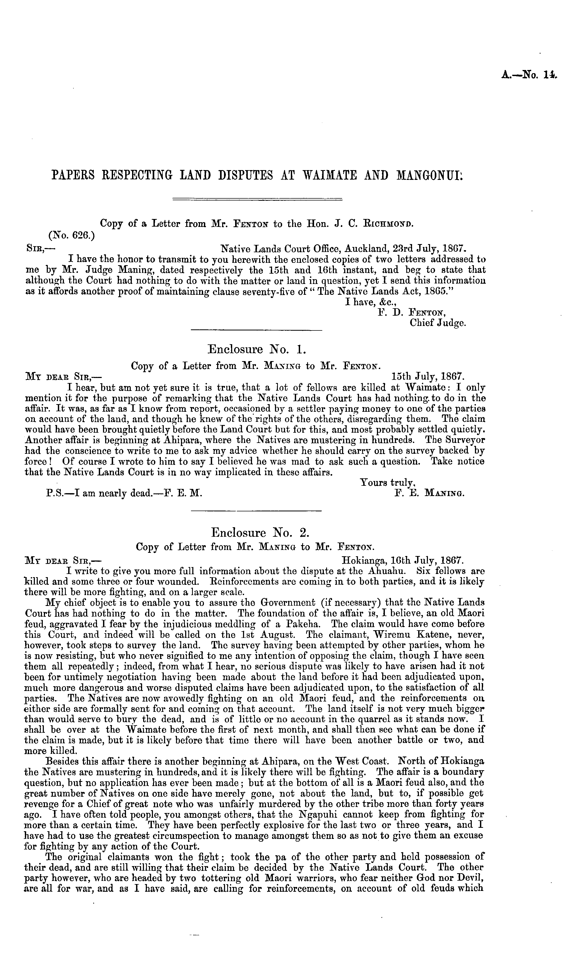 Enclosure ~No. 1. Copy of a Letter from Mr. Haxing to Mr. Fextox. Mt dear Sir,— 15th July, 1867. I hear, but am not yet sure it is true, that a lot of fellows are killed at Waimate: I only mention it for the purpose of remarking that the Native Lands Court has had nothing, to do in the affair. It was, as far as I know from report, occasioned by a settler paying money to one of the parties on account of the laud, and though he knew of the rights of the others, disregarding them. Tho claim would have been brought quietly before the Land Court but for this, and most probably settled quietly. Another affair is beginning at Ahipara, where the Natives are mustering in hundreds. The Surveyor had the conscience to write to me to ask my advice whether he should carry on tho survey backed by force ! Of course I wrote to him to say I believed ho was mad to ask such a question. Take notice that the Native Lands Court is in no way implicated in these affairs. Tours truly, P.S.—I am nearly dead.— F. E. M. F. E. Making.