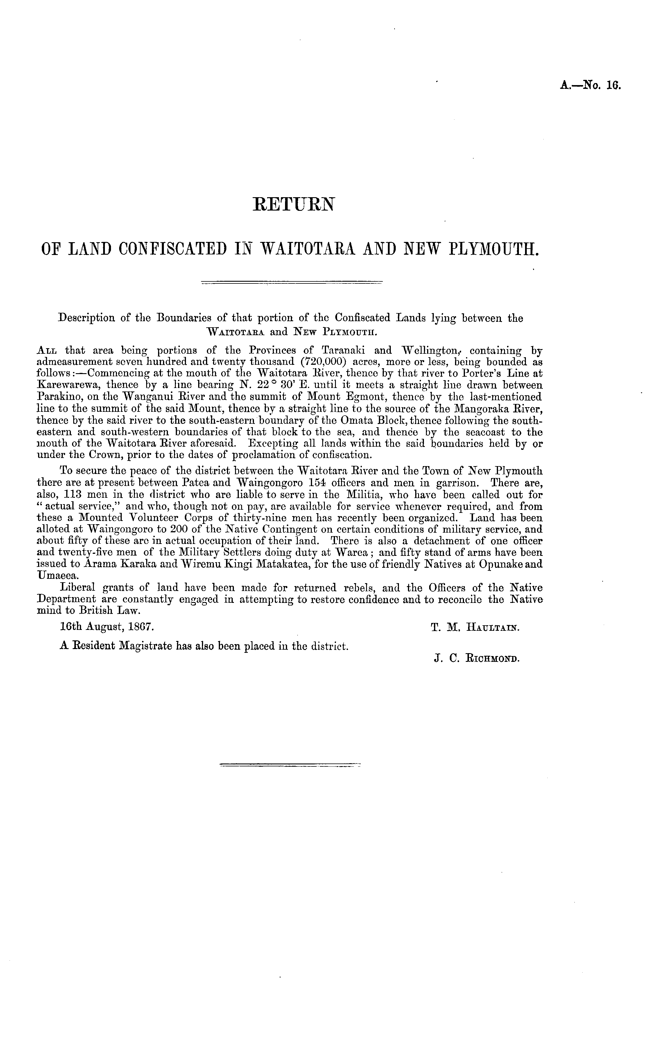 Description of the Boundaries of that portion of the Confiscated Lands lying between the Waitotaea and New Plymouth. All that area being portions of the Provinces of T.aranaki and Wellington,- containing by admeasurement seven hundred and twenty thousand (720,000) acres, more or less, being bounded as follows: —Commencing at the mouth of the Waitotara Eiver, thence by that river to Porter's Line at Karewarewa, thence by a line bearing N. 22 ° 30' E. until it meets a straight line drawn between Parakino, on the Wanganui Eiver and the summit of Mount Egmont, thence by the last-mentioned line to the summit of the said Mount, thence by a straight line to the source of the Mangoraka Eiver, thence by the said river to the south-eastern boundary of the Omata Block, thence following the southeastern and south-western boundaries of that block to the sea, and thence by the seacoast to the mouth of the Waitotara Eiver aforesaid. Excepting all lands within the said boundaries held by or under the Crown, prior to the dates of proclamation of confiscation. To secure the peace of the district between the Waitotara Eiver and the Town of New Plymouth there are at present between Patea and Waingongoro 154 officers and men in garrison. There are, also, 113 men in the district who are liable to serve in the Militia, who have been called out for " actual service," and who, though not on pay, are available for service whenever required, and from these a Mounted Volunteer Corps of thirty-nine men has recently been organized. Land has been alloted at Waingongoro to 200 of the Native Contingent on certain conditions of military service, and about fifty of these arc in actual occupation of their land. There is also a detachment of one officer and twenty-five men of the Military Settlers doing duty at Warca ; and fifty stand of arms have been issued to Arama Karaka and AViremu Kingi Matakatea, for the use of friendly Natives at Opunake and Umaeea. Liberal grants of land have been made for returned rebels, and the Officers of the Native Department are constantly engaged in attempting to restore confidence and to reconcile the Native mind to British Law. lGth August, 18G7. T. M. Haultaix. A Eesident Magistrate has also been placed in the district. J. C. BICHHOND.