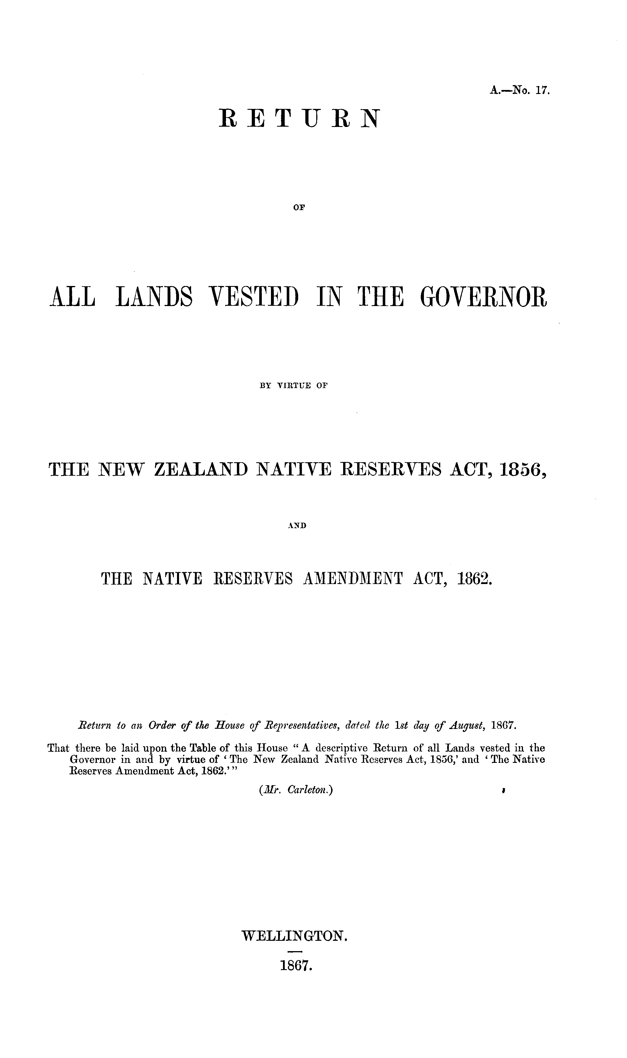Return to an Order of the House of Representatives, dated the Ist day of August, 1807. That there be laid upon the Table of this House " A descriptive Return of all Lands vested in the Governor in and by virtue of ' The New Zealand Native Reserves Act, 185G,' and ' The Native Reserves Amendment Act, 1862.'" (Mr. Carleton.) i