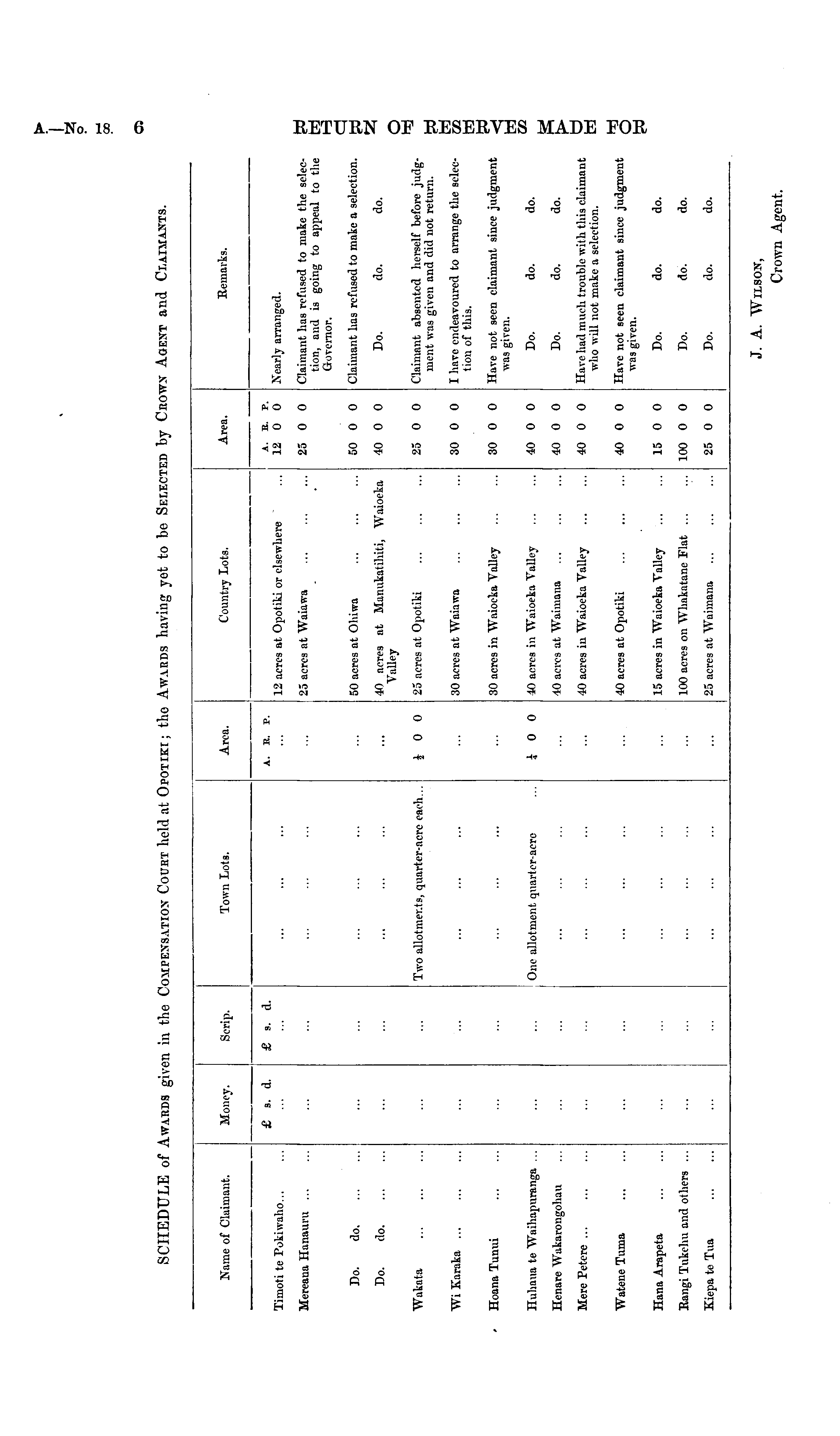 SCHEDULE of AWARDS given in the COMPENSATION COURT held at OPOTIKI; the AWARDS having yet to be SELECTED by CROWN AGENT and CLAIMANTS.