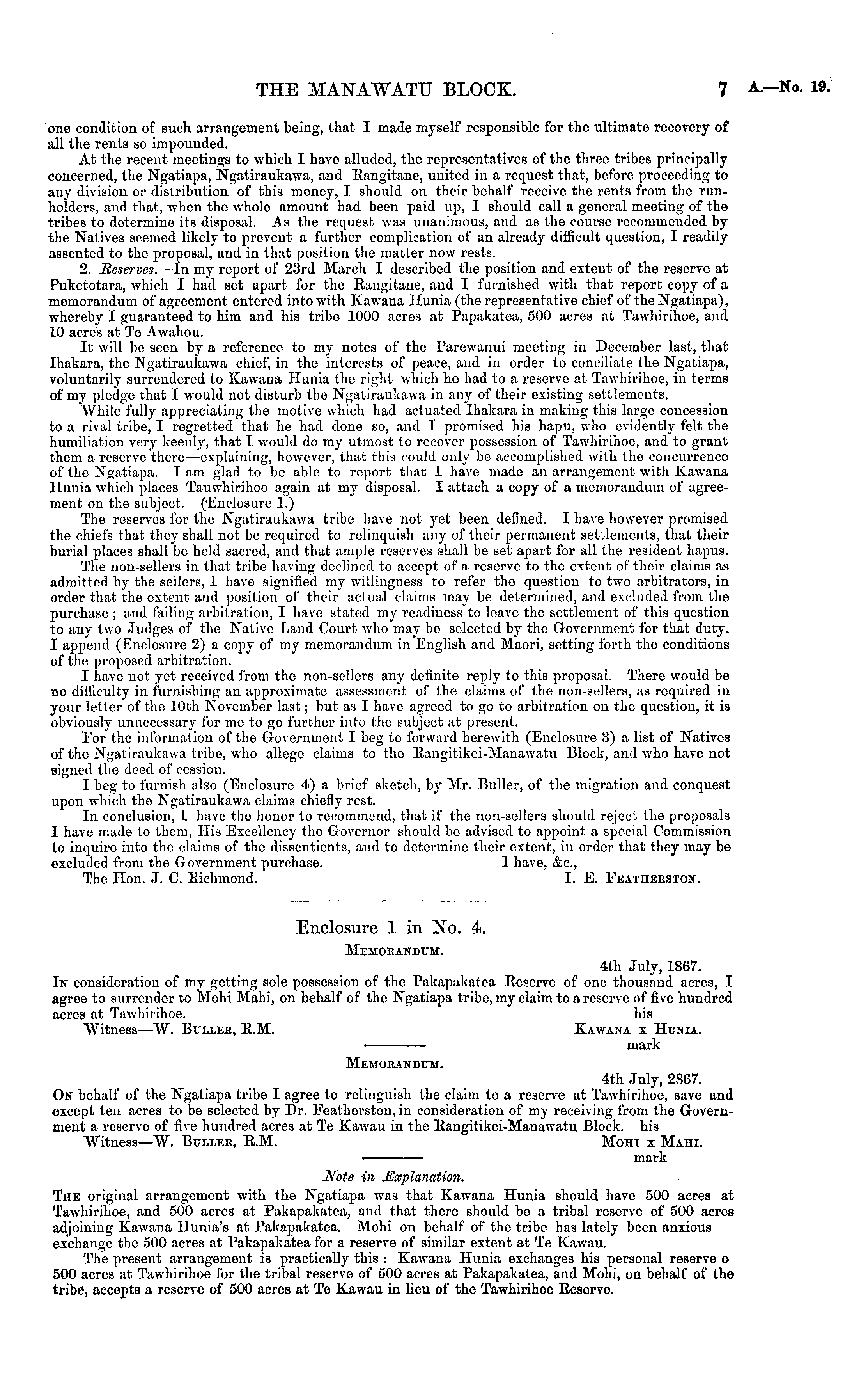 Enclosure 1 in No. 4. Memorandum. 4th July, 1867. In consideration of my getting sole possession of the Pakapakatea Reserve of one thousand acres, I agree to surrender to Mohi Mahi, on behalf of the Ngatiapa tribe, my claim to a reserve of five hundred acres at Tawhirihoe. his Witness —W. Buller, R.M. Kawana x Hunia. mark Memorandum. 4th July, 2867. On behalf of the Ngatiapa tribe I agree to relinquish the claim to a reserve at Tawhirihoe, save and except ten acres to be selected by Dr. Featherston, in consideration of my receiving from the Government a reserve of five hundred acres at Te Kawau in tho Rangitikei-Mauawatu Block, his Witness —W. Buller, R.M. Mom x Mahi. mark Note in Explanation. The original arrangement with the Ngatiapa was that Kawana Hunia should have 500 acres at Tawhirihoe, and 500 acres at Pakapakatea, and that there should be a tribal reserve of 500 acres adjoining Kawana Hunia's at Pakapakatea. Mohi on behalf of the tribe has lately been anxious exchange the 500 acres at Pakapakatea for a reserve of similar extent at Te Kawau. The present arrangement is practically this : Kawana Hunia exchanges his personal reserve o 500 acres at Tawhirihoe for the tribal reserve of 500 acres at Pakapakatea, and Mohi, on behalf of the tribe, accepts a reserve of 500 acres at Te Kawau in lieu of the Tawhirihoe Reserve.
