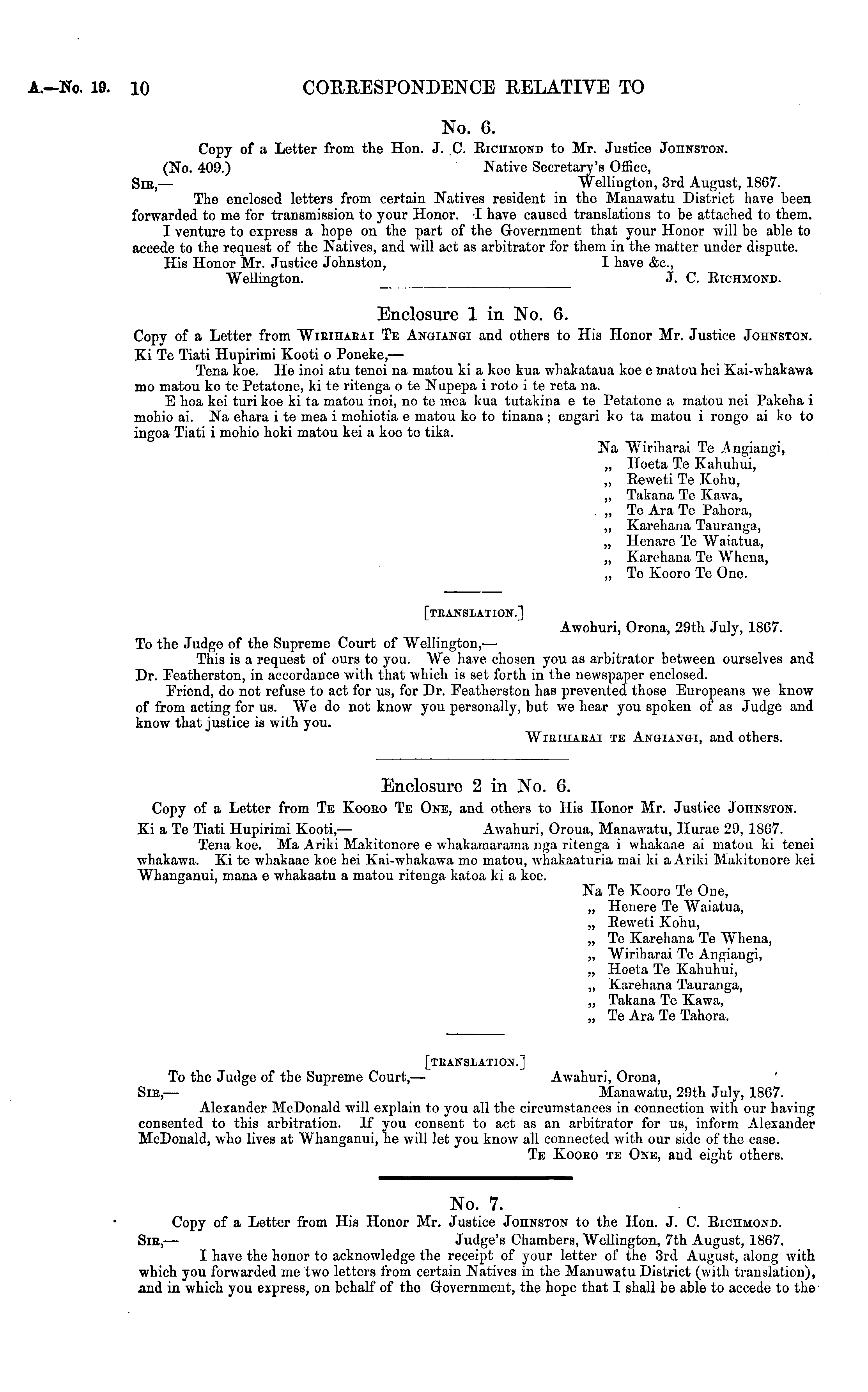 No. 7. Copy of a Letter from His Honor Mr. Justice Johnston to the Hon. J. C. Eiciimond. Sib, — Judge's Chambers, Wellington, 7th August, 1867. I have tho honor to acknowledge the receipt of your letter of the 3rd August, along with ■which you forwarded me two letters from certain Natives in the Manuwatu District (with translation), and in which you express, on behalf of the Government, the hope that I shall be ablo to accede to the'