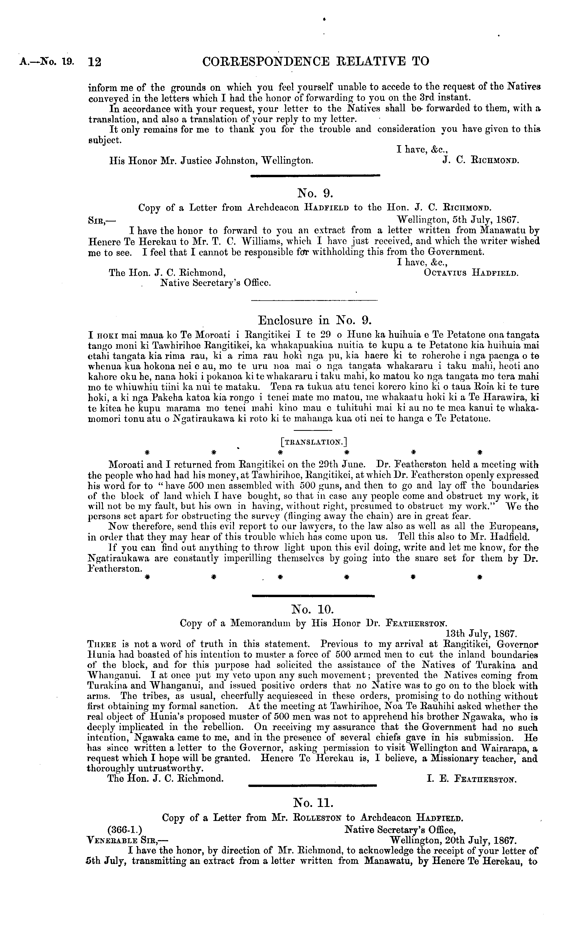 No. 11. Copy of a Letter from Mr. Eolleston to Archdeacon Haditeld. (366-1.) Native Secretary's Office, Vekeeabi.e Sir, — "Wellington, 20th July, 1867. I have the honor, by direction of Mr. Bichmond, to acknowledge the receipt of your letter of sth July, transmitting an extract from a letter written from Manawatu, by Henere Te Herekau, to