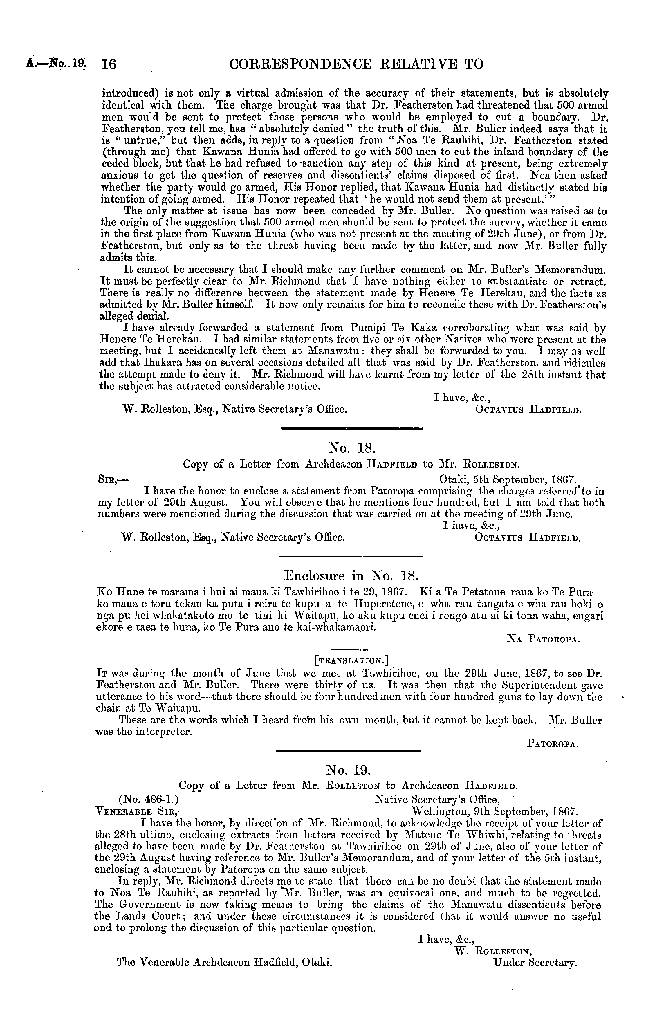 Enclosure in No. 18. Ko Hune te marama i hui ai maua ki Tawhirihoo ite 29, 1867. Xi aTe Petatone raua ko Te Pura— ko maua c toru tekau ka puta i reira te kupu a te lluperetene, c wha rau tangata c wha rau hoki o nga pu hei whakatakoto mo te tini ki Waitapu, ko aku kupu enei i rongo atu ai ki tona waha, cngari ekore c taea te huna, ko Te Pura ano te kai-whakamaori. Na Patoeopa.