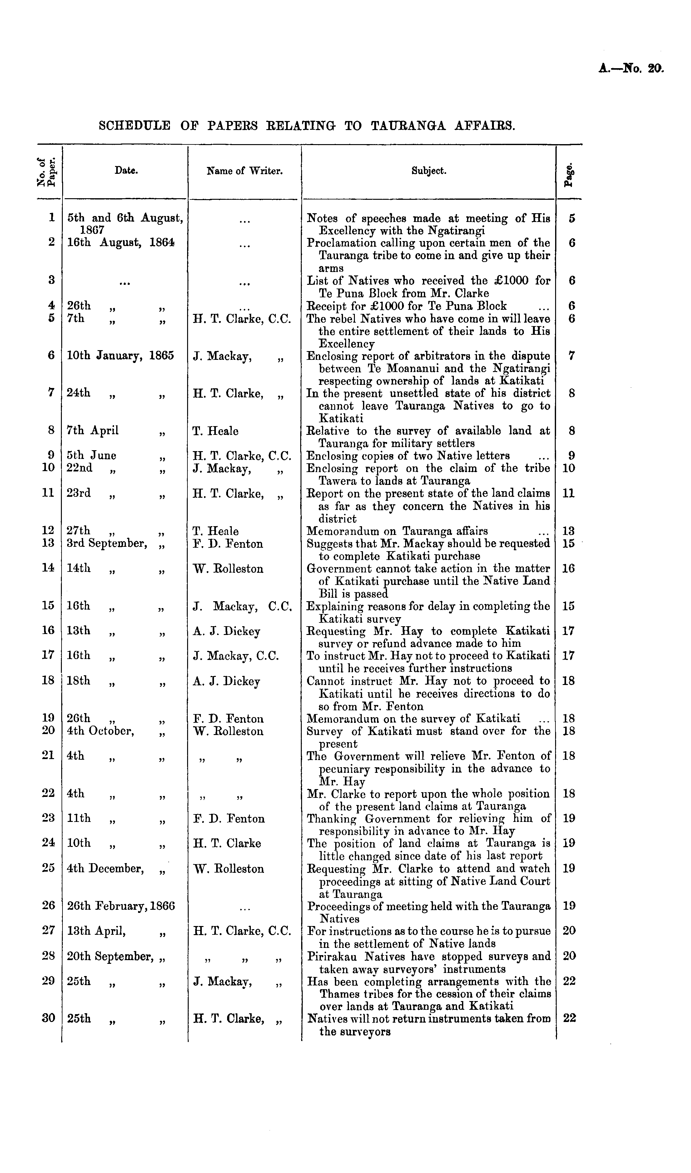 SCHEDULE OF PAPERS RELATING TO TAURANGA AFFAIRS.