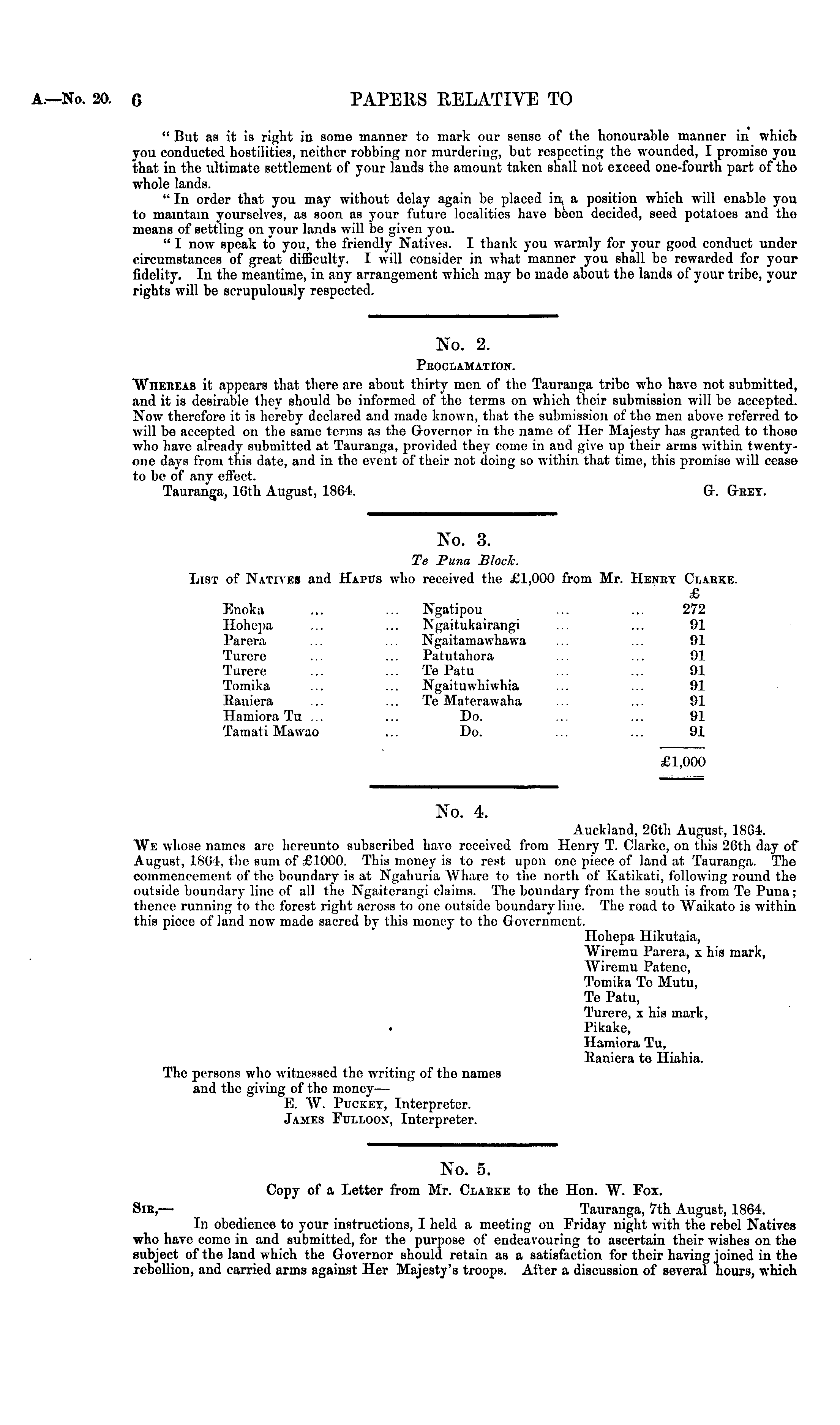 No. 5. Copy of a Letter from Mr. Clabke to the Hon. "W. Fox. Sib, — Tauranga, 7th August, 1864. In obedience to your instructions, I held a meeting on Friday night with the rebel Natives who have come in and submitted, for the purpose of endeavouring to ascertain their wishes on the subject of the land which the Governor should retain as a satisfaction for their having joined in the rebellion, and carried arms against Her Majesty's troops. After a discussion of several hours, which