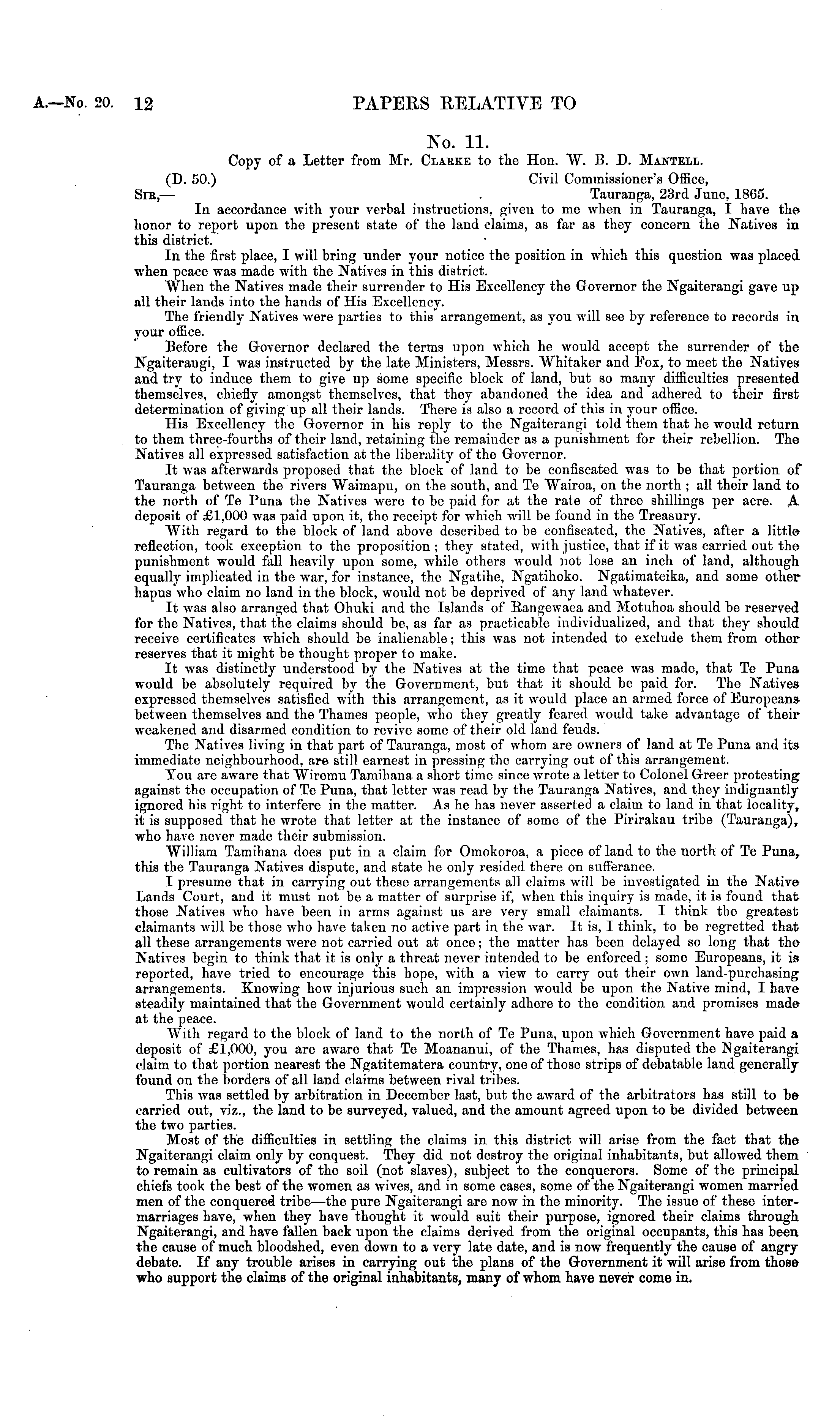 No. 11. Copy of a Letter from Mr. Claiike to the Hon. W. B. D. Mantell. (D. 50.) Civil Commissioner's Office, Sib, — . Tauranga, 23rd June, 1865. In accordance with your verbal instructions, given to mo when in Tauranga, I have the honor to report upon the present state of the land claims, as far as they concern the Natives in this district. In the first place, I will bring under your notice the position in which this question was placed when peace was made with the Natives in this district. When the Natives made their surrender to His Excellency the Governor the Ngaiterangi gave up fill their lands into the hands of His Excellency. The friendly Natives were parties to this arrangement, as you will see by reference to records in your office. Before the Governor declared the terms upon which he would accept the surrender of the Ngaiterangi, I was instructed by the late Ministers, Messrs. Whitaker and Fox, to meet the Natives and try to induce them to give up some specific block of land, but so many difficulties presented themselves, chiefly amongst themselves, that they abandoned the idea and adhered to their first determination of giving up all their lands. There is also a record of this in your office. His Excellency the Governor in his reply to the Ngaiterangi told them that he would return to them three-fourths of their land, retaining the remainder as a punishment for their rebellion. The Natives all expressed satisfaction at the liberality of the Governor. It was afterwards proposed that the block of land to be confiscated was to be that portion of Tauranga between the rivers Waimapu, on the south, and Te "Wairoa, on the north ; all their land to the north of Te Puna the Natives were to be paid for at the rate of three shillings per acre. A deposit of £1,000 was paid upon it, the receipt for which will be found in the Treasury. "With regard to the block of land above described to be confiscated, the Natives, after a little reflection, took exception to the proposition; they stated, with justice, that if it was carried out the punishment would fall heavily upon some, while others would not lose an inch of land, although equally implicated in the war, for instance, the Ngatihe, Ngatihoko. Ngatimateika, and some other hapus who claim no land in the block, would not be deprived of any land whatever. It was also arranged that Ohuki and the Islands of Bangewaea and Motuhoa should be reserved for the Natives, that the claims should be, as far as practicable individualized, and that they should receive certificates which should be inalienable; this was not intended to exclude them from other reserves that it might be thought proper to make. It was distinctly understood by the Natives at the time that peace was made, that To Puna would be absolutely required by the Government, but that it should be paid for. The Natives expressed themselves satisfied with this arrangement, as it would place an armed force of Europeans between themselves and the Thames people, who they greatly feared would take advantage of their weakened and disarmed condition to revive some of their old land feuds. The Natives living in that part of Tauranga, most of whom are owners of land at Te Puna and its immediate neighbourhood, are still earnest in pressing the carrying out of this arrangement. \7ou are aware that Wiremu Tamihana a short time since wrote a letter to Colonel Greer protesting; against the occupation of Te Puna, that letter was read by the Tauranga Natives, and they indignantly ignored his right to interfere in the matter. As he has never asserted a claim to land in that locality, it is supposed that he wrote that letter at the instance of some of the Pirirakau tribe (Tauranga), who have never made their submission. William Tamihana does put in a claim for Omokoroa, a piece of land to the north of Te Puna, this the Tauranga Natives dispute, and state he only resided there on sufferance. I presume that in carrying out these arrangements all claims will be investigated in the Native Lands Court, and it must not be a matter of surprise if, when this inquiry is made, it is found that those Natives who have been in arms against us are very small claimants. I think the greatest claimants will be those who have taken no active part in the war. It is, I think, to be regretted that all these arrangements were not carried out at once; the matter has been delayed so long that the Natives begin to think that it is only a threat never intended to be enforced ; some Europeans, it is reported, have tried to encourage this hope, with a view to carry out their own land-purchasing arrangements. Knowing how injurious such an impression would be upon the Native mind, I have steadily maintained that the Government would certainly adhere to the condition and promises made at the peace. With regard to the block of land to the north of Te Puna, upon which Government have paid a deposit of £1,000, you are aware that Te Moananui, of the Thames, has disputed the Ngaiterangi claim to that portion nearest the Ngatitematera country, one of those strips of debatable land generally found on the borders of all land claims between rival tribes. This was settled by arbitration in December last, but the award of the arbitrators has still to be carried out, viz., the land to be surveyed, valued, and the amount agreed upon to be divided between the two parties. Most of the difficulties in settling the claims in this district will arise from the fact that the Ngaiterangi claim only by conquest. They did not destroy the original inhabitants, but allowed them to remain as cultivators of the soil (not slaves), subject to the conquerors. Some of the principal chiefs took the best of the women as wives, and in some cases, some of the Ngaiterangi women married men of the conquered tribe—the pure Ngaiterangi are now in the minority. The issue of these intermarriages have, when they have thought it would suit their purpose, ignored their claims
