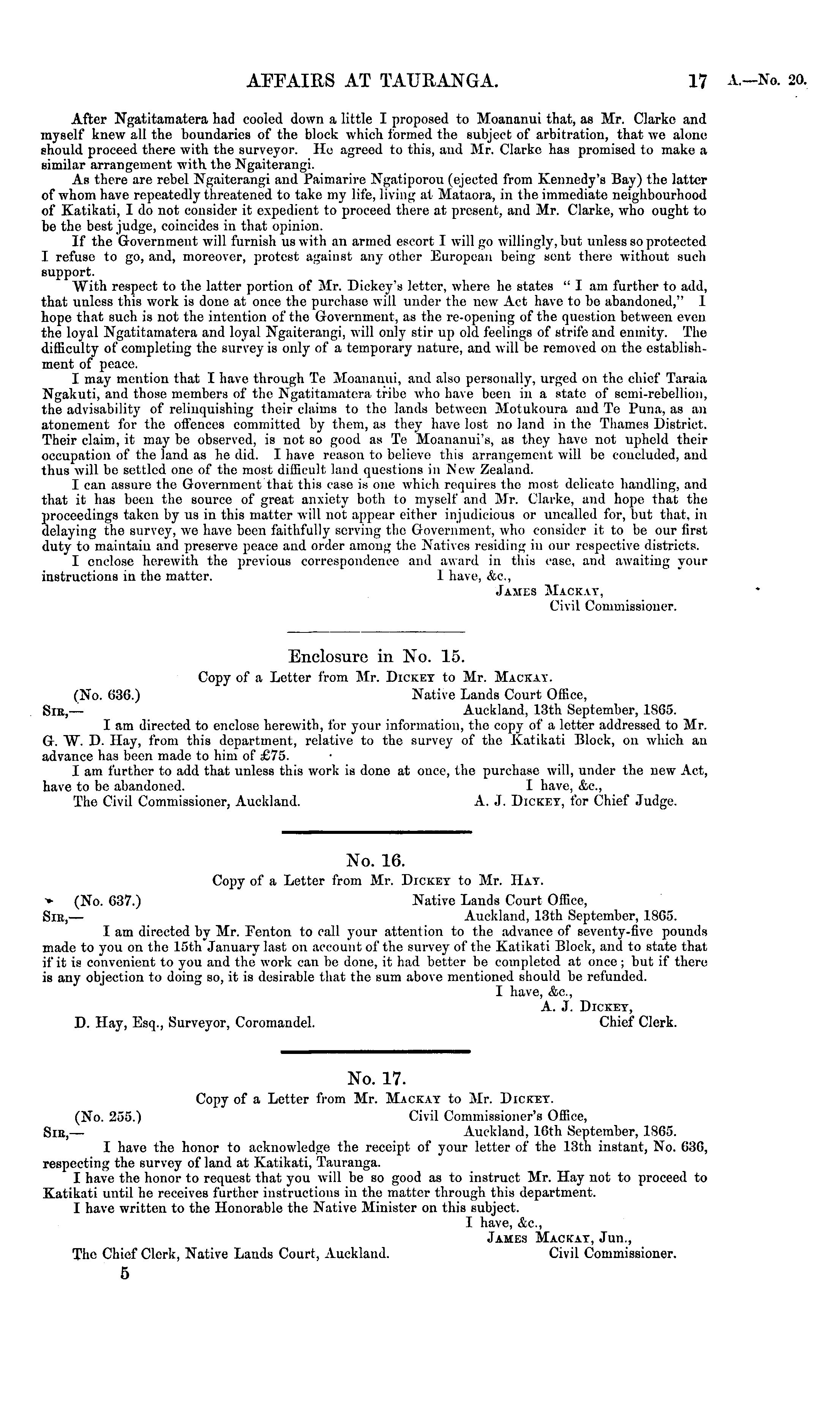 No. 17. Copy of a Letter from Mr. Mackay to Mr. Dickey. (No. 255.) Civil Commissioner's Office, Sic, — Auckland, 16th September, 1865. I have the honor to acknowledge the receipt of your letter of the 18th instant, No. 636, respecting the survey of land at Katikati, Taurauga. I have the honor to request that you will be so good as to instruct Mr. Hay not to proceed to Katikati until he receives further instructions in the matter through this department. I have written to the Honorable the Native Minister on this subject. I have, &c., James Mackay, Jun., The Chief Clerk, Native Lauds Court, Auckland. Civil Commissioner. 5