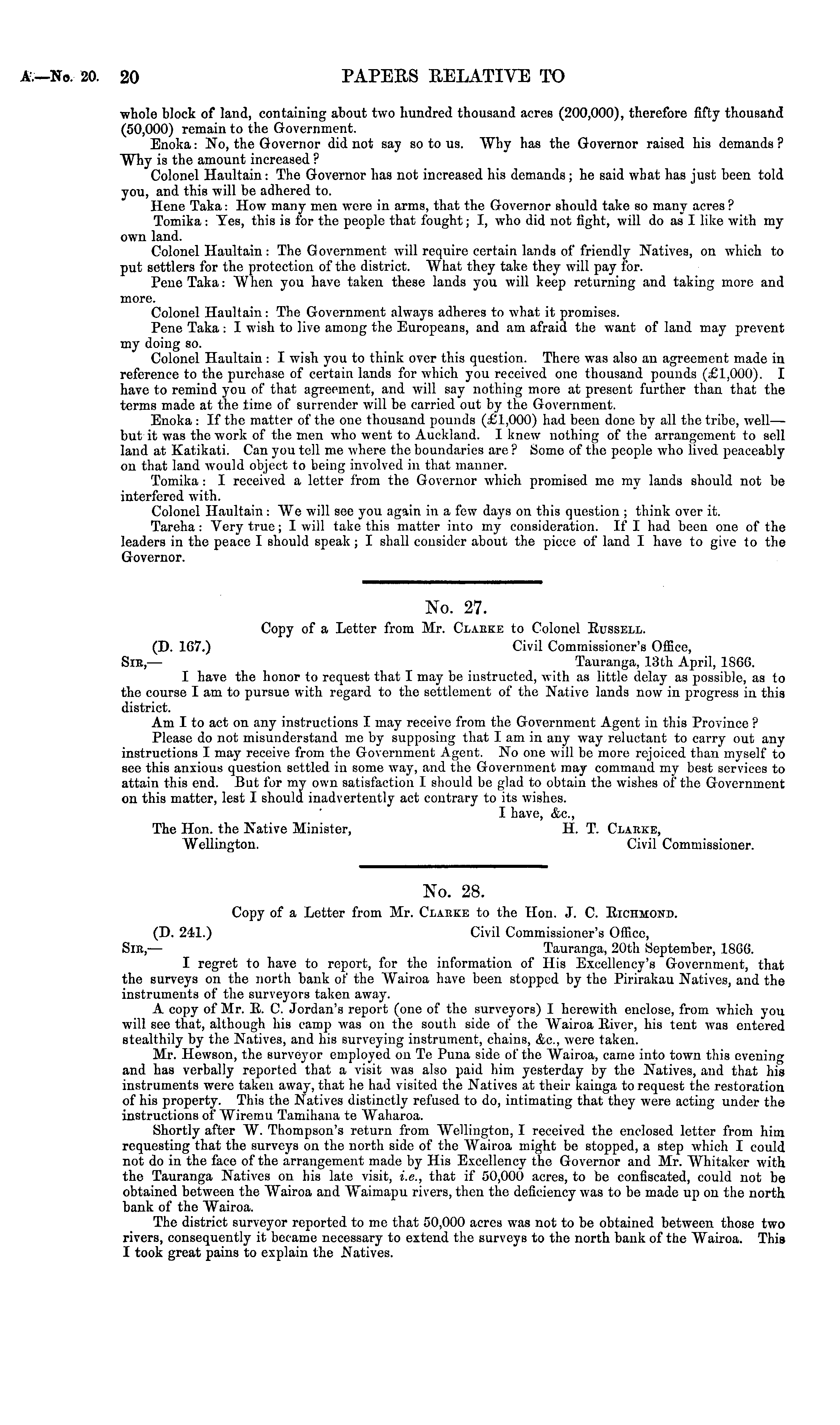 No. 28. Copy of a Letter from Mr. Claeke to the Hon. J. C. Richmond. (D. 241.) Civil Commissioner's Office, Sir, — Tauranga, 20th September, 18GG. I regret to have to report, for the information of His Excellency's Government, that the surveys on the north bank of the Wairoa have been stopped by the Pirirakau Natives, and the instruments of the surveyors taken away. A copy of Mr. E. C. Jordan's report (one of the surveyors) I herewith enclose, from which you will see that, although his camp was on the south side of the Wairoa River, his tent was entered stealthily by the Natives, and his surveying instrument, chains, <&c, were taken. Mr. Hewson, the surveyor employed on Te Puna side of the Wairoa, came into town this evening and has verbally reported that a visit was also paid him yesterday by the Natives, and that his instruments were taken away, that he had visited the Natives at their kainga to request the restoration of his property. This the Natives distinctly refused to do, intimating that they were acting under the instructions of Wiremu Tamihana to Waharoa. Shortly after W. Thompson's return from Wellington, I received the enclosed letter from him requesting that the surveys on the north side of the Wairoa might be stopped, a step which I could not do in the face of the arrangement made by His Excellency the Governor and Mr. Whitaker with the Tauranga Natives on his late visit, i.e., that if 50,000 acres, to be confiscated, could not be obtained between the Wairoa and Waimapu rivers, then the deficiency was to be made up on the north bank of the Wairoa. The district surveyor reported to me that 50,000 acres was not to be obtained between those two rivers, consequently it became necessary to extend the surveys to the north bank of the Wairoa. This I took great pains to explain the Natives.