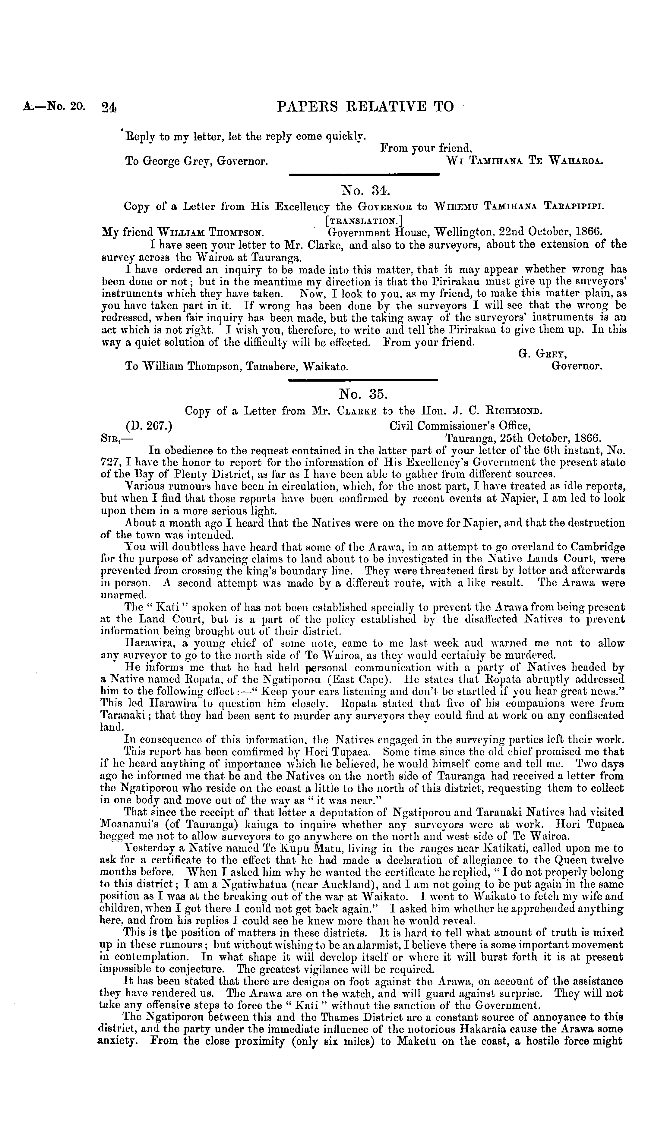 No. 34. Copy of a Letter from His Excellency the Governor to Wihemu Tamiiiana Tarapipipi. [translation.] My friend Willtam Thompson. Government House, Wellington, 22ud October, 1866. I have seen your letter to Mr. Clarke, and also to the surveyors, about the extension of tho survey across the Wairoa at Tauranga. 1 have ordered an inquiry to be made into this matter, that it may appear whether wrong has been done or not; but in the meantime my direction is that tho Pirirakau must give up the surveyors' instruments which they have taken. Now, I look to you, as my friend, to make this matter plain, as you have taken part in it. If wrong has been done by the surveyors I will see that the wrong be redressed, when fair inquiry has been made, but the taking away of the surveyors' instruments is an act which is not right. 1 wish you, therefore, to write and tell the Pirirakau to give them up. In this way a quiet solution of the difficulty will be effected. From your friend. G. Gret, To William Thompson, Tamahere, Waikato. Governor.