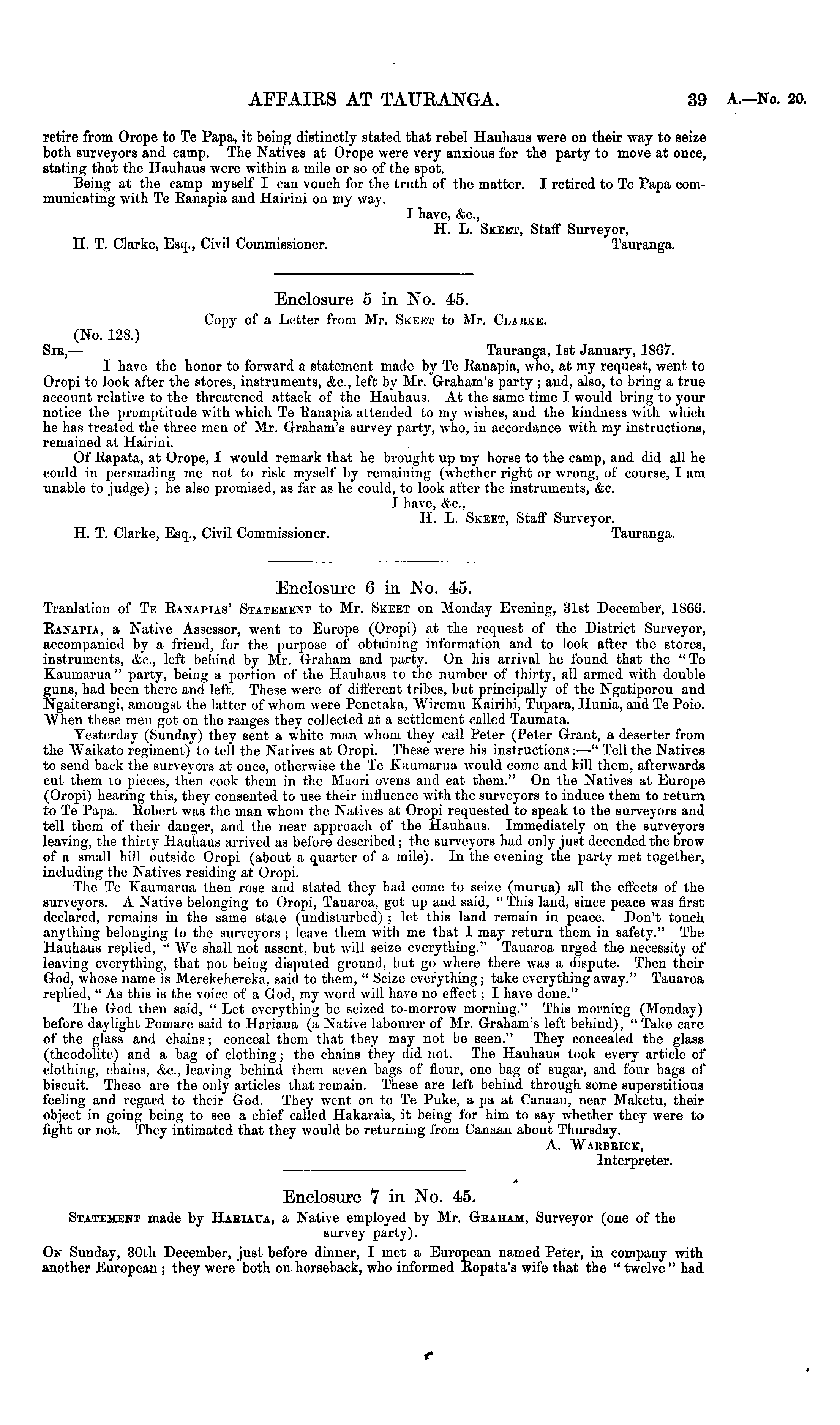 Enclosure 5 in No. 45. Copy of a Letter from Mr. Skeet to Mr. Claeke. (No. 128.) Sir, — Tauranga, Ist January, ISG7. I have the honor to forward a statement made by Te Banapia, who, at my request, went to Oropi to look after the stores, instruments, &c, left by Mr. Graham's party ; and, also, to bring a true account relative to the threatened attack of the Hauhaus. At the same time I would bring to your notice the promptitude with which Te lianapia attended to my wishes, and the kindness with which he has treated the three men of Mr. Graham's survey party, who, in accordance with my instructions, remained at Hairini. Of Eapata, at Orope, I would remark that he brought up my horse to the camp, and did all he could in persuading mo not to risk myself by remaining (whether right or wrong, of course, I am unable to judge) ; he also promised, as far as he could, to look after the instruments, &c. I have, &c, 11. L. Skeet, Staff Surveyor. H. T. Clarke, Esq., Civil Commissioner. Tauranga.