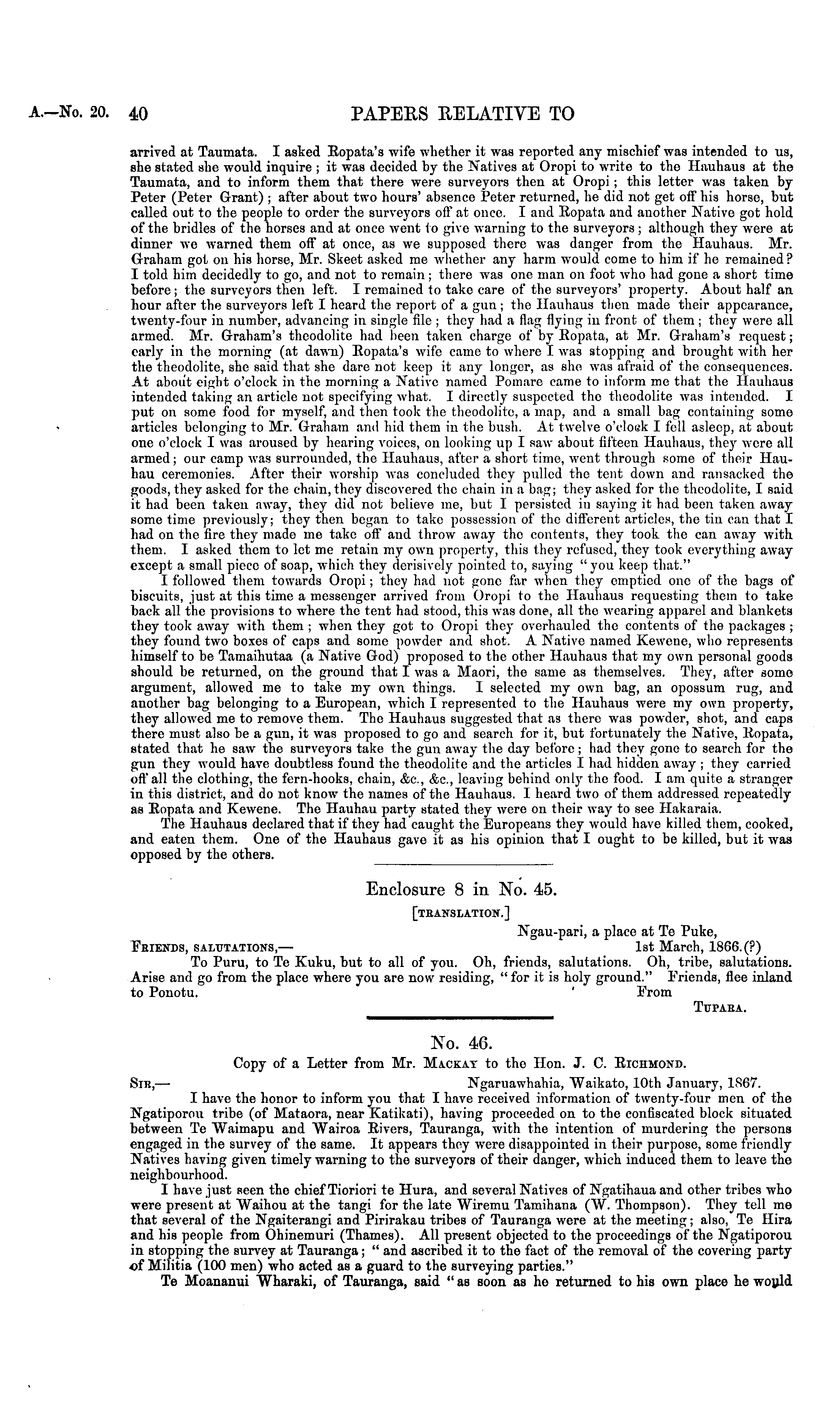 No. 46. Copy of a Letter from Mr. Mackay to the Hon. J. C. Richmond. Sib, — Ngaruawhahia, "Waikato, 10th January, 1867. I have the honor to inform you that I have received information of twenty-four men of the Ngatiporou tribe (of Mataora, near Katikati), having proceeded on to the confiscated block situated between Te "Waimapu and Wairoa Rivers, Tauranga, with the intention of murdering the persons engaged in the survey of the same. It appears they were disappointed in their purpose, some friendly Natives having given timely warning to the surveyors of their danger, which induced them to leave the neighbourhood. I have just seen the chief Tioriori te Ilura, and several Natives of Ngatihaua and other tribes who were present at Waihou at the tangi for the late Wiremu Tamihana (W. Thompson). They tell me that several of the Ngaiterangi and Pirirakau tribes of Tauranga were at the meeting; also, Te Hira and his people from Ohinemuri (Thames). All present objected to the proceedings of the Ngatiporou in stopping the survey at Tauranga; " and ascribed it to the fact of the removal of the covering party of Militia (100 men) who acted as a guard to the surveying parties." Te Moananui Wharaki, of Tauranga, said " as soon as he returned to his own placo he would