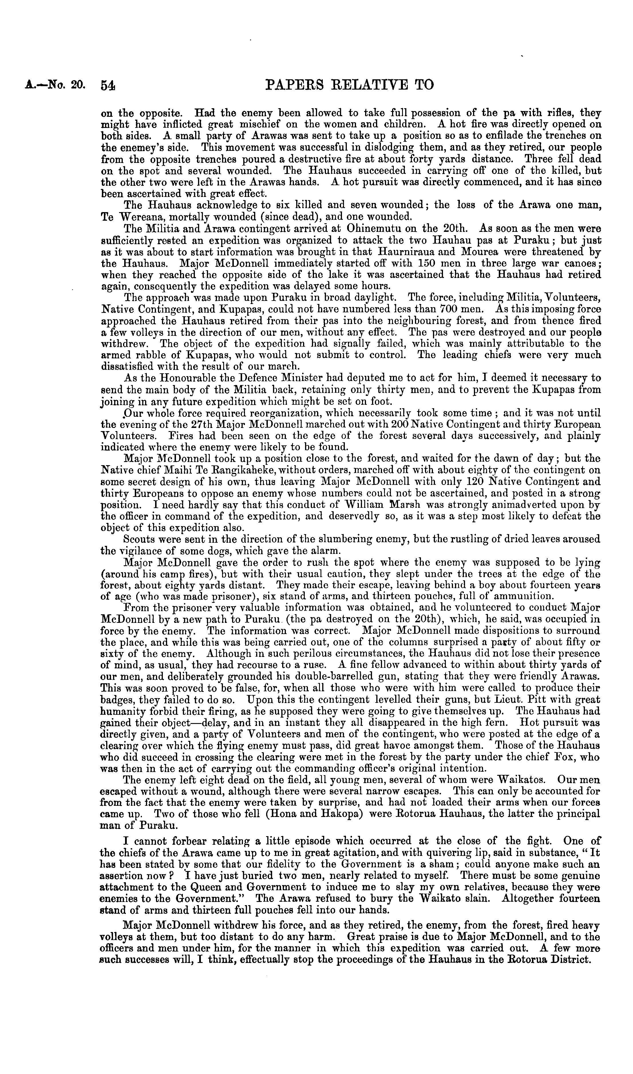 on the opposite. Had the enemy been allowed to take full possession of the pa with rifles, they might have inflicted great mischief on the women and children. A hot fire was directly opened on both sides. A small party of Arawas was sent to take up a position so as to enfilade the trenches on the enemey's side. This movement was successful in dislodging them, and as they retired, our people from the opposite trenches poured a destructive fire at about forty yards distance. Three fell dead on the spot and several wounded. The Hauhaus succeeded in carrying oft' one of the killed, but the other two were left in the Arawas hands. A hot pursuit was directly commenced, and it has since been ascertained with great effect. The Hauhaus acknowledge to six killed and seven, wounded; the loss of the Arawa one man, Te "Wereana, mortally wounded (since dead), and one wounded. The Militia and Arawa contingent arrived at Ohinemutu on the 20th. As soon as the men were sufficiently rested an expedition was organized to attack the two Hauhau pas at Puraku ; but just as it was about to start information was brought in that Haurniraua and Mourea were threatened by the Hauhaus. Major McDonnell immediately started off with 150 men in three large war canoes; when they reached the opposite side of the lake it was ascertained that the Hauhaus had retired again, consequently the expedition was delayed some hours. The approach was made upon Puraku in broad daylight. The force, including Militia, Volunteers, Native Contingent, and Kupapas, could not have numbered less than 700 men. As this imposing force approached the Hauhaus retired from their pas into the neighbouring forest, and from thence fired a few volleys in the direction of our men, without any effect. The pas were destroyed and our people withdrew. The object of the expedition had signally failed, which was mainly attributable to the armed rabble of Kupapas, who would not submit to control. The leading chiefs were very much dissatisfied with the result of our march. As the Honourable the Defence Minister had deputed me to act for him, I deemed it necessary to send the main body of the Militia back, retaining only thirty men, and to prevent the Kupapas from joining in any future expedition which might be set on foot. .Our whole force required reorganization, which necessarily took some time ; and it was not until the evening of the 27th Major McDonnell marched out with 200 Native Contingent and thirty European Volunteers. Fires had been seen on the edge of the forest several days successively, and plainly indicated where the enemy were likely to be found. Major McDonnell took up a position close to the forest, and waited for the dawn of day; but the Native chief Maihi Te Eangikaheke, without orders, marched oft" with about eighty of the contingent on some secret design of his own, thus leaving Major McDonnell with only 120 Native Contingent and thirty Europeans to oppose an enemy whose numbers could not be ascertained, and posted in a strong position. I need hardly say that this conduct of "William Marsh was strongly animadverted upon by the officer in command of the expedition, and deservedly so, as it was a step most likely to defeat the object of this expedition also. Scouts were sent in the direction of the slumbering enemy, but the rustling of dried leaves aroused the vigilance of some dogs, which gave the alarm. Major McDonnell gave the order to rush the spot where the enemy was supposed to be lying (around his camp fires), but with their usual caution, they slept under the trees at the edge of the forest, about eighty yards distant. They made their escape, leaving behind a boy about fourteen years of age (who was made prisoner), six stand of arms, and thirteen pouches, full of ammunition. From the prisoner very valuable information was obtained, and he volunteered to conduct Major McDonnell by a new path to Puraku (the pa destroyed on the 20th), which, he said, was occupied in force by the enemy. The information was correct. Major McDonnell made dispositions to surround the place, and while this was being carried out, one of the columns surprised a party of about fifty or sixty of the enemy. Although in such perilous circumstances, the Hauhaus did not lose their presence of mind, as usual, they had recourse to a ruse. A fine fellow advanced to within about thirty yards of our men, and deliberately grounded his double-barrelled gun, stating that they were friendly Arawas. This was soon proved to be false, for, when all those who were with him were called to produce their badges, they failed to do so. Upon this the contingent levelled their guns, but Lieut. Pitt with great humanity forbid their firing, as he supposed they were going to give themselves up. The Hauhaus had gained their object —delay, and in an instant they all disappeared in the high fern. Hot pursuit was directly given, and a party of Volunteers and men of the contingent, who were posted at the edge of a clearing over which the flying enemy must pass, did great havoc amongst them. Those of the Hauhaus who did succeed in crossing the clearing were met in the forest by the party under the chief Fox, who was then in the act of carrying out the commanding officer's original intention. The enemy left eight dead on the field, all young men, several of whom were Waikatos. Our men escaped without a wound, although there were several narrow escapes. This can only be accounted for from the fact that the enemy were taken by surprise, and had not loaded their arms when our forces came up. Two of those who fell (Hona and Hakopa) were Eotorua Hauhaus, the latter the principal man of Puraku. I cannot forbear relating a little episode which occurred at the close of the fight. One of the chiefs of the Arawa came up to me in great agitation, and with quivering lip, said in substance, " It lias been stated by some that our fidelity to the Government is a sham; could anyone make such an assertion now ? 