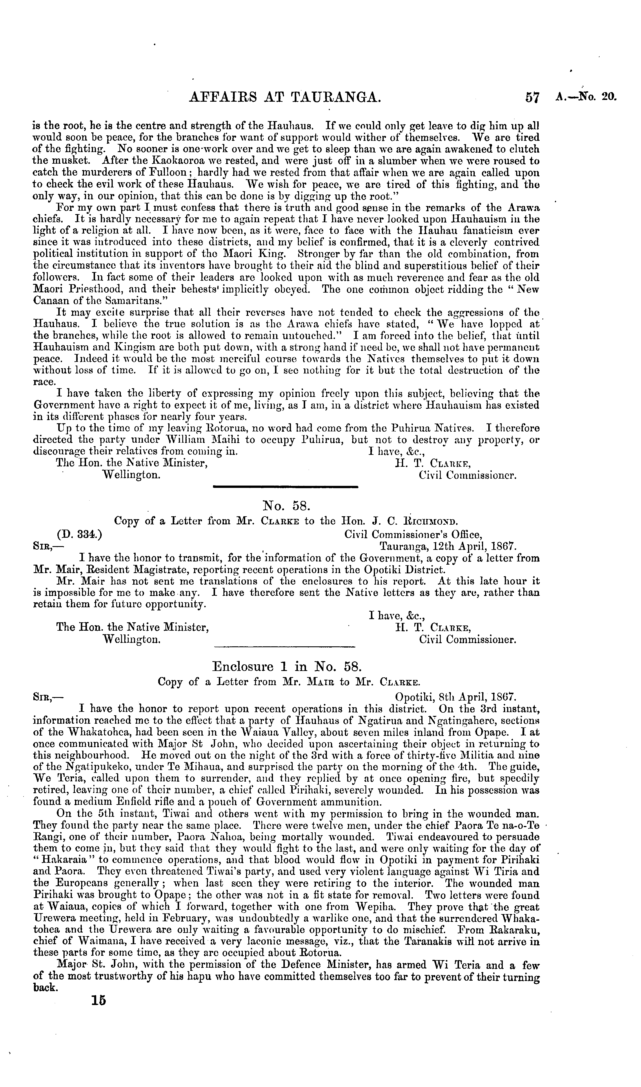 No. 58. Copy of a Letter from Mr. Clarke to the Hon. J. C. Richmond. (D. 33-4.) Civil Commissioner's Office, Sir,— , Tauranga, 12th April, 1867. I have the honor to transmit, for the information of the Government, a copy of a letter from Mr. Mair, Resident Magistrate, reporting recent operations in the Opotiki District. Mr. Mair has not sent me translations of the enclosures to his report. At this late hour it is impossible for me to make any. I have therefore sent the Native letters as they are, rather than retain them for future opportunity. I have, &c., The Hon. the Native Minister, H. T. Clarke, Wellington. Civil Commissioner.