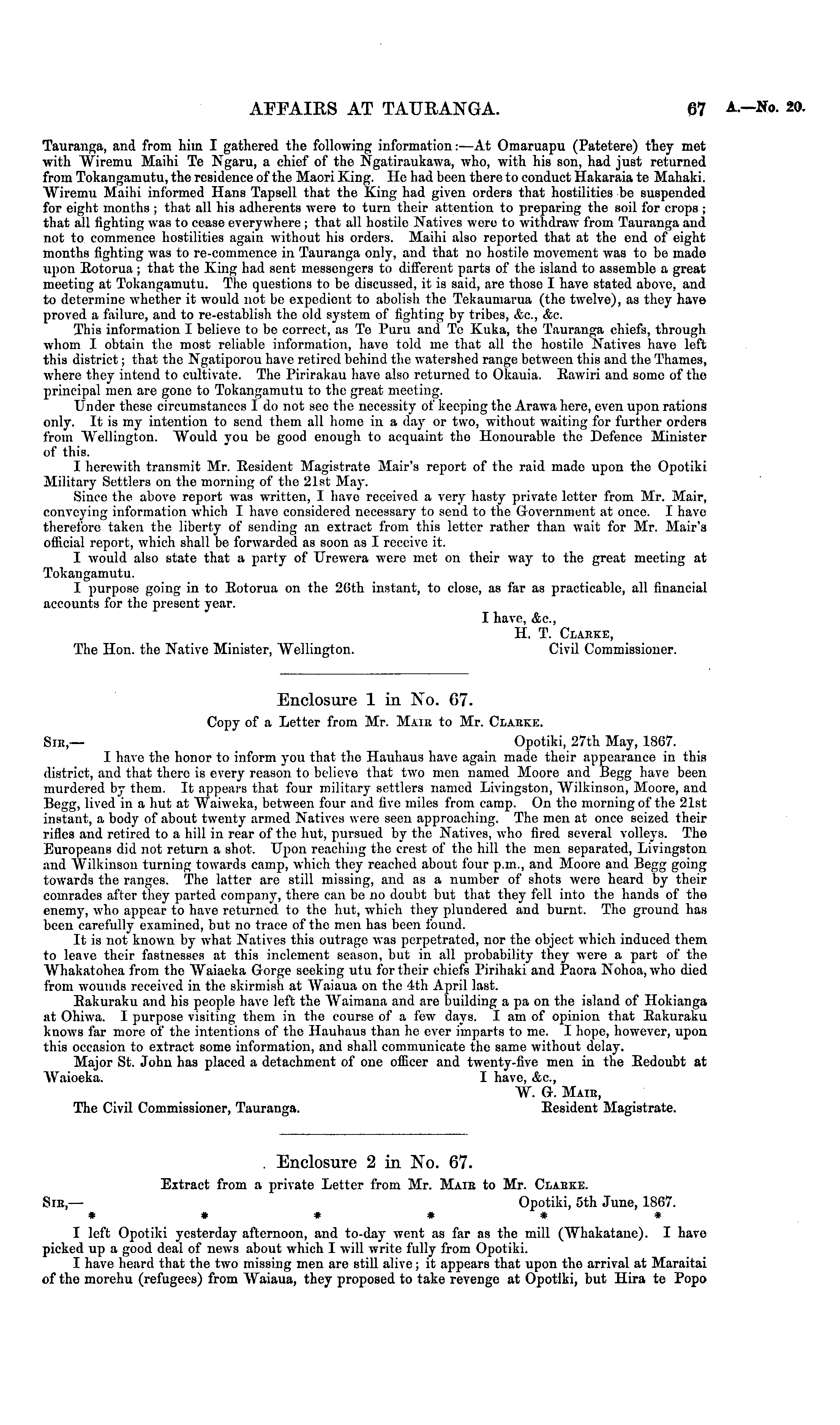 . Enclosure 2 in No. 67. Extract from a private Letter from Mr. Maib to Mr. Claeke. Sin,— Opotiki, sth June, 1867. ****** I left Opotiki yesterday afternoon, and to-day went as far as the mill (Whakataue). I have picked up a good deal of news about which I will write fully from Opotiki. I have heard that the two missing men are still alive; it appears that upon tho arrival at Maraitai of the morehu (refugees) from Waiaua, they proposed to take revenge at Opotiki, but Hira te Popo