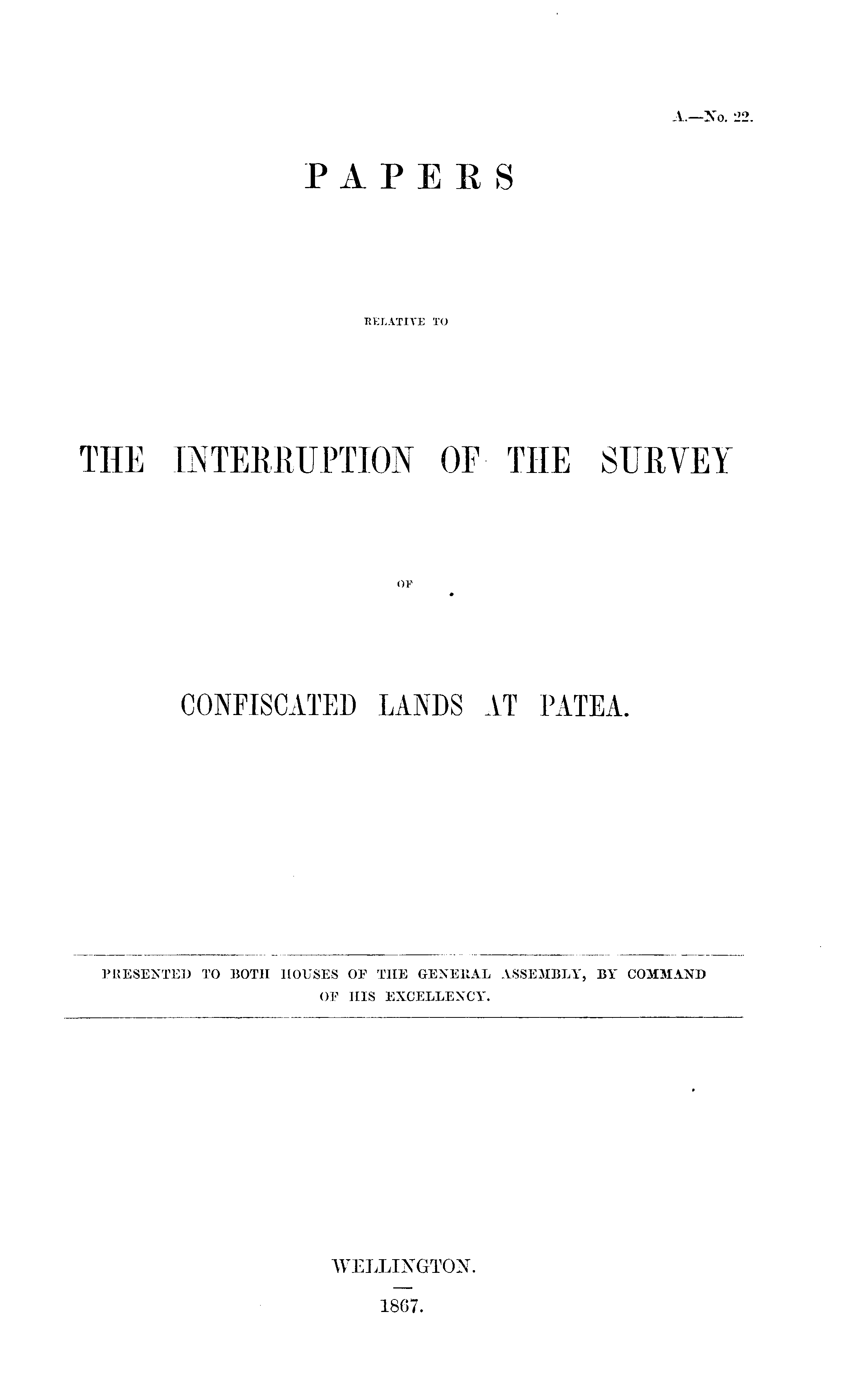 PAPERS RELATIVE TO THE INTERRUPTION OF THE SURVEY OF CONFISCATED LANDS AT PATEA.