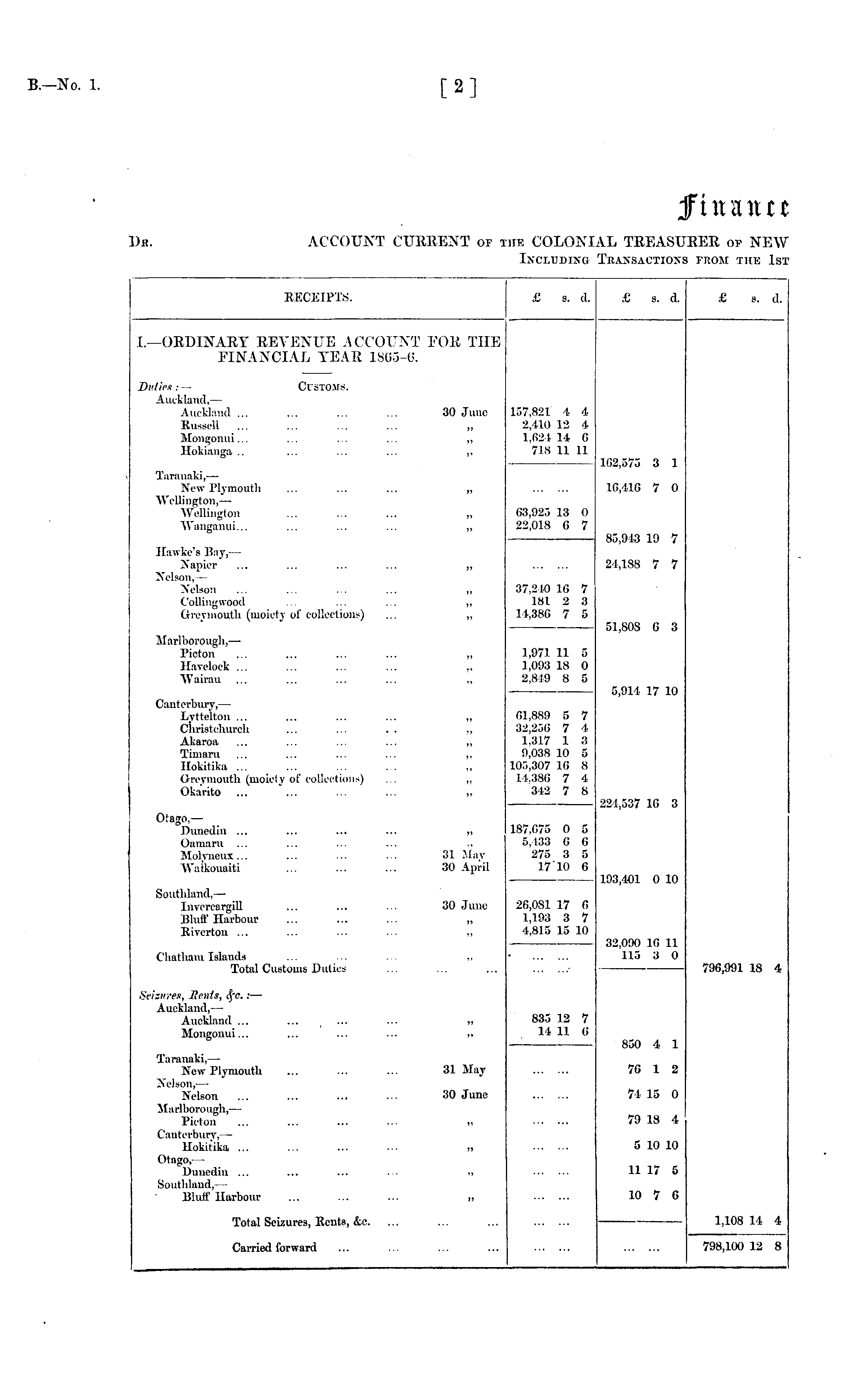 jfhunm Dr. ACCOUNT CURRENT of the COLONIAL TREASURER of NEW Including Transactions from the 1st RECEIPTS. £ s. d. £ s. d. £ ». d. I.—ORDINARY REVENUE ACCOUNT FOR THE FINANCIAL YEAR 1865-6. Vvtieif— Customs. A uckland, — Auckland ... ... ... ... 30 June RutseU ... Mongonui... ... ,.. ... ,, Hokianga .. ... ... ... ,, 157,821 4 4 2,410 12 4 1,624 14 6 718 11 11 Tiiranaki, — New Plymouth ... ... ... „ \Vellingtou,—. Wellington ... ... ... „ Wimgunui... ... ... ... ,, 162,675 3 1 16.41G 7 0 63,925 13 0 22,018 6 7 85,943 19 7 Haw|ce's Bay, — Napier ... ... ... ... „ Nelson, — Nelson ... ... ... ... „ Col^ngwood ... ... ... „ Cvreymouth (moiety of collections) ... „ 37.210 16 7 181 2 3 14,380 7 0 24,188 7 7 51.80S G 3 Marlboroogh, — Picton ... ... ... ... „ Havelock ... ... ... ... .. AYairau ... ... ... ... ,, 1,971 11 5 1,098 18 0 2,819 8 5 5,914 17 10 Canterbury, — liTttelton ... ... ... ... „ Christ church ... ... . . ,, Akaroa ... ... ... ... ,, Timaru ... ... ... ... ,, Hokitika ... Greymouth (moiety of collections) ... „ Okarito ... ... ... ... „ 61,889 5 7 32,256 7 4 1,317 1 8 0,038 10 5 105,307 16 8 14.386 7 4 342 7 8 Oiago. — Dunedin ... ... ... ... „ Oamaru ... ... ... ... ., Molyncux... ... ... ... 31 May Waikouuiti ... ... ... 30 April 221,537 1G 3 187.675 0 5 5,133 6 6 275 3 5 1710 6 103,401 0 10 Southland, — Invercargill ... ... ... 30 June Bluff Harbour ... ... ... „ Kiverton ... ... ... ... ,, 26,OS1 17 C, 1,193 3 7 4,815 15 10 32,090 16 11 115 3 0 Chatham Islands ... ... ... „ Total Customs Duties 796,991 18 4 Auckland, —■ Auckland ... ... ... ... >, Mongonui... ... ... ... ,. 835 12 7 14 11 6 Taranaki, — New Plymouth ... ... ... 31 May 850 4 1 7G 1 2 Nelson, — Nelson ... ... ... ... 30 June Marlboro ugh, — Picton ... ... ... ... ., Canterbury, — Hokitika ... ... ... ■■• ,» Otago,— Duuediu ... ... ... ... ,, Southland, — DliuT Harbour ... ... ... ,, 74 15 0 79 18 4 5 10 10 11 17 5 10 7 6 Total Seizures, Rents, &e. 1,108 14 4 Carried forward 798,100 12 8