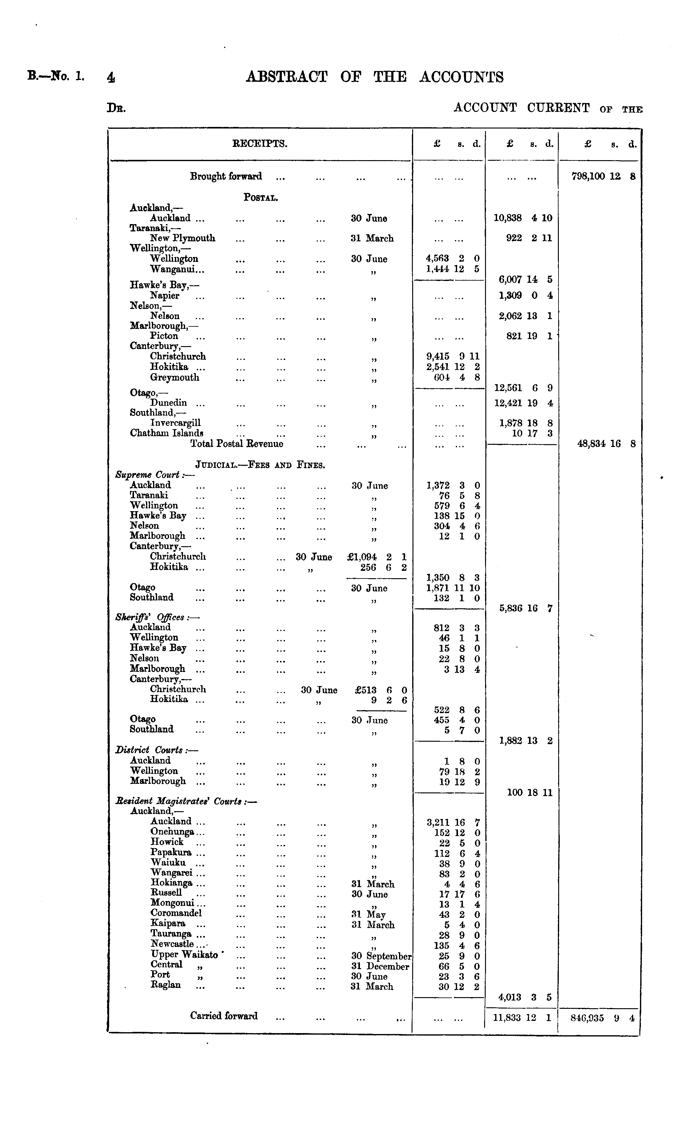In. ACC 'TJNT CUK :ENT of th: RECEIPTS. £ s. d. £ s. d. £ s. d. Brought forward 798,100 12 8 Postal. Auckland, — Auckland ... Taranaki, — New Plymouth Wellington,— Wellington Wanganui... 30 June 31 March 30 June 10,838 4 10 922 2 11 4,563 2 0 1,444 12 5 G,007 U 5 Hawke's Bay,— Napier Nelson, — Nelson Marlborough,— Picton Canterbury,— Christchurch Ilokitika ... Greymouth It )» J) )) 1,309 0 4 2,062 13 1 821 19 1 9,415 9 11 2,541 12 2 (iO4 4 8 12,561 6 9 Otago,— Dunedin ... Southland, — Invercargill Chatham Islands Total Postal Revenue H 12,421 19 4 1,878 18 8 10 17 3 48,831 1G 8 Judicial. —Fees and Fines. Supreme Court: — Auckland ... ... Taranaki Wellington Hawke's Bay ... Nelson Marlborough ... Canterbury,— Christchurch ... ... 30 June Hokitika ... ... ... „ 30 June £1.094 2 1 256 6 2 1,372 3 0 76 5 8 579 6 4 138 15 0 304 4 6 12 1 0 1,350 8 3 1,871 11 10 132 1 0 Otago Southland 30 June )1 Stterifs' Offices: — Auckland Wellington Hawke's Bay ... Nelson Marlborough ... Canterbury,— Christchureh ... ... 30 June Hokitika ... ... ... „ 3J )> £513 G 0 9 2 6 5,830 1G 7 812 3 3 46 1 1 15 8 0 22 8 0 3 13 4 Otago Southland 30 June 522 8 6 455 4 0 5 7 0 District Courts: — Auckland Wellington Marlborough 1,882 13 2 18 0 79 18 2 19 12 9 100 18 11 Resident Magistrates' Courts :— Auckland, — Auckland ... Onehunga... Howick Papakura ... Waiuku ... Wangarei ... Hokianga ... Russell Mongonui... Coromandel Kaipara Tauranga ... Newcastle...Upper Waikato ' Central „ Port „ ... ... ... Raglan )> ii )) 31 March 30 June 81 May 31 March )> 30 September 31 December 30 June 31 March 3,211 16 7 152 12 0 22 5 0 112 6 4 38 9 0 83 2 0 4 4 6 17 17 6 13 1 4 43 2 0 5 4 0 28 9 0 135 4 6 25 9 0 66 5 0 23 3 6 30 12 2 4,013 3 5 Carried forward 11,833 12 1 840,935 'J 4
