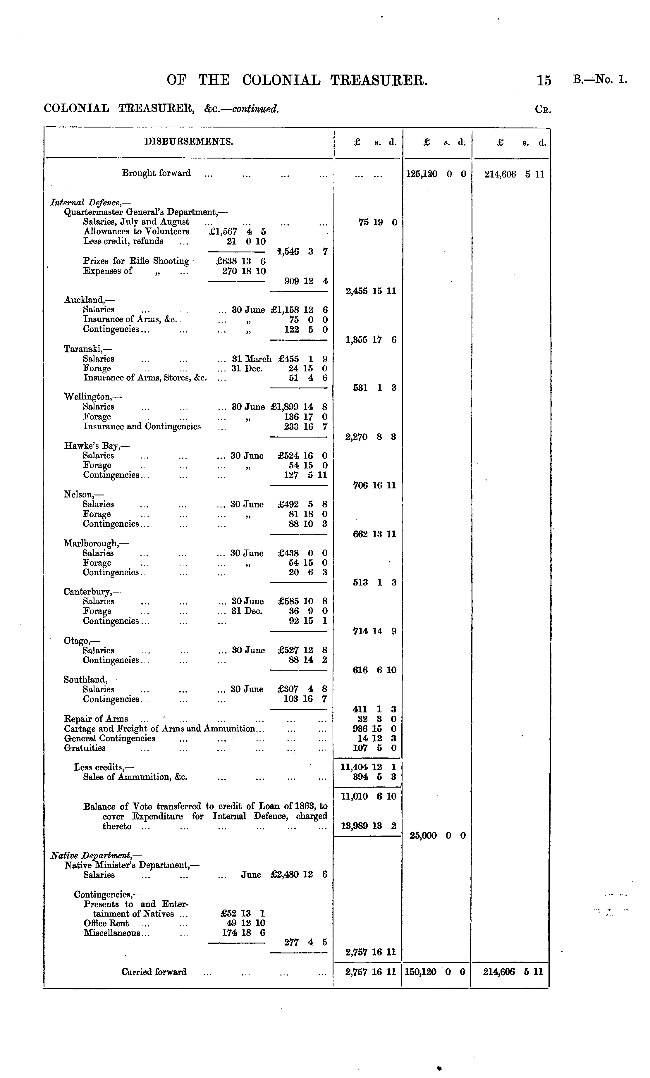 OLONIAL TEEASUEEE, &c— continued. Cb. DISBURSEMENTS. £ s. d. £ s. d. £ s. d, Brought forward 125,120 0 0 214,606 5 11 Internal Defence, — Quartermaster General's Department,— Salaries, July and August Allowances to Volunteers £1,507 4 5 Less credit, refunds ... 21 0 10 75 19 0 1,540 3 7 Prizes for Rifle Shooting £038 13 0 Expenses of „ ... 270 18 10 2,455 15 11 ■ 909 12 4 Auckland, — Salaries ... ... ... 30 June £1,158 12 6 Insurance of Arms, &c. ... ... „ 75 0 0 Contingencies... ... ... ,, 122 5 0 1,355 17 C Taranaki, — Salaries ... ... ... 31 March £455 1 9 Forage ... ... ... 31 Dee. 24 15 0 Insurance of Arms, Stores, &c. ... 51 4 6 531 1 3 Wellington,— Salaries ... ... ... 30 June £1,899 14 8 Forage ... ... ... „ 136 17 0 Insurance and Contingencies ... 233 16 7 2,270 8 3 Hawke's Bay,— Salaries ... ... ...30 June £524 16 0 Forage ... ... ... „ 54 15 0 Contingencies... ... ... 127 5 11 706 1G 11 Nelson, — Salaries ... ... ... 30 June £492 5 8 Forage ... ... ... „ 81 18 0 Contingencies... ... ... 88 10 3 662 13 11 Marlborough,— Salaries ... ... ... 30 June £438 0 0 Forage ... ... ... „ 54 15 0 Contingencies... ... ... 20 6 3 Canterbury, — Salaries ... ... ... 30 June £585 10 8 Forage ... ... ... 31 Dec. 36 9 0 Contingencies... ... ... 92 15 1 513 1 3 714 14 9 Otago,— Salaries ... ... ... 30 June £527 12 8 Contingencies... ... ... 88 14 2 616 6 10 Southland, — Salaries ... ... ... 30 June £307 4 8 Contingencies... ... ... 103 16 7 411 1 3 32 3 0 936 15 0 14 12 3 107 5 0 Repair of Arms Cartage and Freight of Arms and Ammunition... General Contingencies Gratuities Less credits, — Sales of Ammunition, &e. 11,404 12 1 394 5 3 Balance of Vote transferred to credit of Loan of 1863, to cover Expenditure for Internal Defence, charged thereto 11,010 6 10 13,989 13 2 25,000 0 0 Native Department, — Native Minister's Department, — Salaries ... ... ... June £2,480 12 6 Contingencies, — Presents to and Entertainment of Natives ... £52 13 1 Office Rent ... ... 49 12 10 Miscellaneous... ... 174 18 C 277 4 5 2,757 16 11 Carried forward 2,757 16 11 150,120 0 0 214,606 5 11