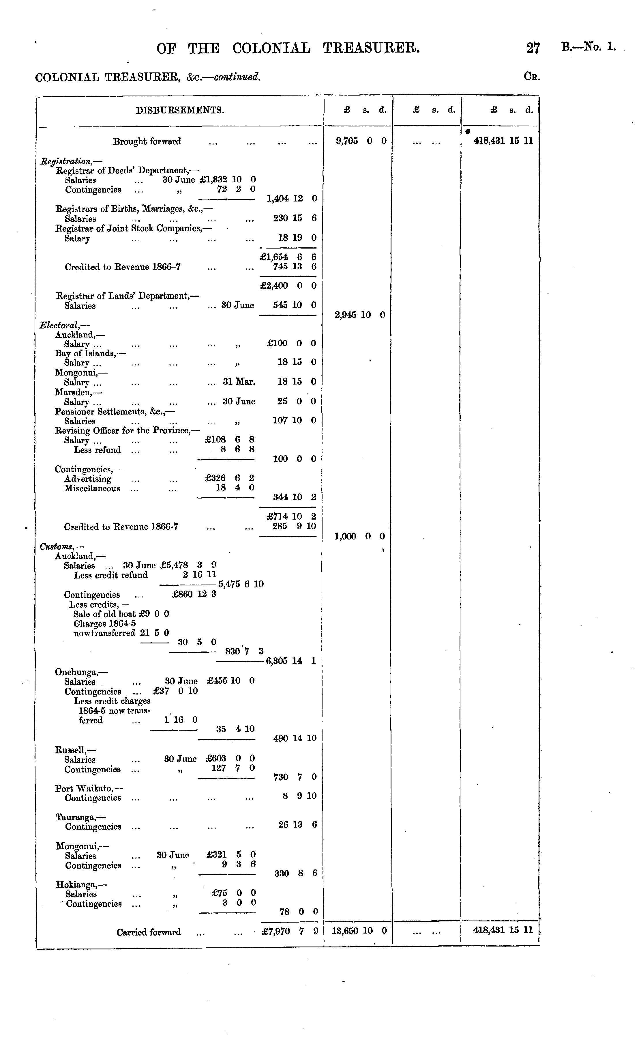 !0L0NIAL TEEASUK \, &c. — continue) DISBURSEMENTS. £ s. d. £ s. d. £ s. d. • Brought forward 9,705 0 0 418,431 15 11 Reg! strati on, — Registrar of Deeds' Department,— Salaries ... 30 June £1,832 10 0 Contingencies ... ,, 72 2 0 1,404 12 0 Registrars of Births, Marriages. See,, — Salaries ... ... ... ... 230 15 G Registrar of Joint Stock Companies, — Salary 18 19 0 £1,654 6 6 Credited to Revenue 1866-7 ... ... 745 13 6 £2,400 0 0 Registrar of Lands' Department, — Salaries ... ... ... 30 June 545 10 0 Electoral,— Auckland, — Salary... ... ... ... „ £100 0 0 Bay of islands, — Salary ... ... ... ... „ 18 15 0 Mongonui,— Salary... ... ... ... 31 Mar. 18 15 0 Marsden, — Salary... ... ... ... 30 June 25 0 0 Pensioner Settlements, &c, — Salaries ... ... ... „ 107 10 0 Revising Officer for the Province, —- Salary... ... ... £108 6 8 Less refund ... ... 868 2,945 10 0 100 0 0 Contingencies,— Advertising ... ... £326 6 2 Miscellaneous ... ... 18 4 0 ■ 344 10 2 £714 10 2 Credited to Revenue 1866-7 ... ... 285 9 10 1,000 0 0 Customs, — Auckland, — Salaries ... 30 June £5,478 3 9 Less credit refund 2 16 11 I 5,475 6 10 Contingencies ... £860 12 3 Less credits, — Sale of old boat £9 0 0 Charges 1804-5 nowtransferred 21 5 0 30 5 0 . 830 7 3 n oa» i4 i 6,305 14 1 .4 1 Onehunga, — Salaries ... 30 June £455 10 0 Contingencies ... £37 0 10 Less credit charges 1864-5 now transferred ... 1 16 0 . 35 4 10 490 14 10 Russell,— Salaries ... 30 June £603 0 0 Contingencies ... „ 127 7 0 730 7 0 Port Waikato,— Contingencies ... ... ... ... 8 9 10 Tauranga, — Contingencies ... ... ... ... 26 13 6 Mongonui, — Salaries ... 30 June £321 5 0 Contingencies ... ,, 9 3 6 330 8 6 Hokiauga, — Salaries ... „ £75 0 0 Contingencies ... ,, 3 0 0 78 0 0 Carried forward ... ... £7,970 7 9 13,650 10 0 418,131 15 11