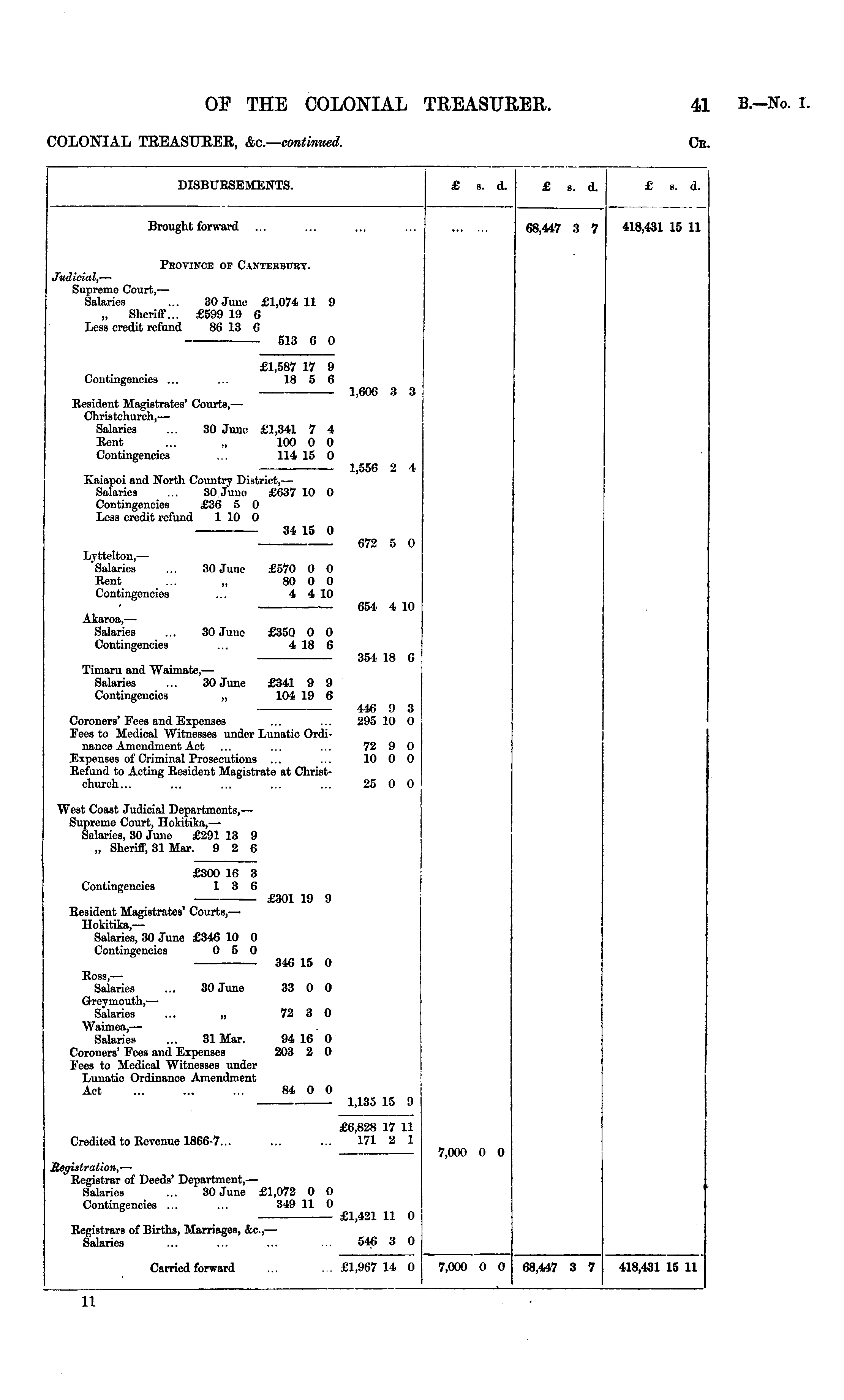 'OLONIAL TREASURES, &c— continued, Ce. DISBURSEMENTS. £ s. d. £ s. d. £ s. d. Brought forward 68,447 3 7 418,431 15 11 Province of Cantmibcby. Judicial, —■ Supremo Court, — Salaries ... 30 Juno £1,074 11 9 „ Sheriff... £599 19 6 less credit refund 86 13 6 ■ 513 6 0 £1,587 17 9 Contingencies ... ... 18 5 6 1,606 3 3 Resident Magistrates' Courts, — Chris tchurch, — Salaries ... 30 June £1,341 7 4 Rent ... „ 100 0 0 Contingencies ... 114 15 0 1,556 2 4 Kaiapoi and North Country District, — Salaries ... 30 Juno £637 10 0 Contingencies £36 5 0 Less credit refund 1 10 0 M 15 0 672 5 0 Lvttelton, — 'Salaries ... 30 June £570 0 0 Rent ... „ 80 0 0 Contingencies ... 4 4 10 — 654 4 10 Akaroa, — Salaries ... 30 June £350 0 0 Contingencies ... 4 18 6 351 18 6 Timaru and Waimate, — Salaries ... 30 June £341 9 9 Contingencies „ 104 19 6 416 9 3 Coroners' Fees and Expenses ... ... 295 10 0 Fees to Medical Witnesses under Lunatic Ordinance Amendment Act ... ... ... 72 9 0 Expenses of Criminal Prosecutions ... ... 1000 Refund to Acting Resident Magistrate at Christchurch... ... ... ... ... 25 0 0 West Coast Judicial Departments,— Supreme Court, Hokitika, — Salaries, 30 June £291 13 9 „ Sheriff, 31 Mar. 9 2 6 £300 16 3 Contingencies 1 3 G £301 19 9 Resident Magistrates' Courts, — Hokitika, — Salaries, 30 June £346 10 0 Contingencies 0 5 0 346 15 0 Ross,— Salaries ... 30 June 33 0 0 Groymouth,— Salaries ... „ 72 3 0 Waimca, — Salaries ... 31 Mar. 94 16 0 Coroners' Fees and Expenses 203 2 0 Fees to Medical Witnesses under Lunatic Ordinance Amendment Act ... ... ... 84 0 0 1,135 15 9 £6,828 17 11 Credited to Revenue 1866-7... ... ... 171 2 1 7,000 0 0 Registration, — Registrar of Deeds' Department,— Salaries ... 30 June £1,072 0 0 Contingencies ... ... 319 11 0 £1,421 11 0 Registrars of Births, Marriages, &c., — Salaries ... ... ... ... 546 3 0 Carried forward ... ..£1,967 14 0 7,000 0 0 68,447 3 7 418,431 15 11 11