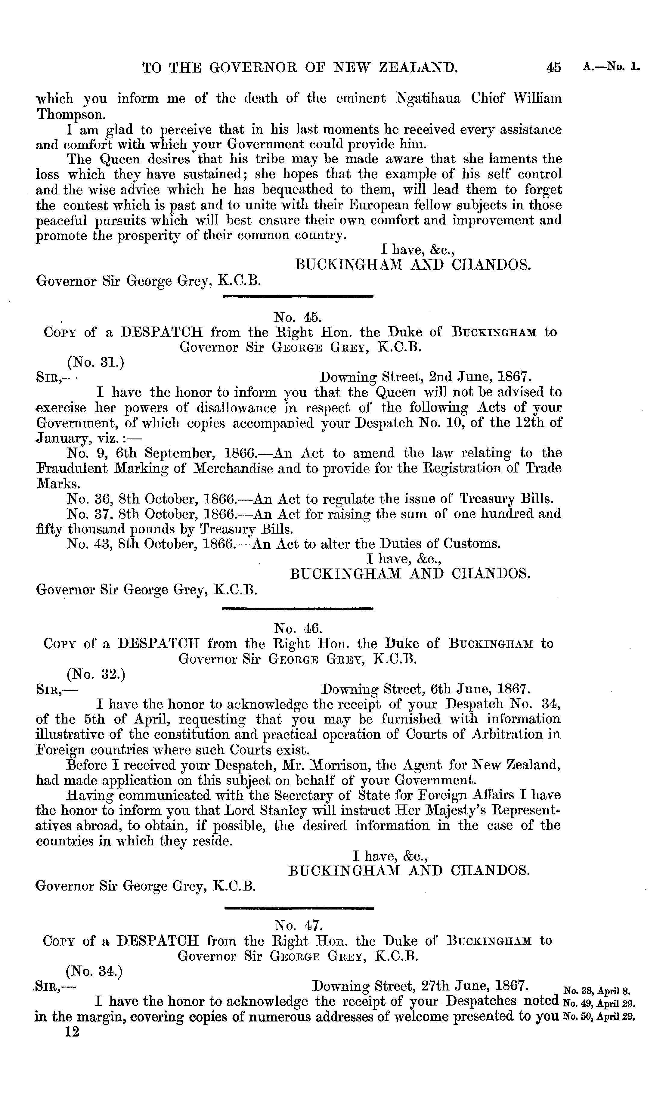 No. 45. Copy of a DESPATCH from the Right Hon. the Duke of Buckingham to Governor Sir George Grey, K.C.B. (No. 31.) Sir, — Downing Street, 2nd June, 1867. I have the honor to inform you that the Queen will not be advised to exercise her powers of disallowance in respect of the following Acts of your Government, of which copies accompanied your Despatch No. 10, of the 12th of January, viz.:— No. 9, 6th September, 1866. —An Act to amend the law relating to the Fraudulent Marking of Merchandise and to provide for the Registration of Trade Marks. No. 36, Bth October, 1866. —An Act to regulate the issue of Treasury Bills. No. 37. Bth October, 1866. —An Act for raising the sum of one hundred and fifty thousand pounds by Treasury Bills. No. 43, Bth October, 1866.—An Act to alter the Duties of Customs. I have, &c, BUCKINGHAM AND CHANDOS. Governor Sir George Grey, K.C.B.