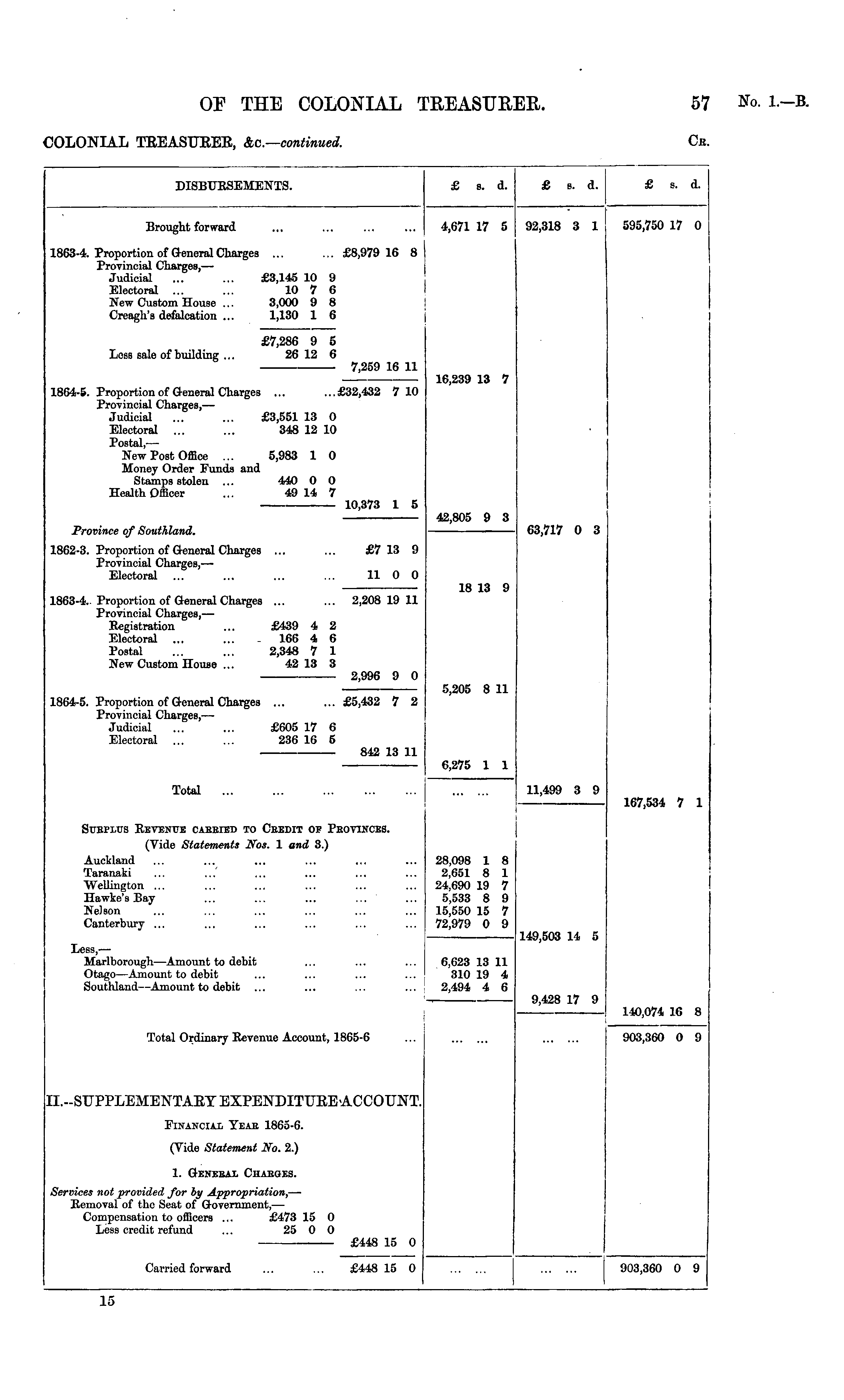 I0L0NLAL TREASURER, &c— continued. Cb. DISBURSEMENTS. £ s. d. £ s. d. £ s. d. Brought forward 4,671 17 5 92,318 3 1 595,750 17 0 1863-4. Proportion of General Charges ... ... £8,979 16 8 Provincial Charges,— Judicial ... ... £3,145 10 9 Electoral ... ... 10 7 6 New Custom House ... 3,000 9 8 Creagh's defalcation ... 1,130 1 6 £7,286 9 5 Lobs Bale of building ... 26 12 6 7,259 16 11 1864-5. Proportion of General Charges ... ...£32,432 7 10 Provincial Charges, — Judicial ... ... £3,551 13 0 Electoral ... ... 348 12 10 Postal, — New Post Office ... 5,983 1 0 Honey Order Funds and Stamps stolen ... 440 0 0 Health Officer ... 49 14 7 16,239 13 7 10,373 1 5 42,805 9 3 Province of Southland. 63,717 0 3 1862-3. Proportion of General Charges ... ... £7 13 9 Provincial Charges, — Electoral ... ... ... ... 11 0 0 1863-4. Proportion of General Charges ... ... 2,208 19 11 Provincial Charges,— Registration ... £439 4 2 Electoral ... ... 166 4 6 Postal ... ... 2,348 7 1 New Custom House ... 42 13 3 18 13 9 2,996 9 0 1864-5. Proportion of General Charges ... ... £5,432 7 2 Provincial Charges,— Judicial ... ... £605 17 6 Electoral ... ... 236 16 5 5,205 8 11 842 13 11 6,275 1 1 Total ... ... 11,499 3 9 167,534 7 1 Surplus Revenue carried to Credit op Provinces. (Vide Statements 2?os. 1 and 3.) 28,098 1 8 2,651 8 1 24,690 19 7 5,533 8 9 15,550 15 7 72,979 0 9 Auckland Taranaki Wellington ... Hawke's Bay Nelson Canterbury ... Less, — Marlborough —Amount to debit Otago —Amount to debit Southland —Amount to debit 149,503 14 5 6.623 13 11 310 19 4 2,494 4 6 9,428 17 9 Total Ordinary Revenue Account, 1865-6 140,074 16 8 903,360 0 9 II.--SUPPLEMENTARY EXPENDITURE ACCOUNT. Financial Year 1865-6. (Vide Statement No. 2.) 1. General Charges. Services not provided for by Appropriation, — Removal of the Seat of Government, — Compensation to officers ... £473 15 0 Less credit refund ... 25 0 0 £448 15 0 Carried forward ... ... £448 15 0 903,360 0 9 15