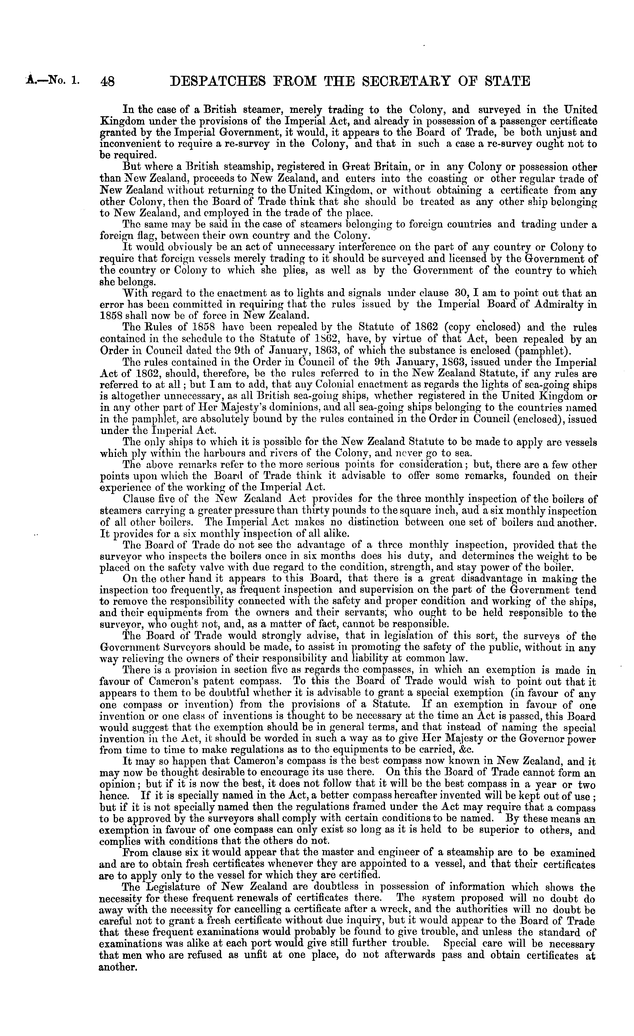 In the case of a British steamer, merely trading to tho Colony, and surveyed in the United Kingdom under the provisions of the Imperial Act, and already in possession of a passenger certificate granted by the Imperial Government, it would, it appears to the Board of Trade, be both unjust and inconvenient to require a re-survey in the Colony, aud that in such a case a re-survey ought not to be required. But where a British steamship, registered in Great Britain, or in any Colony or possession other than New Zealand, proceeds to New Zealand, and enters into the coasting or other regular trade of New Zealand without returning to the United Kingdom, or without obtaining a certificate from any other Colonv, then the Board of Trade think that she should bo treated as any other ship belonging to New Zealand, and employed in the trade of the place. The same may be said in the case of steamers belonging to foreign countries and trading under a foreign flag, between their own country and the Colony. It would obviously be an act of unnecessary interference on the part of any country or Colony to require that foreign vessels merely trading to it should be surveyed and licensed by the Government of the country or Colony to which she plies, as well as by the Government of the country to which she belongs. With regard to the enactment as to lights and signals under clause 30, I am to point out that an error has been committed in requiring that the rules issued by the Imperial Board of Admiralty in 1858 shall now be of force in New Zealand. Tho Eules of 1858 have been repealed by the Statute of 1862 (copy enclosed) and the rules contained in the schedule to the Statute of 1862, have, by virtue of that Act, been rej:ealed by an Order in Council dated the 9th of January, 1863, of which the substance is enclosed (pamphlet). The rules contained in the Order in Council of the 9th January, 1863, issued under the Imperial Act of 18G2, should, therefore, be the rules referred to in the New Zealand Statute, if any rules are referred to at all; but lam to add, that any Colonial enactment as regards the lights of sea-going ships is altogether unnecessary, as all British sea-going ships, whether registered in the United Kingdom or in any other part of Her Majesty's dominions, aud all sea-going ships belonging to the countries named in the pamphlet, are absolutely bound by the rules contained in the Order in Council (enclosed), issued under the Imperial Act. The only ships to which it is possible for the New Zealand Statute to be made to apply are vessels which ply within the harbours and rivers of the Colony, and never go to sea. The above remarks refer to the more serious points for consideration; but, there are a few other points upon which the Board of Trade think it advisable to offer some remarks, founded on their experience of the working of the Imperial Act. Clause five of the New Zealand Act provides for the three monthly inspection ofthe boilers of steamers carrying a greater pressure than thirty pounds to the square inch, aud a six monthly inspection of all other boilers. The Imperial Act makes no distinction between one set of boilers and another. It provides for a six monthly inspection of all alike. The Board of Trade do not see the advantage of a three monthly inspection, provided that the surveyor who inspects the boilers once in six months does his duty, and determines the weight to be placed on the safety valve with due regard to the condition, strength, and stay power of tho boiler. On the other hand it appears to this Board, that there is a great disadvantage in making the inspection too frequently, as frequent inspection and supervision on the part of the Government tend to remove the responsibility connected with the safety and proper condition and working of the ships, and their equipments from the owners and their servants; who ought to be held responsible to the surveyor, who ought not, and, as a matter of fact, cannot bo responsible. The Board of Trade would strongly advise, that in legislation of this sort, the surveys of tho Government Surveyors should be made, to assist in promoting the safety of the public, without in any way relieving the owners of their responsibility and liability at common law. There is a provision in section five as regards the compasses, in which an exemption is made in favour of Cameron's patent compass. To this the Board of Trade would wish to point out that it appears to them to be doubtful whether it is advisable to grant a special exemption (in favour of any one compass or invention) from the provisions of a Statute. If an exemption in favour of one invention or one class of inventions is thought to be necessary at the time an Act is passed, this Board would suggest that ihe exemption should be in general terms, and that instead of naming the special invention in the Act, it should be worded in such a way as to give Her Majesty or the Governor power from time to time to make regulations as to tho equipments to be carried, &c. It may so happen that Cameron's compass is the best compass now known in New Zealand, and it may now be thought desirable to encourage its use there. On this the Board of Trade cannot form an opinion ; but if it is now the best, it does not follow that it will be the best compass in a year or two hence. If it is specially named in the Act, a better compass hereafter invented will be kept out of use ; but if it is not specially named then the regulations framed under the Act may require that a compass to be approved by the surveyors shall comply with certain conditions to be named. By these means an exemption in favour of one compass can only exist so long as it is held to be superior to others, and complies with conditions that the others do not. From clause six it would appear that the master and engineer of a steamship are to be examined and are to obtain fresh certificates whenever they are appointed to a vessel, and that their certif