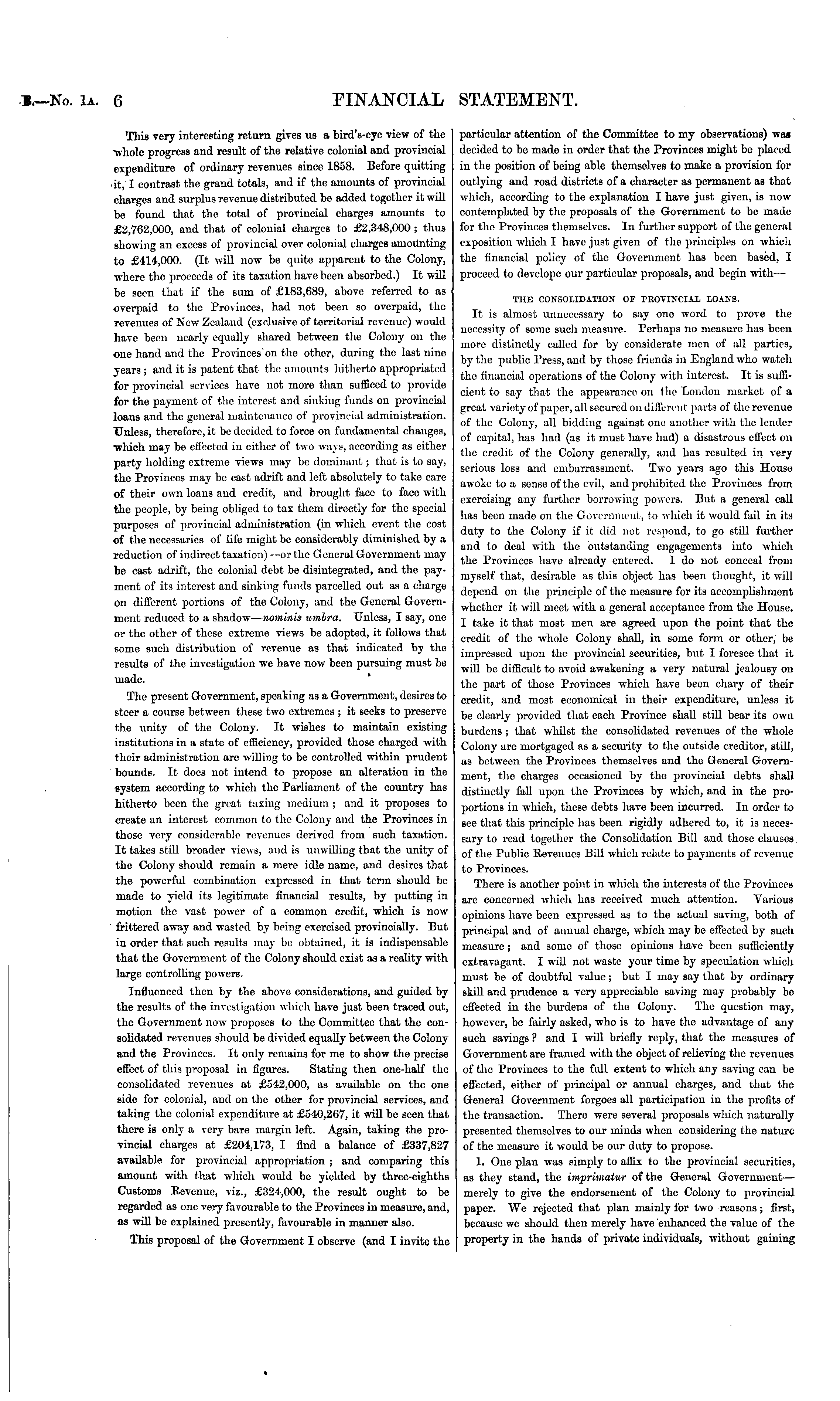 This very interesting return gives us a bird's-eye view of the particular attention of the Committee to my observations) wm ■whole progress and result of the relative colonial and provincial decided to be made in order that the Provinces might be placed expenditure of ordinary revenues since 1858. Before quitting in the position of being able themselves to make a provision for it, I contrast the grand totals, and if the amounts of provincial outlying and road districts of a character as permanent as that charges and surplus revenue distributed be added together it will which, according to the explanation I have just given, is now be found that the total of provincial charges amounts to contemplated by the proposals of the Government to be made £2,762,000, and that of colonial chai-ges to £2,348,000 ; thus for the Provinces themselves. In further support of the general showing an excess of provincial over colonial charges amounting exposition wliich I have just given of the principles on which to £414,000. (It will now be quite apparent to the Colony, the financial policy of the Government has been based, I where the proceeds of its taxation have been absorbed.) It will proceed to develope our particular proposals, and begin with— be seen that if the sum of £183,689, above referred to as ue scm man w«. buih , , tjie CONgoIIDATION or pkoviNCIAL LOANS. overpaid to the Provinces, had not been so overpaid, the _ . , . , r , , , . ~ It is almost unnecessary to say one word to prove the revenues of New Zealand (exclusive oi territorial revenue) would , . J J; , - - , , , necessity of some such measure. Perhaps no measure has been have been nearly equally shared between the Colony on the ~ ~ , ~ , . , ~ . ~ ~ J H J . , , . more distinctly called for by considerate men of all parties, one hand and the Provinceson the other, during the last nine , , ~. * ~ J .. ~ „ , , , , , b by the public Press, and by those friends m Lngland who watch years; and it is patent that the amounts hitherto appropriated ~ „ . , ~ „,, ~ , . i , . . , T , . „ J ' F m a -3 the financial operations of the Colony with interest. It is sufllfor provincial services have not more than sufficed to provide ... ~ ~, ~ T , , , j. * , - . . - cicnt to say that the appearance on the London market of a for the payment of the interest and sinking funds on provincial . , „ ~ .. ..„, ... r J , , . . . great vanetyof paper, all secured on diuVrcnt parts oi therevenue loans and the eener;il maintenance of provincial administration. „., „ , „,.,,. . , ... , . . h l . of the Colony, all bidding against one another with the lender Unless, therefore, it be decided to force on fundamental changes. - .. . , . , . .. . , , ~, ~ ~, . ' ""olc ' » 'of capital, has had (as it must have had) a disastrous effect on ■which may be effected in either of two ways, according as either , ,„ .., — , ~ , . .. . } . -. 6. the credit of the Colony generally, and has resulted in very Dartv holding extreme views may be dominant: that is to say, , , , , m ~ . „ l»ujr jiuiuui,, iii i ,T „, , serious loss and embarrassment. Two years ago this House the Provinces may be cast adnll and left absolutely to take care . , ... ~ 9 ~, ~ t .-, -r, P wu, j.iuv.iiv.c» may uv «»"u> j awoke to a sense of the evil, and prohibited the Provinces from of their own loans and credit, and brought face to face with . . . ~ , . t, , in v>* »uv & exercising any further borrowing powers. But a general call the people, by being obliged to tax them directly for the special , , , ~ _, ~ , ~ ....,.., f■ ' ' b b ~.,./ , has been made on the Government, to which it would fail in its purposes of provincial administration (in which event the cost , , ._ , „ . ~, , n] , , rl * . ~ ~,...,,, duty to the Colony it it did not respond, to go still further of the necessaries of life might be considerably diminished by a ' * j . JT^.-. ■ , ~ 7. . ~ , ° ' and to deal with the outstanding engagements into which reduction of indirect taxat.on)-or the General Government may ProTinceg ]iaTO already entered _ jdo not conceal from be cast adrift, the colonial debt be disintegrated, and the pay- mygelf ag objec( . ]mg been thought) ft ment of its interest and sinking funds parcelled out as a charge depend Qn the princip i e of the measure for its aeeompUshment on different portions of the Colony, and the General Govern- whether ft meet & general acceptance from the House _ ment reduced to a ahadow-nomims umbra. Unless, I say, one j tek(J i( . tha( . moat men are agreed upQn point &at fte or the other of these extreme views be adopted, it follows that credi( . of th(j whole Colony gha]]) some form or he some such distribution of revenue as that indicated by the impreaßed upon the proTincial securities, but I foresee that it results of the investigation we have now been pursuing must be d;fficulf . tQ avo;d awakening a very natural jealoußy on 111 the part of those Provinces which have been chary of their The present Government, speaking as a Government, desires to credit) and most econom i ca i i n their expenditure, unless it steer a course between these two extremes ;it seeks to preserve be clearly prov ia e d that each Province shall still bear its own the unity of the Colony. It wishes to maintain existing b ur( j cng . t h a t whilst the consolidated revenues of the whole institutions in a state of efficiency, provided those charged with Co i ony are mortgaged as a security to the outside creditor, still, their administration are willing to be controlled within prudent a 9 between the Provinces themselves and the General Governbounds. It does not intend to propose an alteration in the ment) t]le charges occasioned by the provincial debts shall system according to which the Parliament of the country has fall upon the Province's by which, and in the prohitherto been the great taxing medium ; and it proposes to port ; onß - m w hich, these debts have been incu