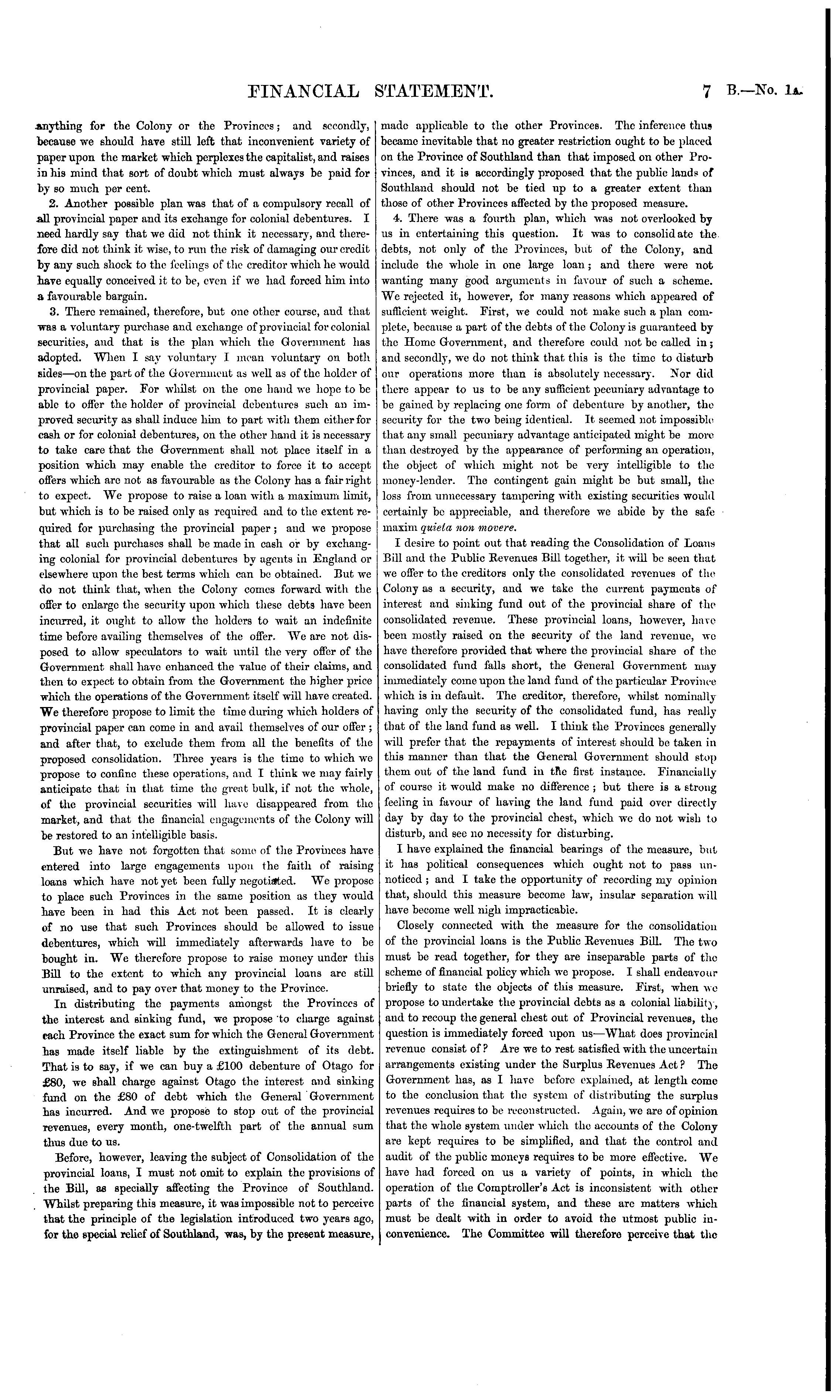 anything for the Colony or the Provinces; and secondly, made applicable to the other Provinces. The inference thus because we should have still left that inconvenient variety of became inevitable that no greater restriction ought to be placed paper upon the market which perplexes the capitalist, and raises on the Province of Southland than that imposed on other PromMs mind that sort of doubt which must always be paid for vinces, and it is accordingly proposed that the public lands of by so much per cent. Southland should not be tied up to a greater extent than 2. Another possible plan was that of a compulsory recall of those of other Provinces affected by the proposed measure. all provincial paper and its exchange for colonial debentures. I 4. There was a fourth plan, which was not overlooked by need hardly say that we did not think it necessary, and there- us in entertaining this question. It was to consolidate the fore did not think it wise, to run the risk of damaging our credit debts, not only of the Provinces, but of the Colony, and by any such shock to the feelings of the creditor which he would include the whole in one large loan ; and there were not have equally conceived it to be, even if we had forced him into wanting many good arguments in favour of such a scheme. a favourable bargain. We rejected it, however, for many reasons which appeared of 3. There remained, therefore, but one other course, and that sufficient weight. First, we could not make such a plan cornwas a voluntary purchase and exchange of proviucial for colonial plete, because a part of the debts of the Colony is guaranteed by securities, and that is the plan which the Government has the Home Government, and therefore could not be called in; adopted. When I say voluntary I mean voluntary on both and secondly, we do not think that this is the time to disturb sides —on the part of the Government as well as of the holder of our operations more than is absolutely necessary. Nor did provincial paper. For whilst on the one hand we hope to be there appear to us to be any sufficient pecuniary advantage to able to offer the holder of provincial debentures such an im- be gained by replacing one form of debenture by another, the proved security as shall induce him to part with them either for security for the two being identical. It seemed not impossible casli or for colonial debentures, on the other hand it is necessary that any small pecuniary advantage anticipated might be more to take care that the Government shall not place itßelf in a than destroyed by the appearance of performing an operation, position which may enable the creditor to force it to accept the object of which might not be very intelligible to the offers which are not as favourable as the Colony has a fair right money-lender. The contingent gain might be but small, the to expect. We propose to raise a loan with a maximum limit, loss from unnecessary tampering with existing securities would but which is to be raised only as required and to the extent re- certainly be appreciable, and therefore we abide by the safe quired for purchasing the provincial paper ; and we propose maxim quiela non movere. that all Buch purchases shall be made in cash or by exchang- I desire to point out that reading the Consolidation of Loans ing colonial for provincial debentures by agents in England or Bill and the Public Revenues Bill together, it will be seen that elsewhere upon the best terms which can bo obtained. But we we offer to the creditors only the consolidated revenues of the do not think that, when the Colony comes forward with the Colony as a security, and we take the current payments of offer to enlarge the security upon which these debts have been interest and sinking fund out of the provincial share of the incurred, it ought to allow the holders to wait an indefinite consolidated revenue. These provincial loans, however, lmve time before availing themselves of the offer. We are not dis- been mostly raised on the security of the land revenue, we posed to allow speculators to wait until the very offer of the have therefore provided that where the provincial share of the Government shall have enhanced the value of their claims, and consolidated fund falls short, the General Government may then to expect to obtain from the Government the higher price immediately come upon the land fund of the particular Province which the operations of the Government itself will have created, which is in default. The creditor, therefore, whilst nominally We therefore propose to limit the time during which holders of having only the security of the consolidated fund, has really provincial paper can come in and avail themselves of our offer ; that of the land fund as well. I think the Provinces generally and after that, to exclude them from all the benefits of the will prefer that the repayments of interest should be taken in proposed consolidation. Three years is the timo to which wo this manner than that the General Government should stop propose to confine these operations, and I tlu'nk we may fairly them out of the land fund in tfie first instance. Financially anticipate that in that time the great bulk, if not the whole, of course it would make no difference ; but there is a strong of the provincial securities will have disappeared from the feeling in favour of having the land fund paid over directly market, and that the financial engagements of the Colony will day by day to the provincial chest, winch we do not wish to be restored to an intelligible basis. disturb, and see no necessity for disturbing. But we have not forgotten that some of the Provinces have I have explained the financial bearings of the measure, but entered into large engagements upon the faith of raising it has political consequences wliich ought not to pass unloans which have not yet been fully negotiated. Wo propose noticed ; and I take the opportunity of recording my opinion to place Buch Provinces in 