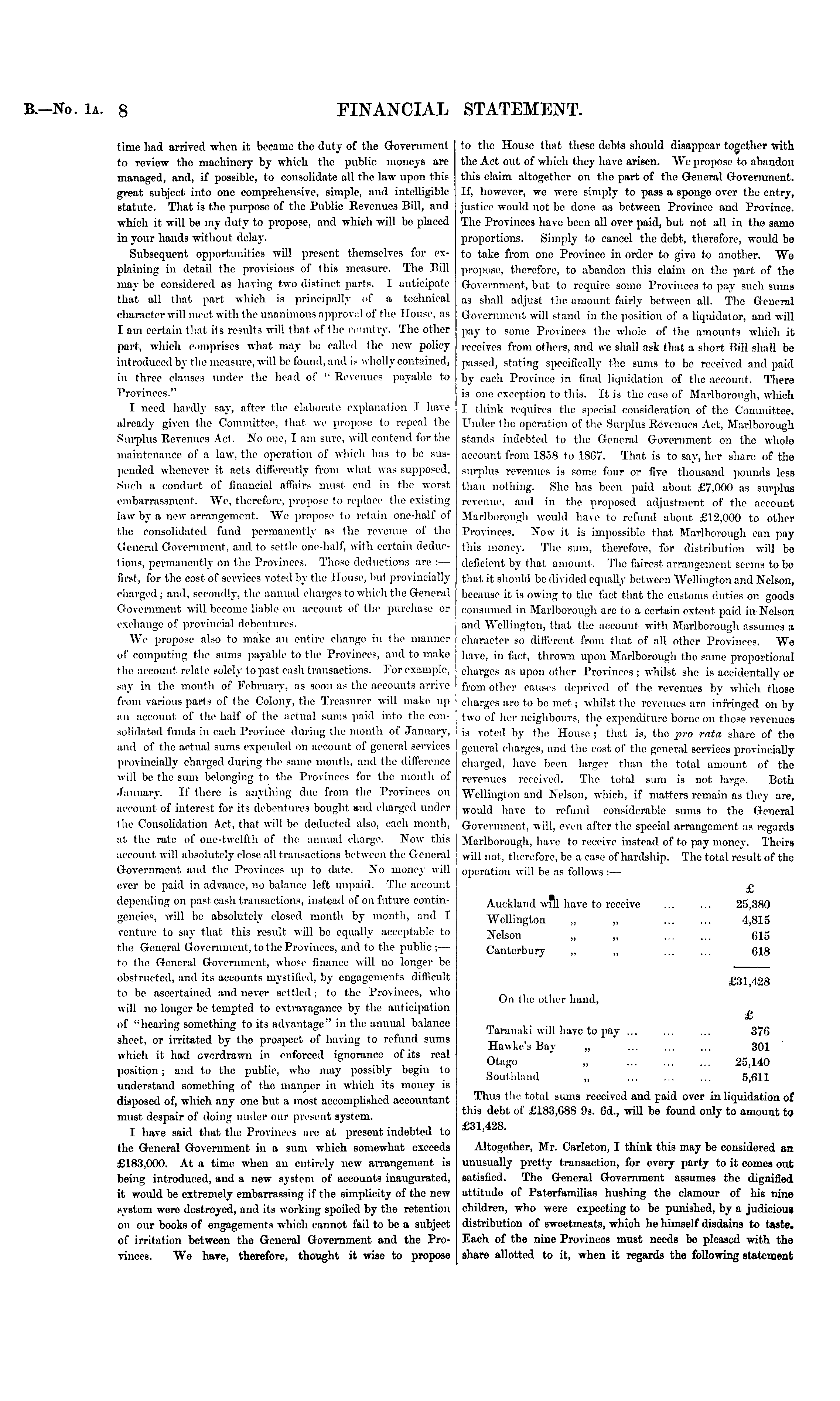 time had arrived when it became the duty of the Government to the House that these debts should disappear together with I o review the machinery by which the public moneys are the Act out of which they have arisen. We propose to abandon managed, and, if possible, to consolidate all the law upon this this claim altogether on the part of the Q-eneral G-overnment. great subject into one comprehensive, simple, and intelligible If, however, we were simply to pass a sponge over the entry, statute. That is the purpose of the Public Revenues Bill, and justice would not be done as between Provinco and Province, which it will be my duty to propose, and which will be placed The Provinces have been all over paid, but not all in the samo in your hands without delay. proportions. Simply to cancel the debt, therefore, would bo Subsequent opportunities will present themselves for ex- to take from one Province in order to give to another. We plaining in detail the provisions of this measure. The Bill propose, therefore, to abandon this claim on the part of the may be considered as having two distinct parts. I anticipate Government, but to require some Provinces to pay such sums that all that part which is principally of a technical a s shall adjust the amount fairly between all. The General character will meet with the unanimous approval of the House, as Government will stand in the position of a liquidator, and will lam certain that its results will that of the country. The other pay to some Provinces the whole of the amounts which it part, which comprises what may bo called the new policy receives from others, and we shall ask that a short Bill shall be introduced by the measure, will be found, and is wholly contained, passed, stating specifically the sums to be received and paid in three clauses under the head of " Revenues payable to by each Province in final liquidation of the account. There Provinces." is one exception to this. It is the case of Marlborough, which I need hardly say, after the elaborate explanation I have I think requires the special consideration of the Committee, already given the Committee, that we propose to repeal the Under the operation of the Surplus Revenues Act, Marlborough Surplus Revenues Act. No one, lam sure, will contend for the stands indebted to the General Government on the whole maintenance of a law, the operation of winch has to be sua- account from 1858 to 1867. That is to say, her share of the ponded whenever it acts differently from what was supposed, surplus revenues is some four or five thousand pounds less Siidi a conduct of financial affairs must end in the worst than nothing. She has been paid about £7,000 as surplus embarrassment. We, therefore, propose to replace the existing revenue, and in the proposed adjustment of the account law by a new arrangement. We propose to retain one-half of Marlborough would have to refund about £12,000 to other the consolidated fund permanently as the revenue of the Provinces. Now it is impossible that Marlborough can pay General Government, and to settle one-half, with certain deduc- this money. The sum, therefore, for distribution will be t ions, permanently on the Provinces. Those deductions are : — deficient by that amount. The fairest arrangement seems to be first, for the cost of services voted by the House, but provincially that it should be divided equally between Wellington and Nelson, charged; and, secondly, the annual charges to which the General because it is owing to the fact that the customs duties on goods Government will become liable on account of the purchase or consumed in Marlborough are to a certain extent paid in-Nelson exchange of provincial debentures. and Wellington, that the account with Marlborough assumes a We propose also to make SO entire change in the manner character so different from that of all other Provinces. We of computing the sums payable to the Provinces, and to make have, in fact, thrown upon Marlborough the same proportional the account relate solely to past cash transactions. For example, charges as upon other Provinces; whilst she is accidentally or Bay in the month of February, as soon as the accounts arrive f rO m other causes deprived of the revenues by which those from various parts of the Colony, the Treasurer will make up charges are to be met; whilst the revenues are infringed on by ;n i account of the half of the actual sums paid into the con- two of her neighbours, the expenditure borne on those revenues soli dated funds in each Province during the month of January, ; s voted by the House;' that is, the pro rata share of the and of the actual sums expended on account of general services general charges, and the cost of the general services provincially provincinlly charged during the same mouth, and the difference charged, have been larger than the total amount of the will be the sum belonging to_ the Provinces for the month of revenues received. The total sum is not large. Both January. If there is anything due from the Provinces on Wellington and Nelson, which, if matters remain as they are, account of interest for its debentures bought and charged under wou ia have to refund considerable sums to the General the Consolidation Act, that will be deducted also, each month, Government, will, even after the special arrangement as regards at the rate of one-twelfth of the annual charge Now this Marlborough, have to receive instead of to pay money. Theirs account will absolutely close all transactions between the General will not, therefore, be a case of hardship. The total result of the Government and the Provinces up to date. No money will operation will be as follows: — ever be paid in advance, no balance left unpaid. The account £ depending on past cash transactions, instead of on future contin- Auckland wfll have to receive 25 380 gencics, will be absolutely closed month by month, and I Wellington 4 815 venture to say that this result will be equally acceptable to