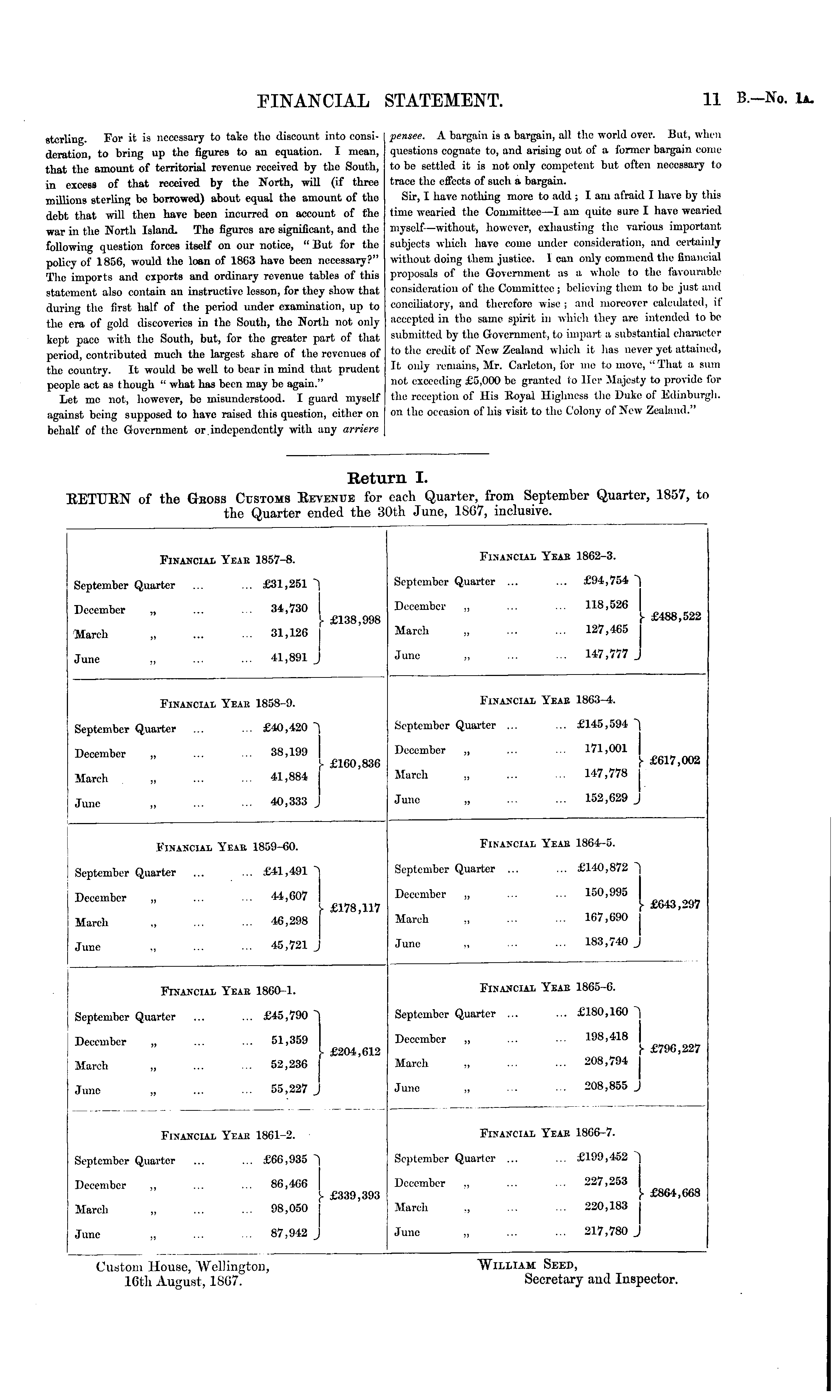 Return I. RETURN of the GROSS CUSTOMS REVENUE for each Quarter, from September Quarter, 1857, to the Quarter ended the 30th June, 1867, inclusive.