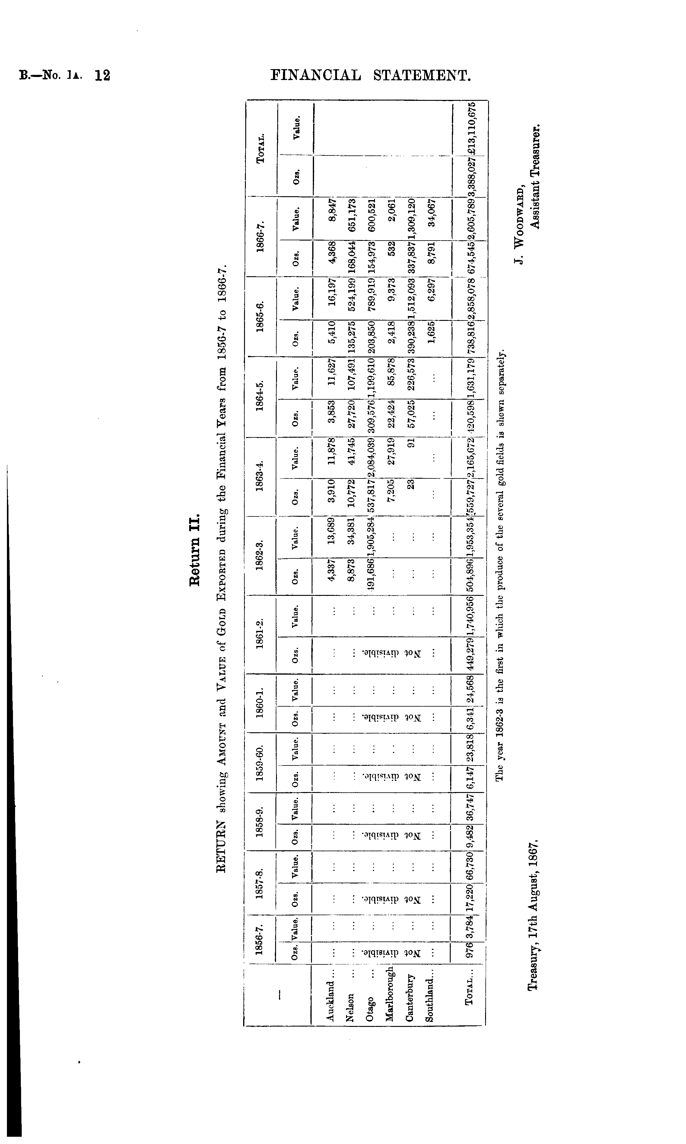 1856-7. 1857-8. 1858-9. 1859-60. 1860-1. 1861-2. 1862-3. 1863-4. 1864-5. 1865-6. 1866-7. ToTAt. Ozs. Valu Auckland Value. Ozs. Value. Ozs. | I Value. 029. Value. Ozs. Value. Ozs. Value. Ozs. Value. I Ozs. Value. Oza. Value. Ok. Value. Ozs. Value. Ozs. Value. 4,337 13,689 3,910 11,878 3,853 11,627 5,410 16,197 4,368 8,847 Nelson 8,873 34,381 10,772 41,745 27,720 107,491 135,275 524,199 168,044 651,173 ... Otago ... 3 1 'm to •3 I I ■p I I 4 491,686 1,905,284 537,817 2,084,039 309,576 1,199,610 203,850 789,919 154,973 600,521 .2 Marlborough .& 7,205 27,919 22,424 85,878 2,418 9,373 532 2,061 Canterbury "o 1 o m 23 91 57,025 226,573 390,238 1,512,093 337,837 1,309,120 Southland 1,625 6,297 8,791 34,067 Total... 976 3,7* | 976 3,784 17,220 66,730 9,482 36,747 6,147 23,818 6,341 24,568 449,279 1,740,956 504,896 1,631,179 738,816 i ,2,858,078 674,545 3,388,027 £13,110,675 1,953,354 £559,727 2,165,672 420,598 2,605,789 1 I The year 1862-3 is the first in which the produce of the several gold fields is shewn separately. J. "WOODWAED, Treasui , 17th August, 1867, Assistant Treasurer.