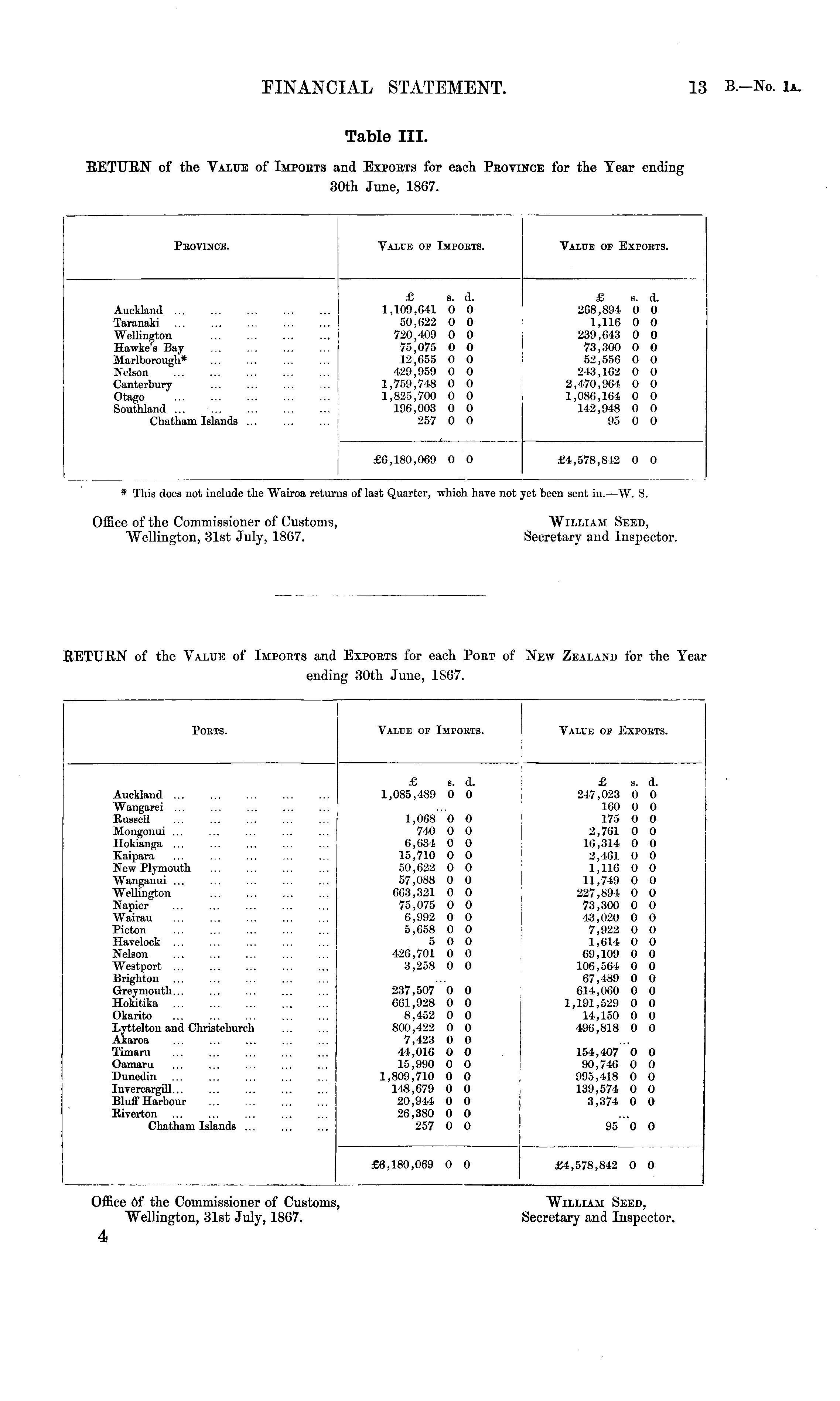 Poets. Value of Imports. Value of Exports. Auckland ... Wangarei Kussell Mongonui ... Hokianga ... Kaipara New Plymouth Wangimui ... Wellington Napier Wairau Picton Havelock ... Nelson Wentport ... Brighton Grey mouth... Hokitika Okarito Lyttelton and Christchureh Akaroa Timaru Oamaru Dunedin Inyercargill... Bluff Harbour Kiverton Chatham Islands ... £ s. d. 1,085,489 0 0 1,068 0 0 740 0 0 6,634 0 0 15,710 0 0 50,622 0 0 57,088 0 0 6G3,321 0 0 75,075 0 0 6,992 0 0 5,658 0 0 5 0 0 426,701 0 0 3,258 0 0 237,507 0 0 661,928 0 0 8,452 0 0 800,422 0 0 7,423 0 0 44,016 0 0 15,990 0 0 1,809,710 0 0 148,679 0 0 20,944 0 0 26,380 0 0 257 0 0 £ s. a. 247,023 0 0 160 0 0 175 0 0 2,761 0 0 16,314 0 0 8,461 0 0 1,116 0 0 11,749 0 0 227,894 0 0 73,300 0 0 43,020 0 0 7,922 0 0 1,614 0 0 69,109 0 0 106,504 0 0 67,4#9 0 0 614,060 0 0 1,191,529 0 0 14,150 0 0 496,818 0 0 154,407 0 0 90,746 0 0 095,418 0 0 139,574 0 0 3,374 0 0 95 0 0 £6,180,069 0 0 £4,578,842 0 0 Office of the Commissioner of Customi "Wellington, 31st July, 1867. "William Seed, Secretary and Inspector. 4