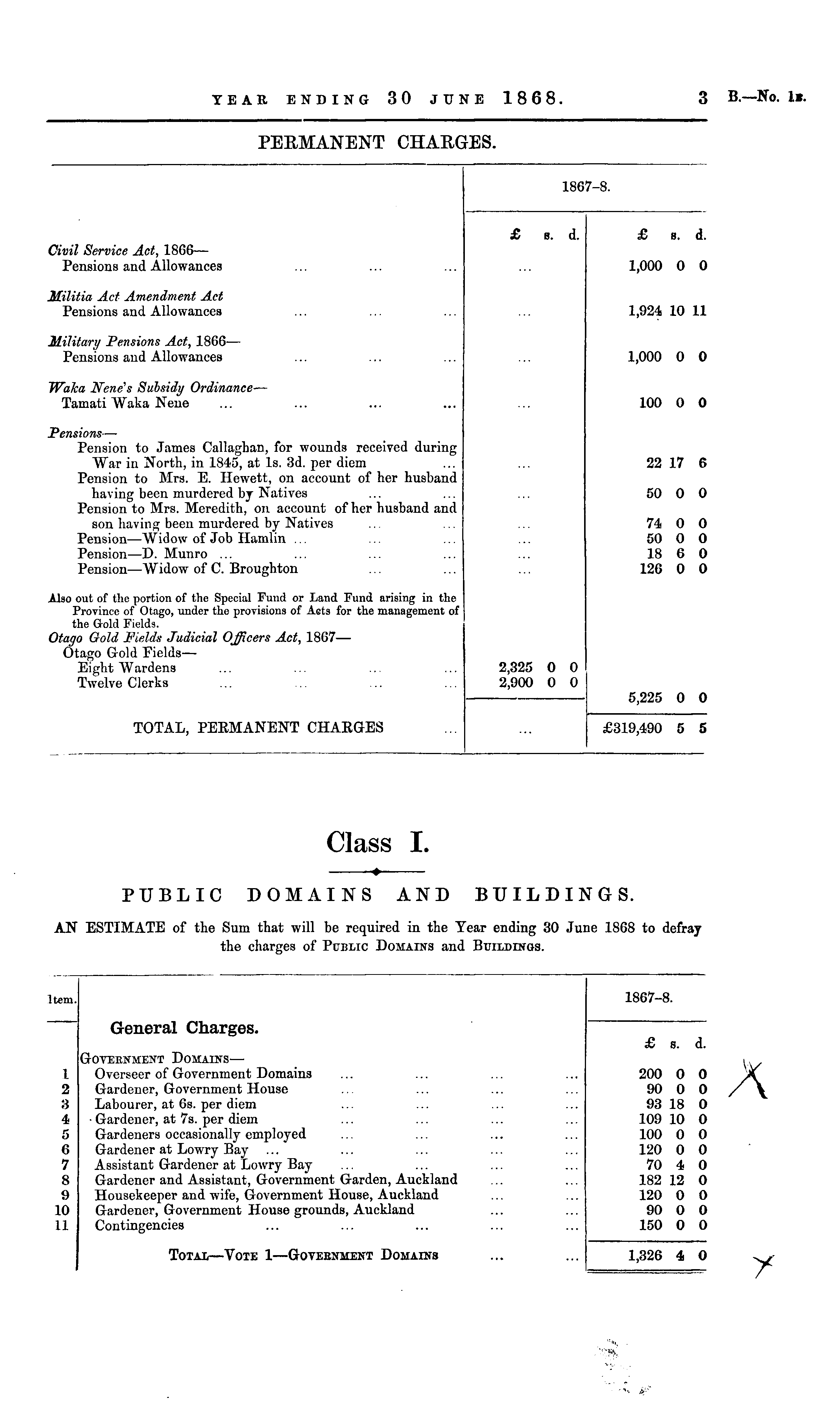 lass PUBLIC DOMAINS AND BUILDINGS. AN ESTIMATE of the Sum that will be required in the Year ending 30 June 1868 to defray the charges of Public Domains and Buildings. Item. 1867-8. General Charges. GOYEKNMENT DOMAINS— Overseer of Government Domains Gardener, Government House Labourer, at 6s. per diem Gardener, at 7s. per diem Gardeners occasionally employed Gardener at Lowry Bay Assistant Gardener at Lowry Bay Gardener and Assistant, Government Garden, Auckland Housekeeper and wife, Government House, Auckland Gardener, Government House grounds, Auckland Contingencies £ s. d. 1 2 8 ■i 5 6 7 s 9 li 200 0 90 0 93 18 109 10 100 0 120 0 70 4 182 12 120 0 90 0 150 0 0 0 0 0 0 0 0 0 0 0 0 Total—Vote 1 —Goyebnment Domains 1,326 4 0