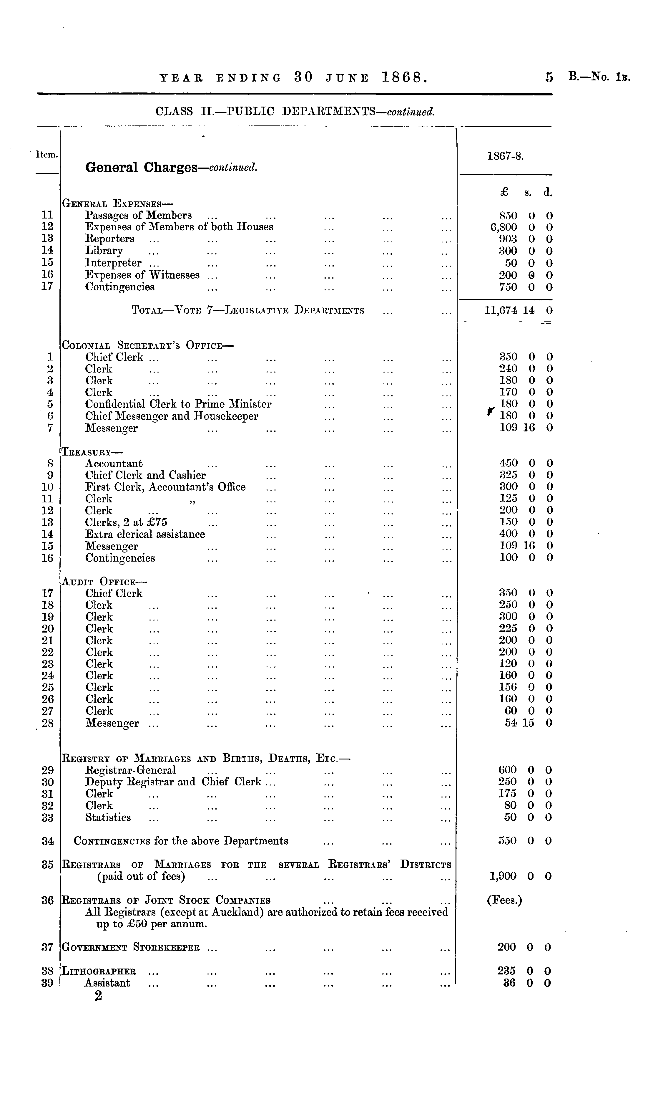 CLASS II.—PUBLIC DEPARTMENTS— continued. Item. General Charges— continued. 1S67-8. General Expenses— Passages of Members Expenses of Members of both Houses Reporters Library Interpreter ... Expenses of AV rituesses ... Contingencies £ s. a. 11 12 18 11 L5 L6 17 850 0,800 903 300 50 200 750 0 0 0 0 0 0 0 0 0 0 0 0 0 0 Total —Vote 7 —Legislative Departments 11,674 14 0 i 2 3 I. 5 (5 7 Colonial Secretary's Office— Chief Clerk ... Clerk Clerk Clerk Confidential Clerk to Prime Minister Chief Messenger and Housekeeper Messenger 350 0 240 0 180 0 170 0 0 180 0 109 16 0 0 0 0 0 0 0 S 9 10 11 12 L8 II. 15 L6 Treasury— Accountant Chief Clerk and Cashier First Clerk, Accountant's Office Clerk Clerk Clerks, 2 at £75 Extra clerical assistance Messenger Contingencies 450 0 325 0 300 0 125 0 200 0 150 0 400 0 109 16 100 0 0 0 0 0 0 0 0 0 0 17 18 19 20 21 22 23 24 25 26 27 28 Audit Office— Chief Clerk ... ... ... • ... Clerk Clerk Clerk Clerk Clerk Clerk Clerk Clerk Clerk Clerk Messenger ... 350 0 250 0 300 0 225 0 200 0 200 0 120 0 160 0 156 0 160 0 60 0 54 15 0 0 0 0 0 0 0 0 0 0 0 0 29 80 81 82 83 Registry of Marriages and Births, Deaths, Etc.— Registrar- General Deputy Registrar and Chief Clerk ... Clerk Clerk Statistics 600 0 250 0 175 0 80 0 50 0 0 0 0 0 0 84 Contingencies for the above Departments 550 0 0 ;35 Registrars of Marriages for the several Registrars' Districts (paid out of fees) 1,900 0 0 36 Registrars of Joint Stock Companies All Registrars (except at Auckland) are authorized to retain fees received up to £50 per annum. (Fees.) Government Storekeeper ... 200 0 0 37 38 39 Lithographer ... Assistant 2 235 0 36 0 0 0