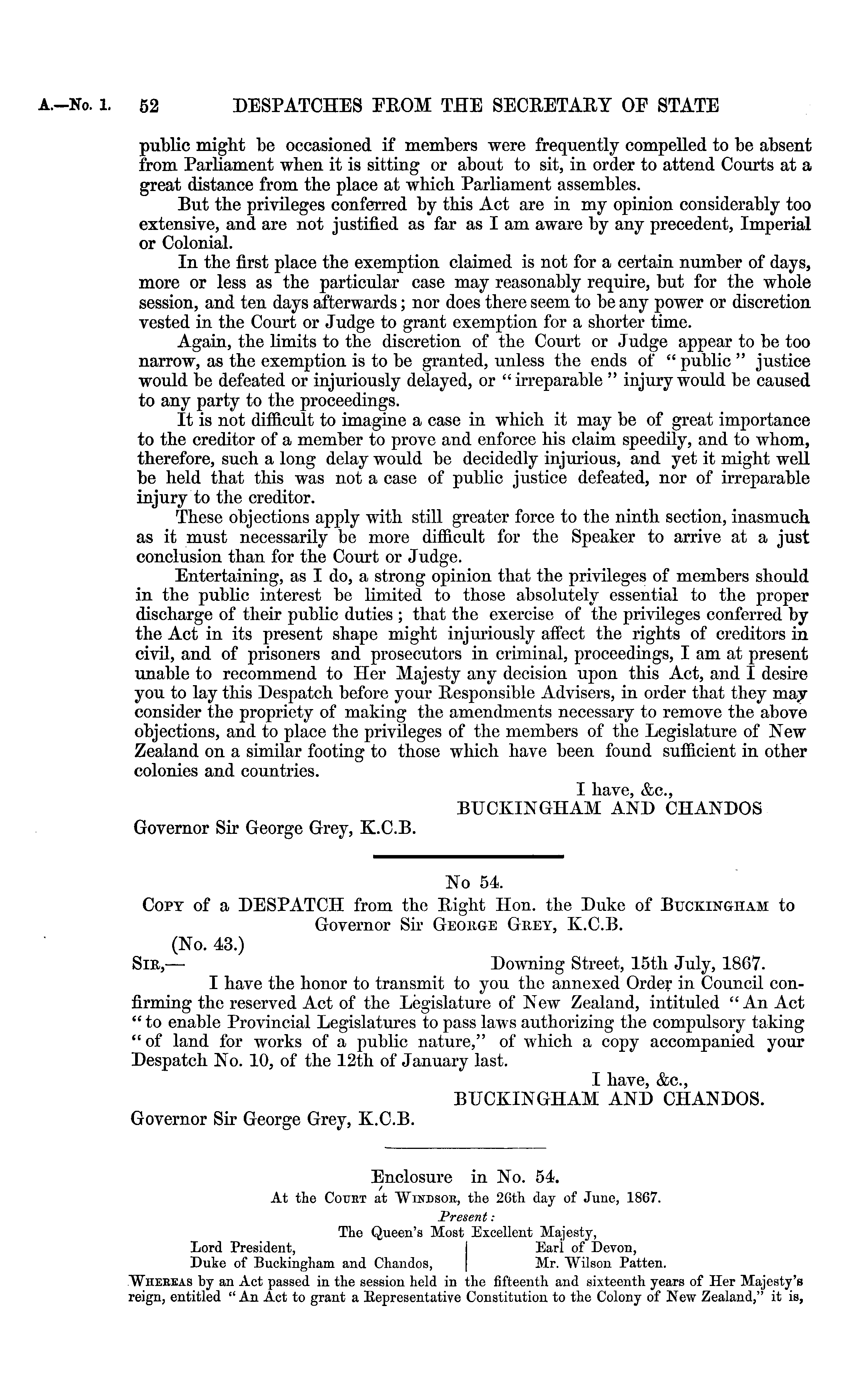Enclosure in No. 54. At the Court at "Windsor, the 26th day of June, 1867. Present : The Queen's Most Excellent Majesty, Lord President, Earl of Devon, Duke of Buckingham and Chandos, Mr. Wilson Patten. Wheeeas by an Act passed in the session held in the fifteenth and sixteenth years of Her Majesty's reign, entitled " An Act to grant a Representative Constitution to the Colony of New Zealand," it is,