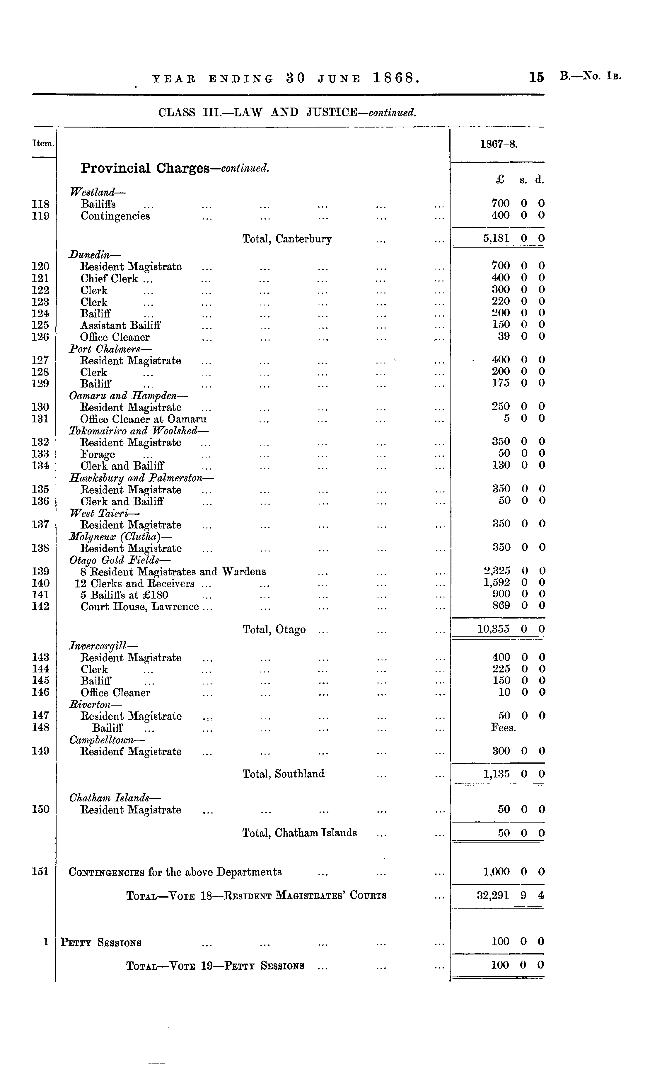 CLASS III.—LAW AND JUSTICE— continued. Item. 1807-8. Provincial Charges— continued. Westland — Bailiffs Contingencies £ s. d. 118 119 700 400 0 0 0 0 Total, Canterbury 5,181 0 0 120 121 122 123 124 125 126 127 128 129 130 181 132 133 131 Dvnedin— Resident Magistrate Chief Clerk ... Clerk Clerk Bailiff Assistant Bailiff Office Cleaner Port Chalmers — Resident Magistrate ... ... ... .. • ' Clerk Bailiff Oamaru and Sampden — Resident Magistrate Office Cleaner at Oamaru Tohomairiro and Woolshed — Resident Magistrate Forage Clerk and Bailiff Hawksbury and Palmerston — Resident Magistrate Clerk and Bailiff West Taieri — Resident Magistrate filolyneux (Clutlui) — Resident Magistrate Otago Gold Fields— 8 Resident Magistrates and Wardens 12 Clerks and Receivers ... 5 Bailiffs at £180 Court House, Lawrence ... 700 400 300 220 200 150 39 400 200 175 250 5 350 50 130 0 0 0 0 0 0 0 0 0 0 0 0 0 0 0 0 0 0 0 0 0 0 0 0 0 0 0 0 0 0 135 136 350 50 0 0 0 0 137 350 0 0 138 350 0 0 139 140 141 142 2,325 1,592 900 869 0 0 0 0 0 0 0 0 Total, Otago ... 10,355 0 0 143 144 145 146 invercarrjiU — Resident Magistrate Clerk Bailiff Office Cleaner Svoerton — Resident Magistrate Bailiff Oampbelltown — Resident' Magistrate 400 225 150 10 0 0 0 0 0 0 0 0 147 148 50 Fees. 0 0 149 300 0 0 Total, Southland 1,135 0 0 Chatham Islands — Resident Magistrate 150 50 0 0 Total, Chatham Islands 50 0 0 151 Contingencies for the above Departments 1,000 0 0 Total—Vote IS—Resident Magistrates' Courts 32,291 9 4 Petty Sessions 100 0 0 Total —Vote 19 —Petty Sessions ... 100 0 0